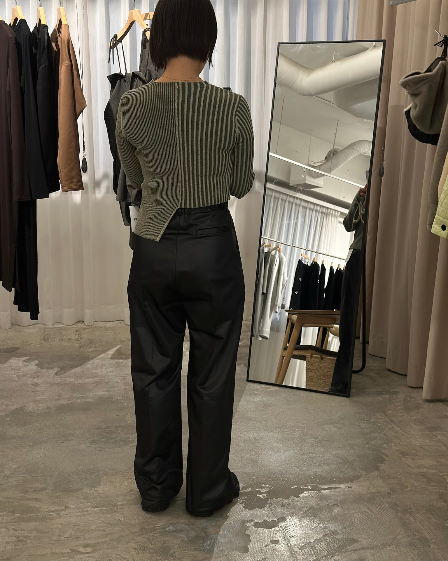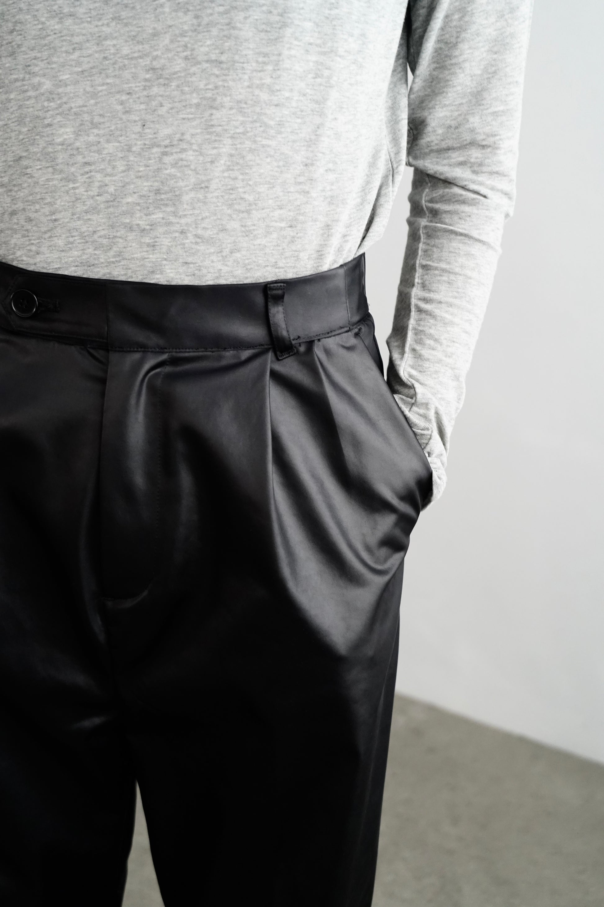 エコレザーを使用したストレートパンツ。
