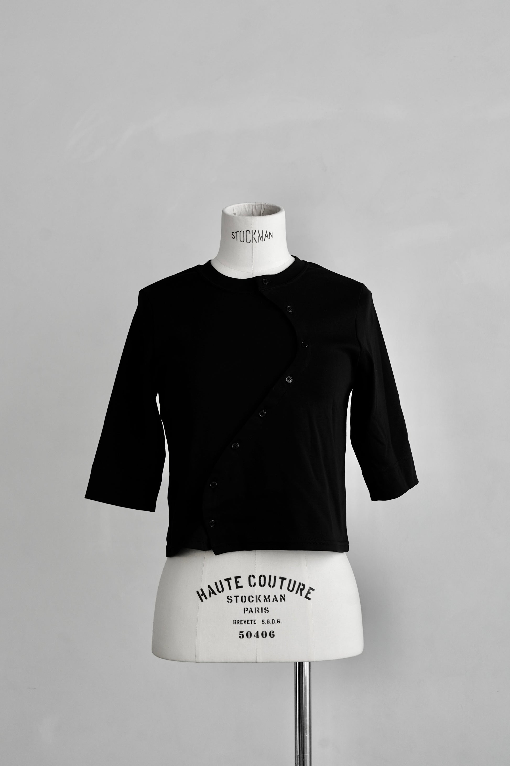 フロントのアシンメトリーなボタンデザインがシンプルながらも印象的で、スタイリングの主役になれるアイテムです。
