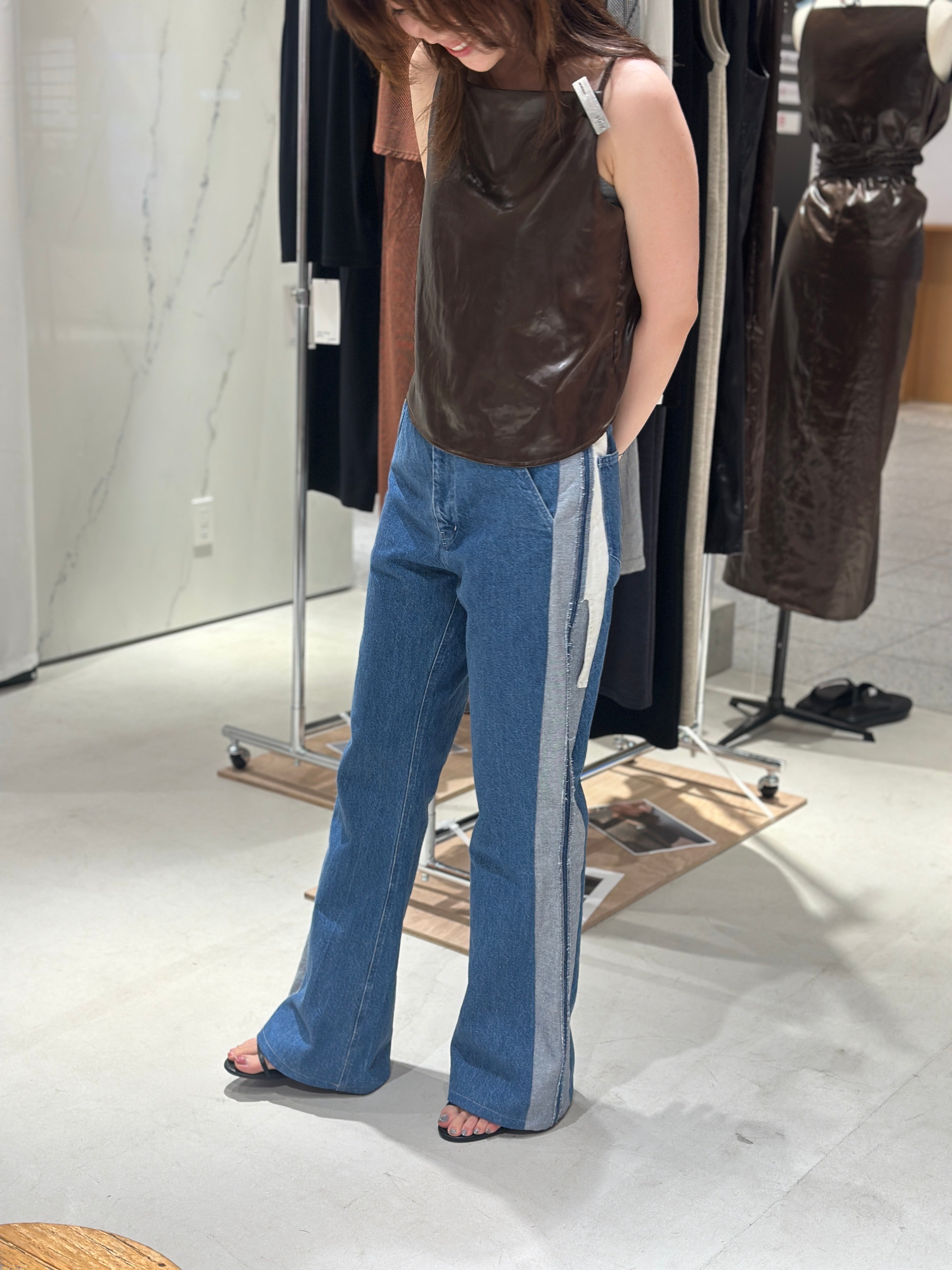 光沢を放つ、フェイクレザー素材のキャミソールが登場です。