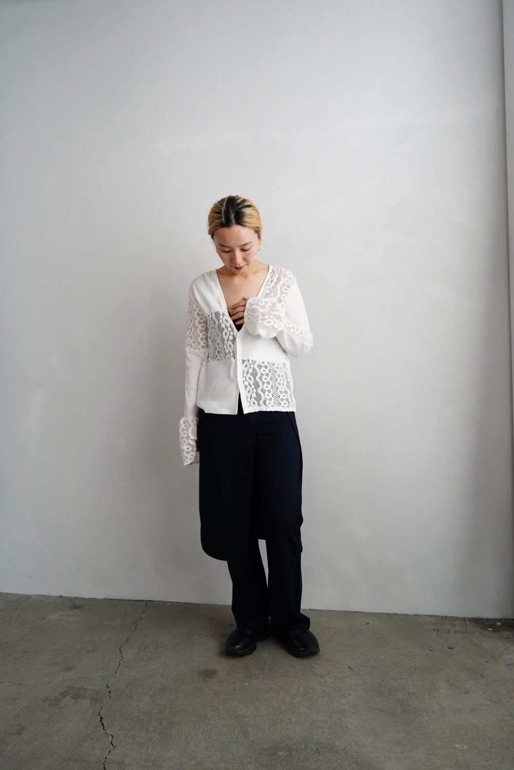 袖口や身頃に施したレースが軽やかな抜け感をプラスし、フェミニンで上品な印象に。フレアスリーブのシルエットもポイントです。