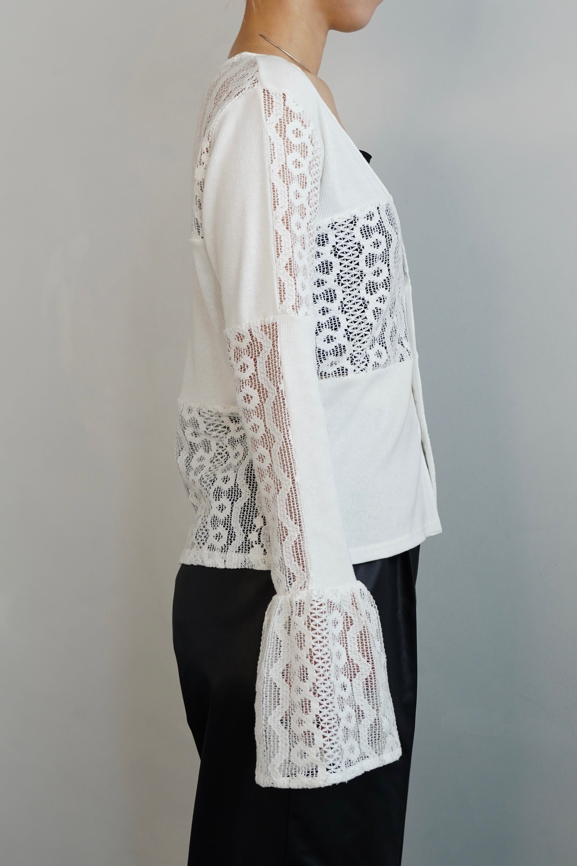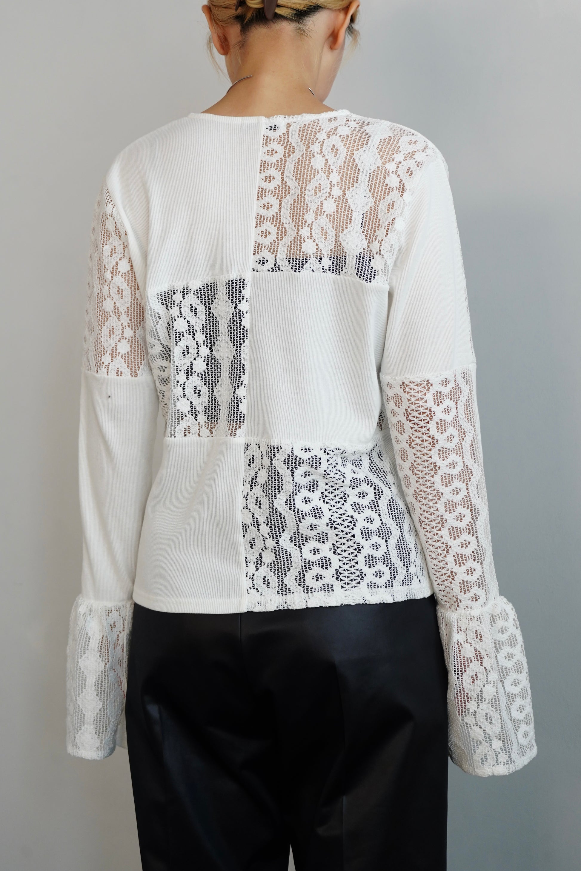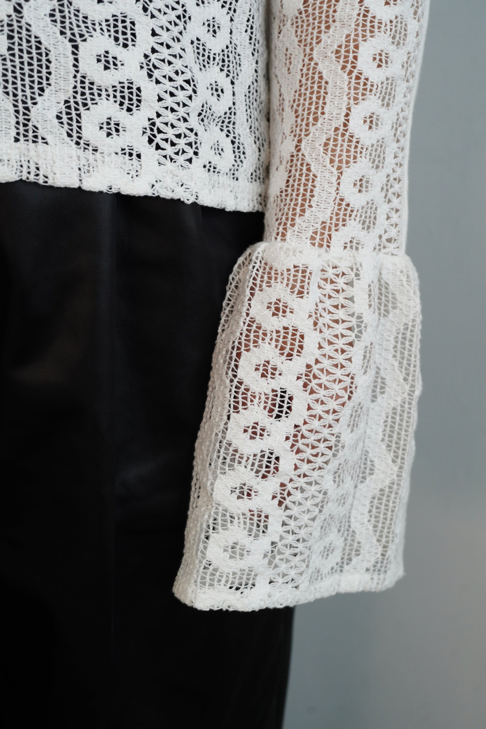 袖口や身頃に施したレースが軽やかな抜け感をプラスし、フェミニンで上品な印象に。フレアスリーブのシルエットもポイントです。