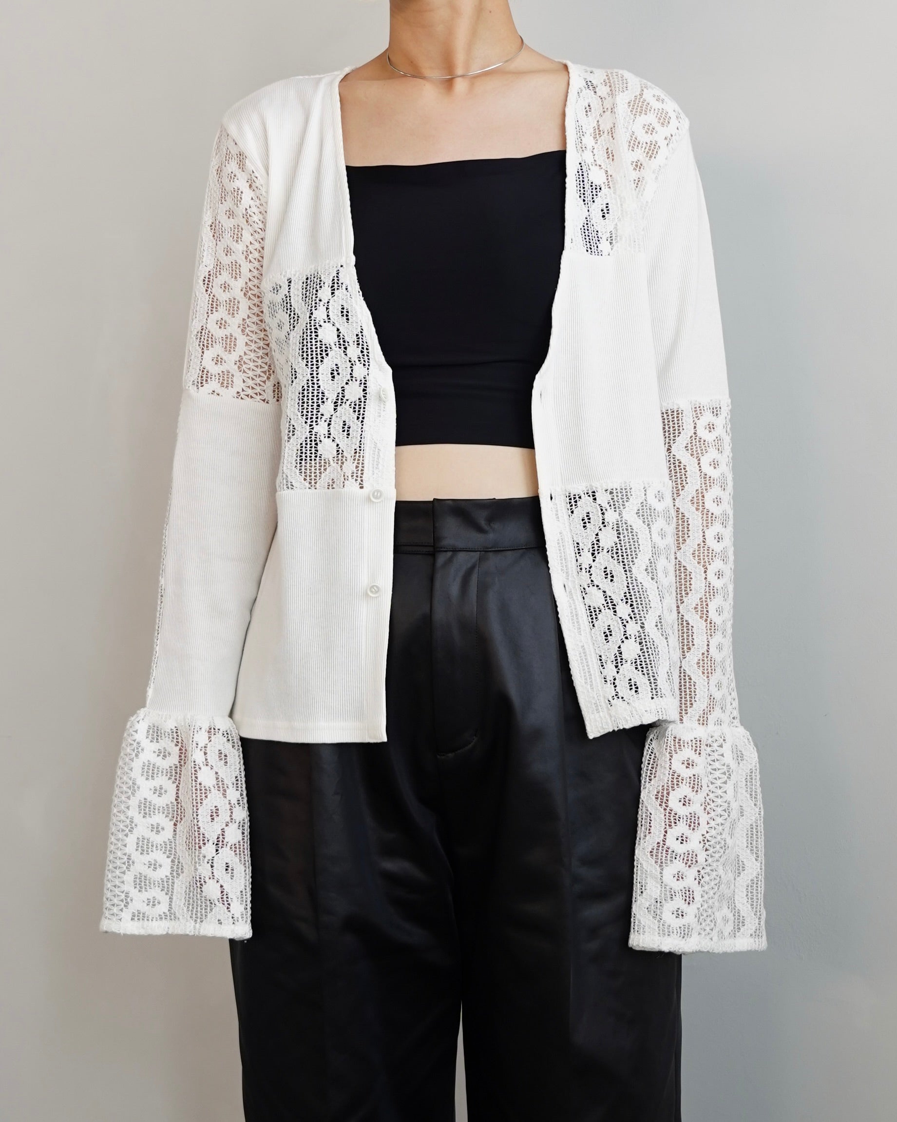 柔らかく肌なじみの良い生地に、透け感のあるレース生地を切り替えてデザインしたカーディガンをつくりました。
