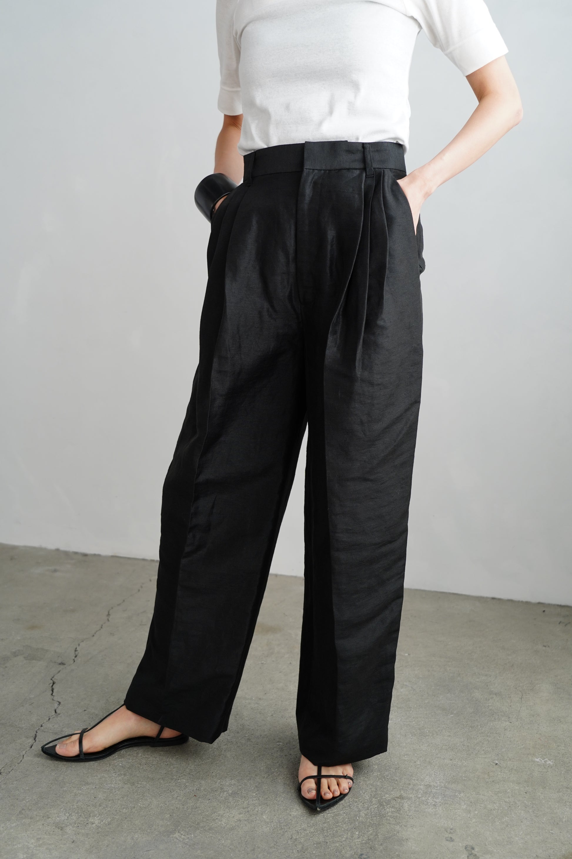 シルクのような光沢を持つヴィスコースと、リネンのナチュラルな表情を掛け合わせた特別な素材で製作したパンツです。