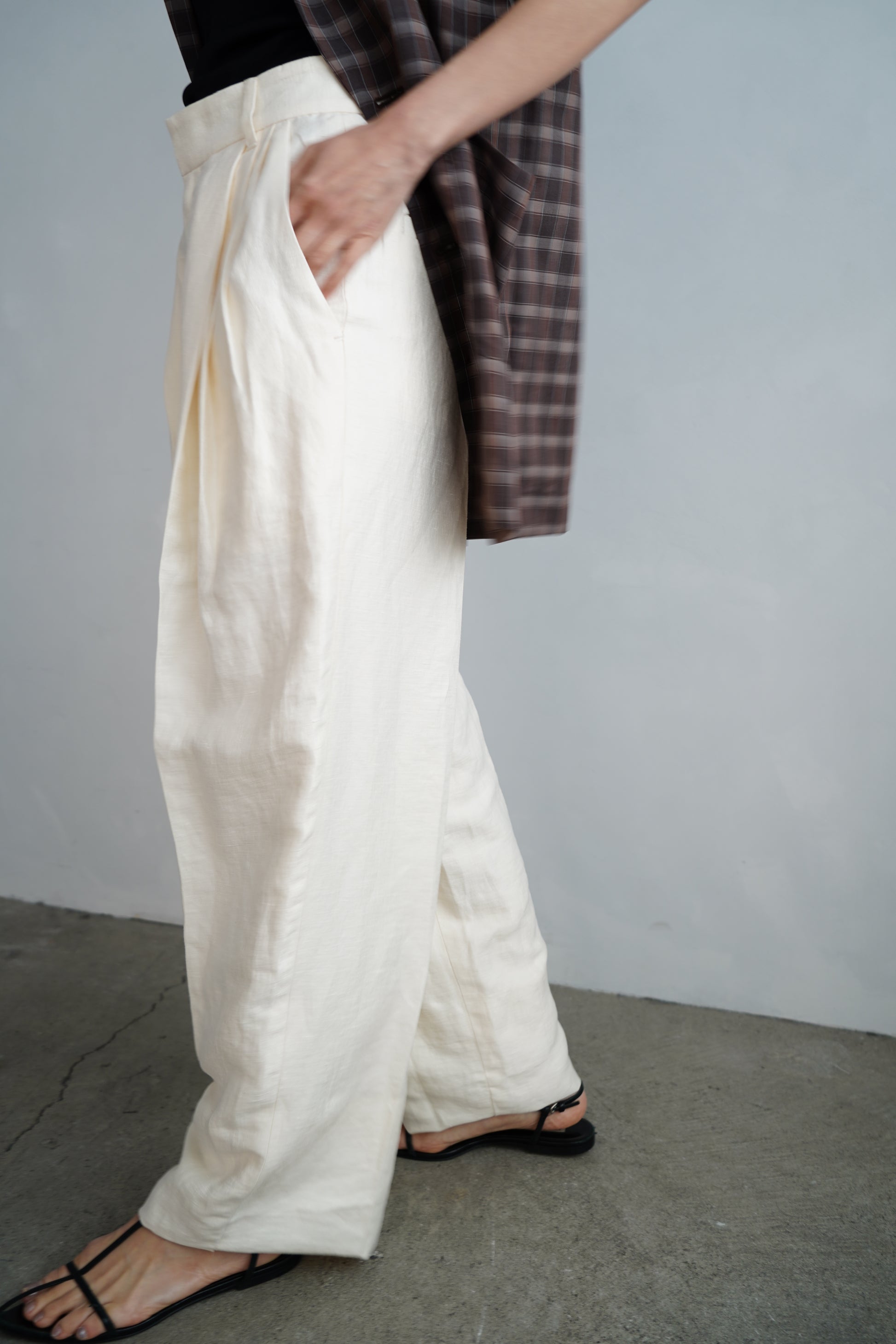 シルクのような光沢を持つヴィスコースと、リネンのナチュラルな表情を掛け合わせた特別な素材で製作したパンツです。