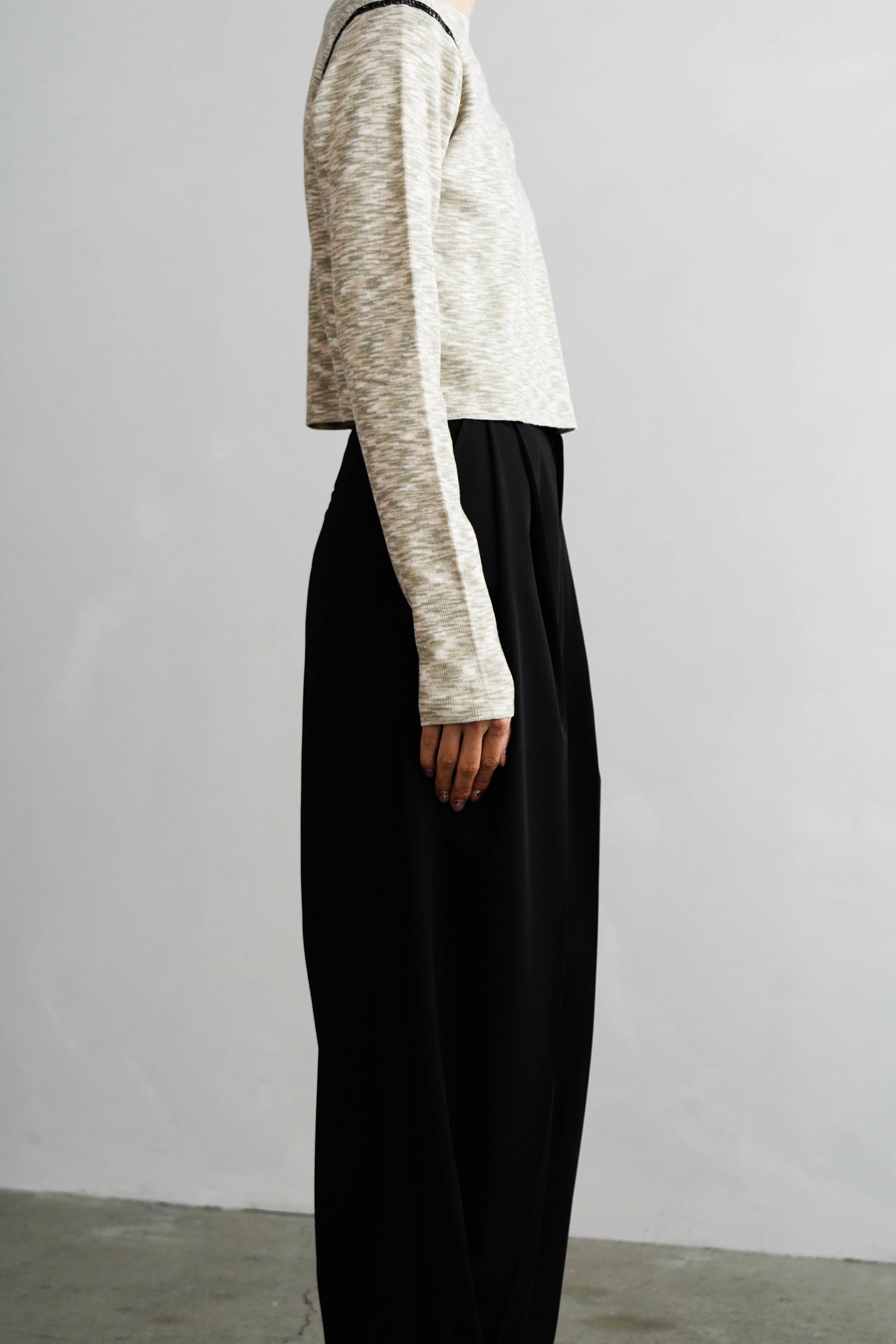 短めの着丈と程よくゆとりのあるセットインのシルエットにより、さらりと着るだけで洗練されたボックスシルエットが完成。ハイウエストやワイドなシルエットのボトムスとも相性抜群です。