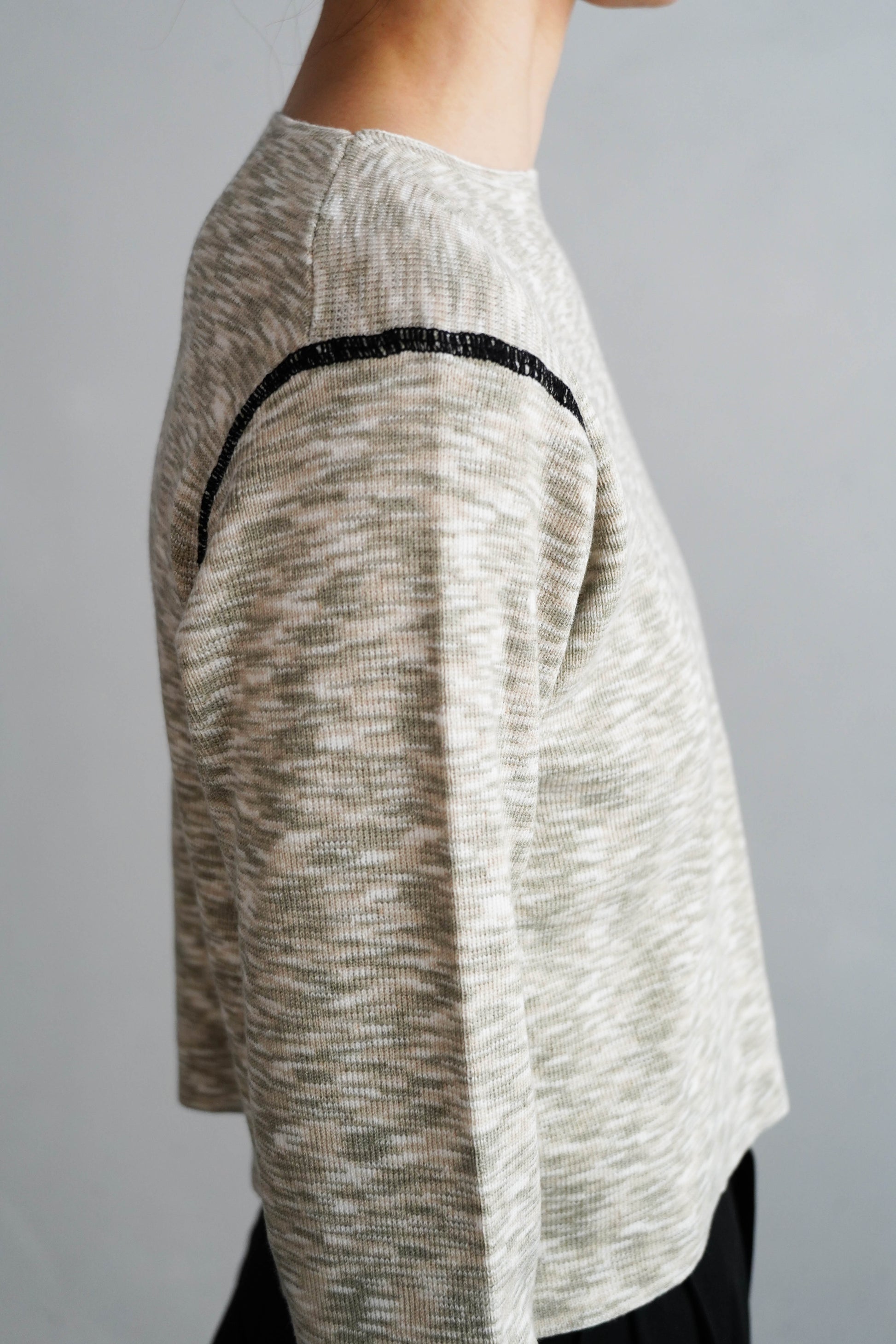 数の色がランダムに混ざり合い、表情豊かなきれいな発色のメランジカラーニット。アームホールに施された配色ステッチが、メランジカラーの柔らかな風合いに、手仕事のようなクラフト感とメリハリを添えています。