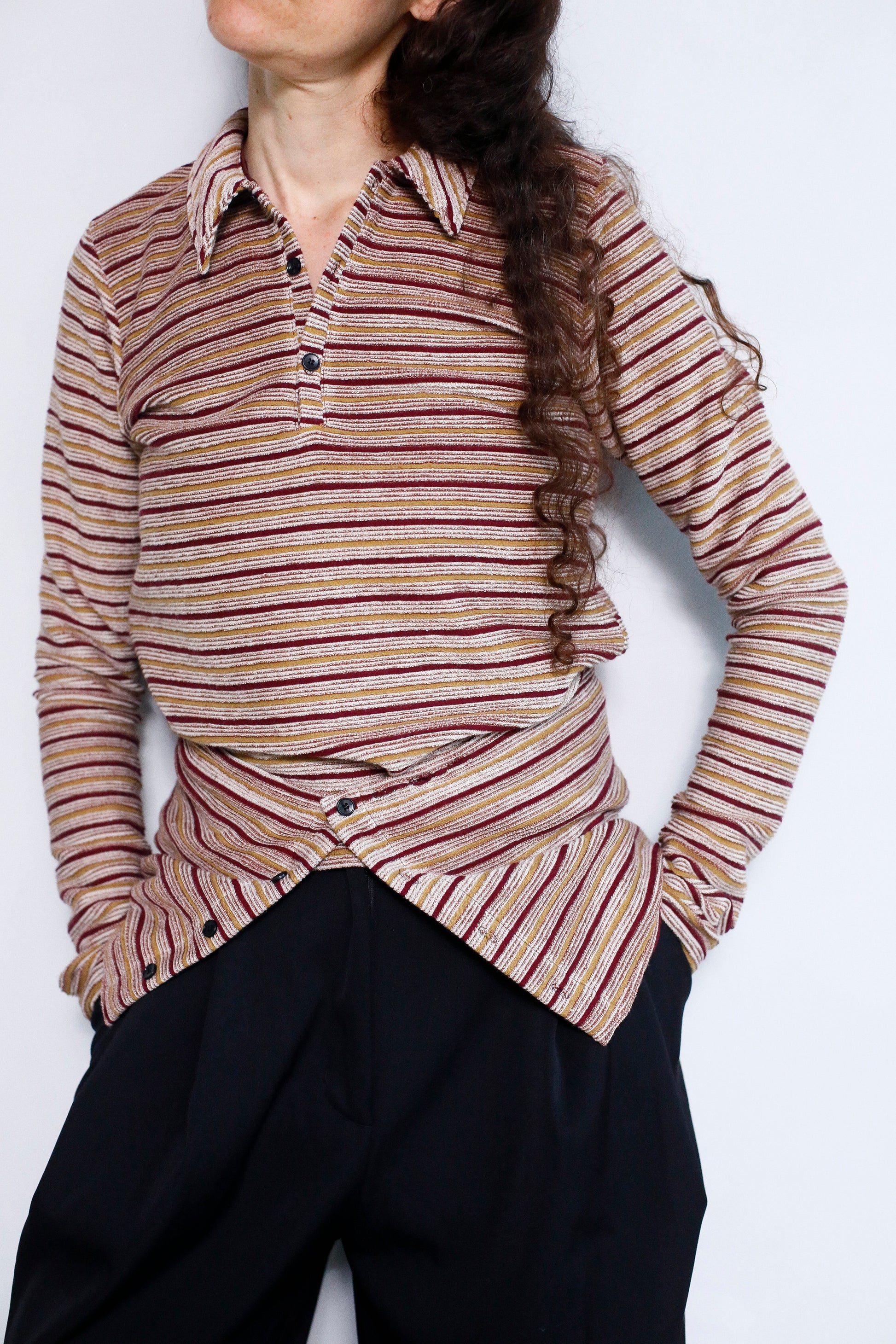 レトロムード漂うマルチボーダーを使用したシャツ。