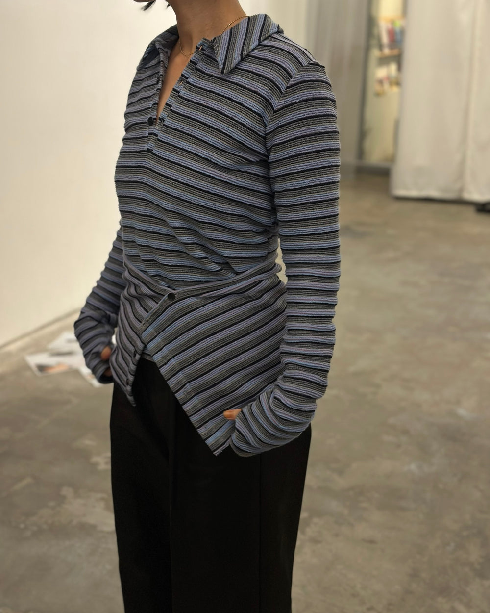 レトロムード漂うマルチボーダーを使用したシャツ。