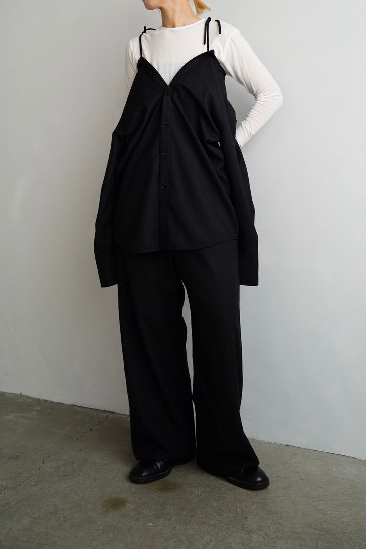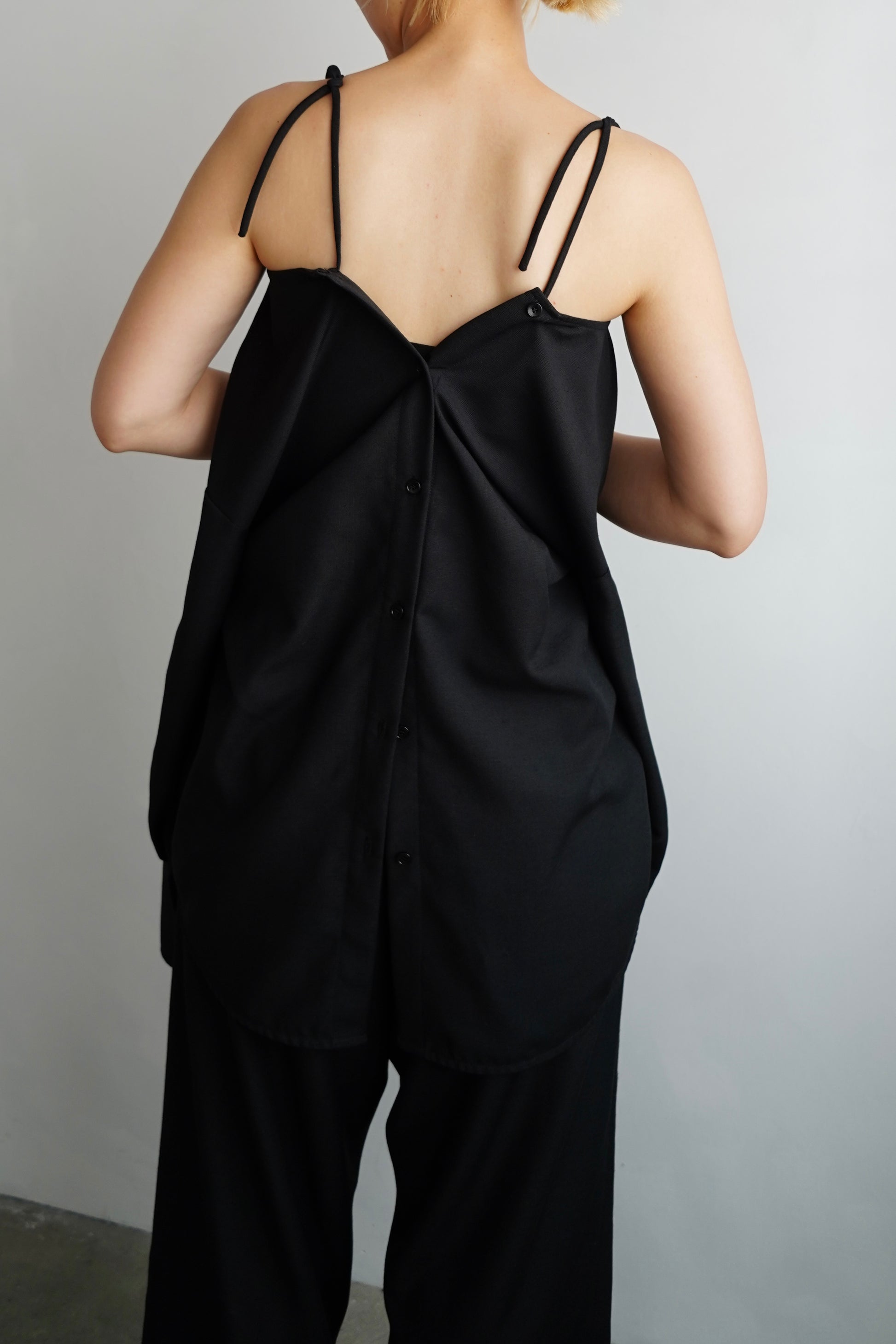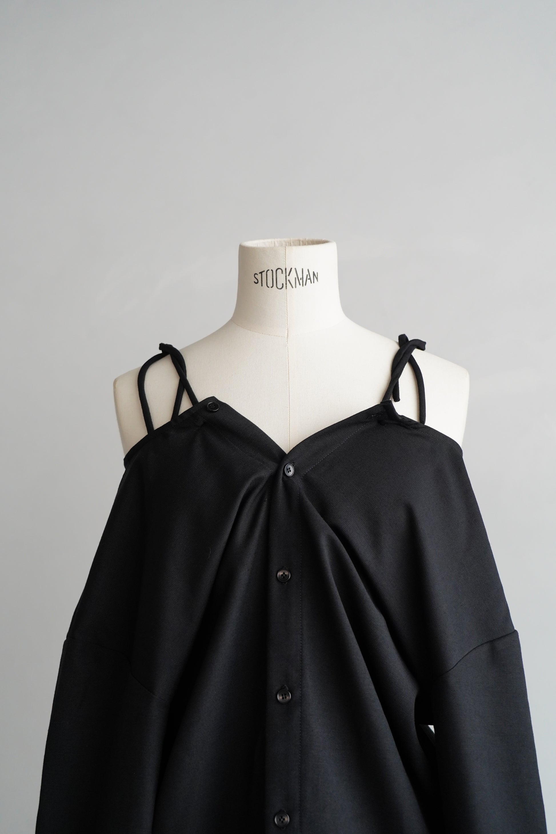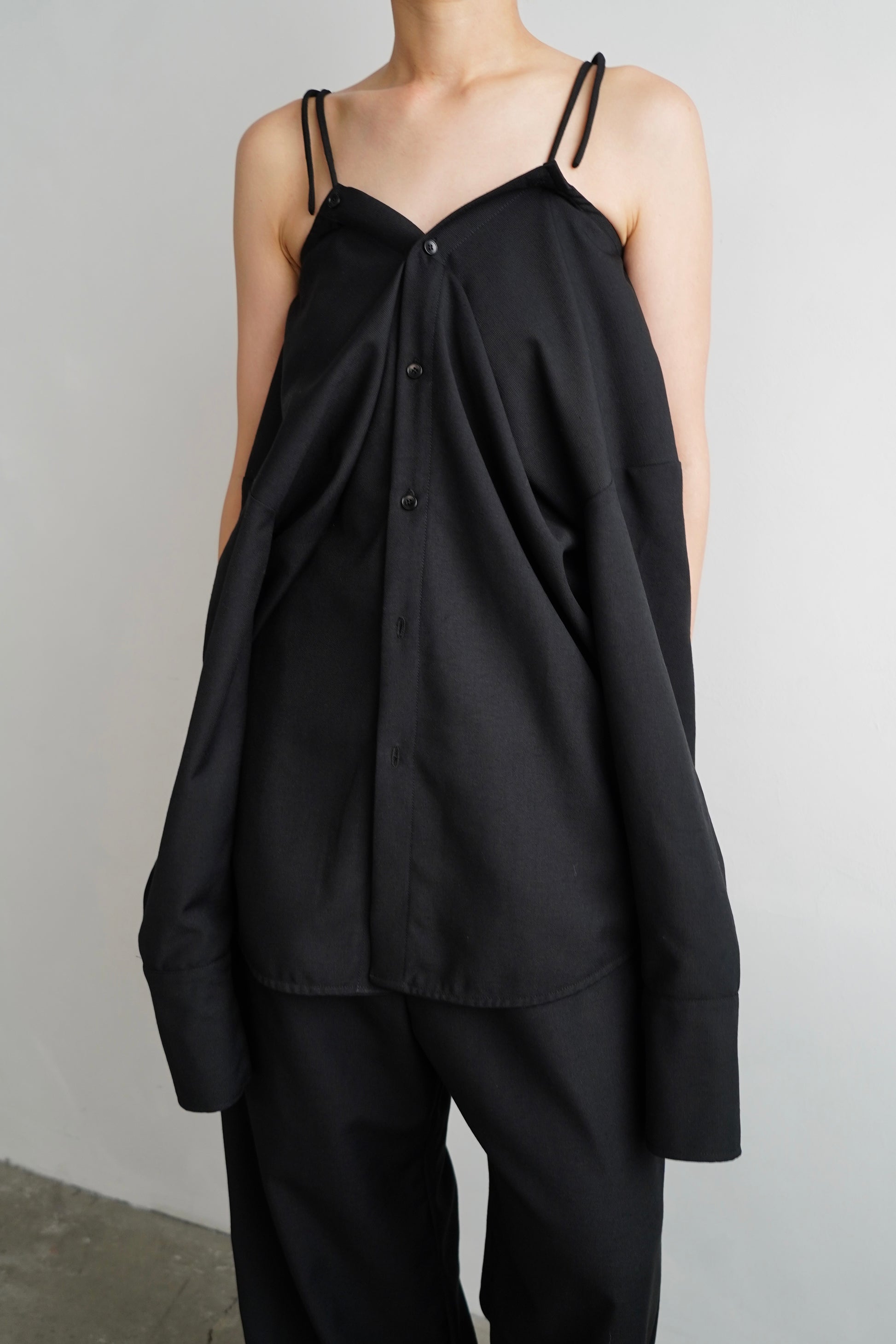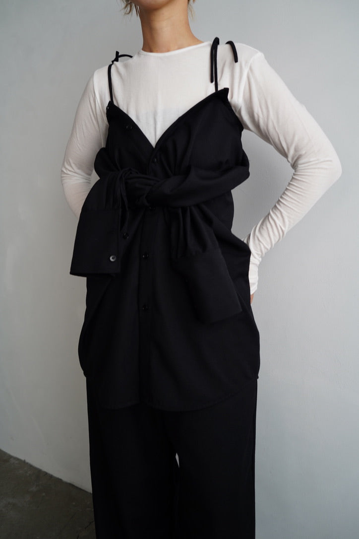 ノーカラーの内側に配されたストラップを結べばキャミソール風に変身。