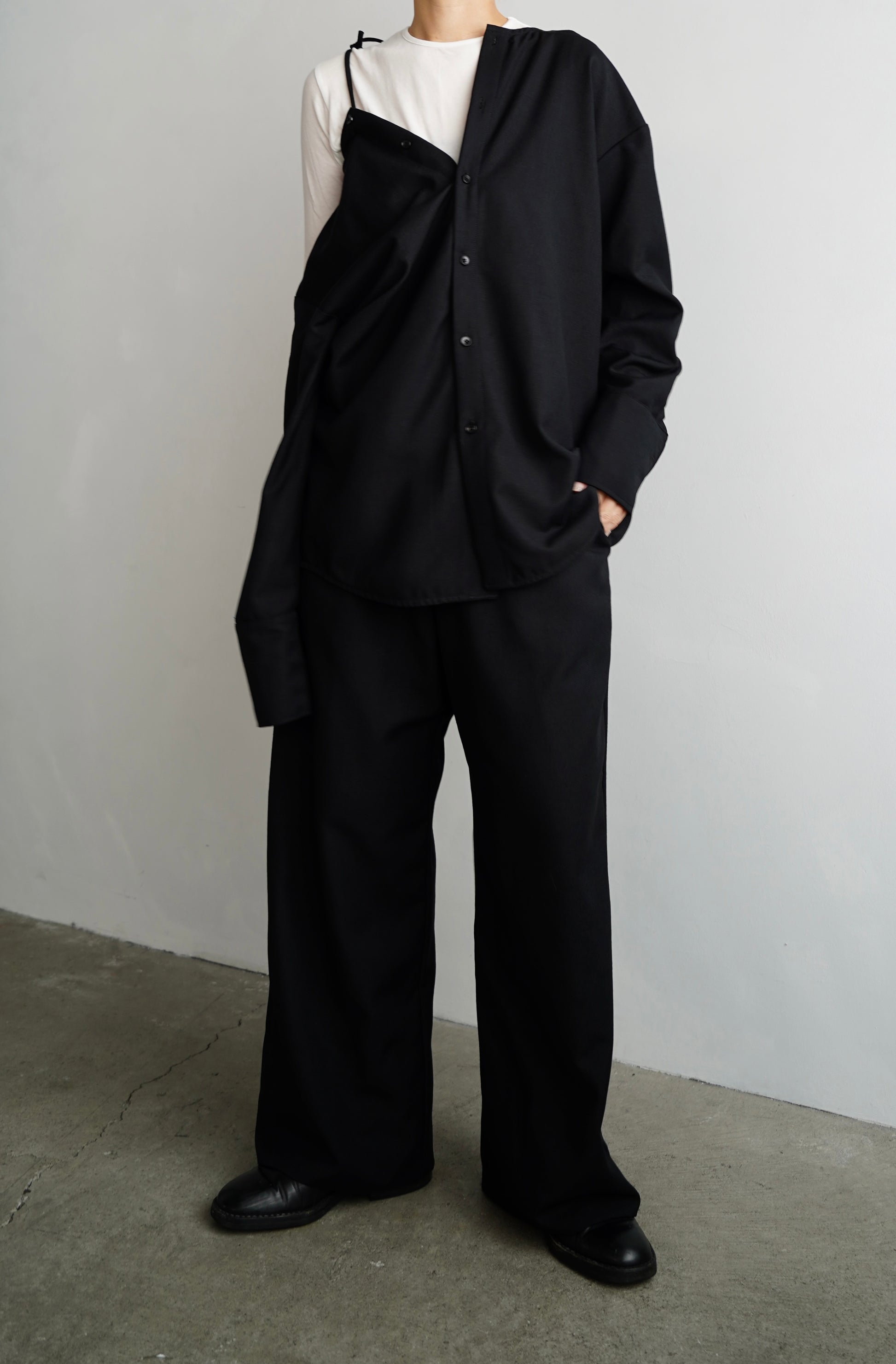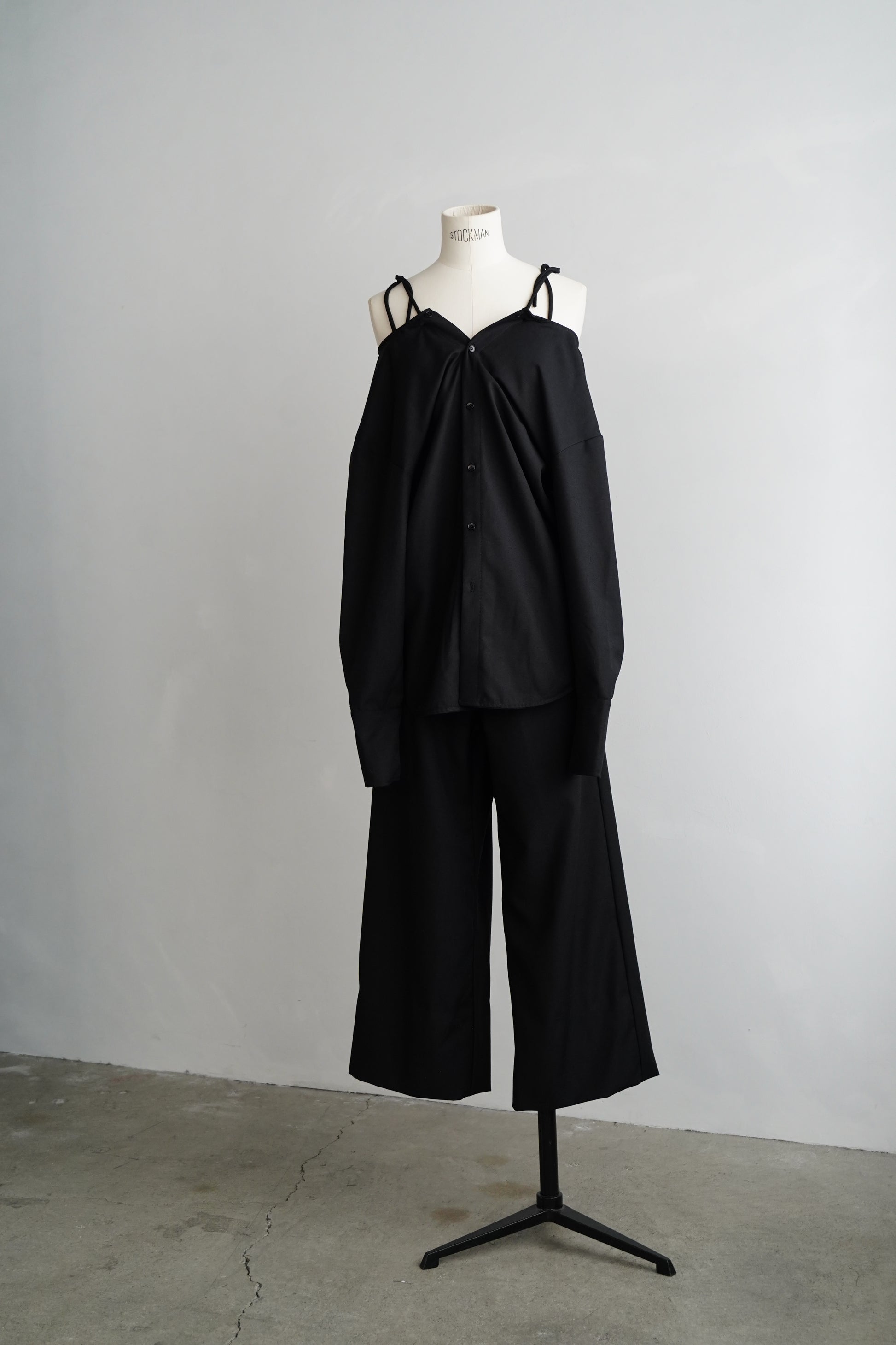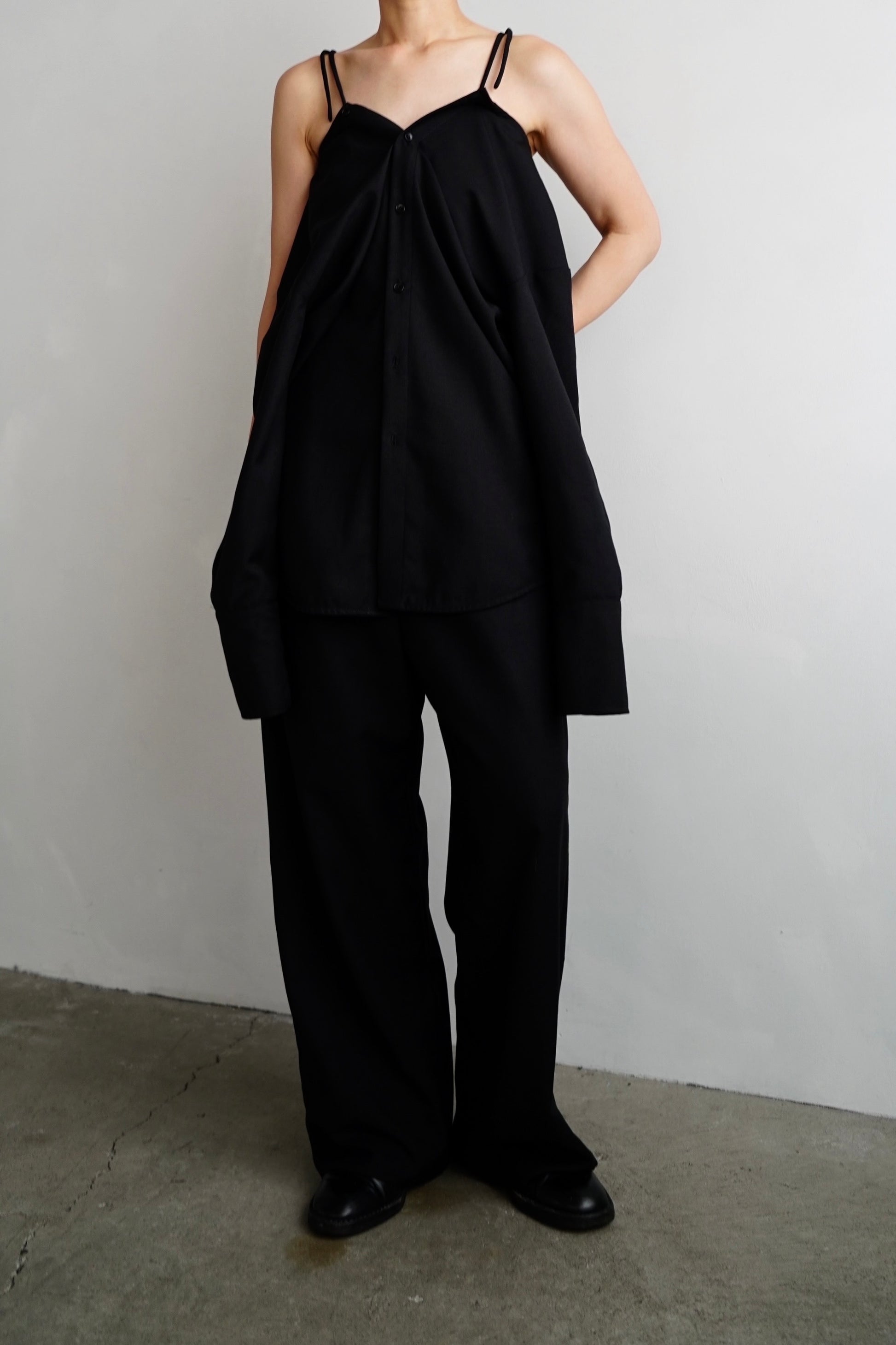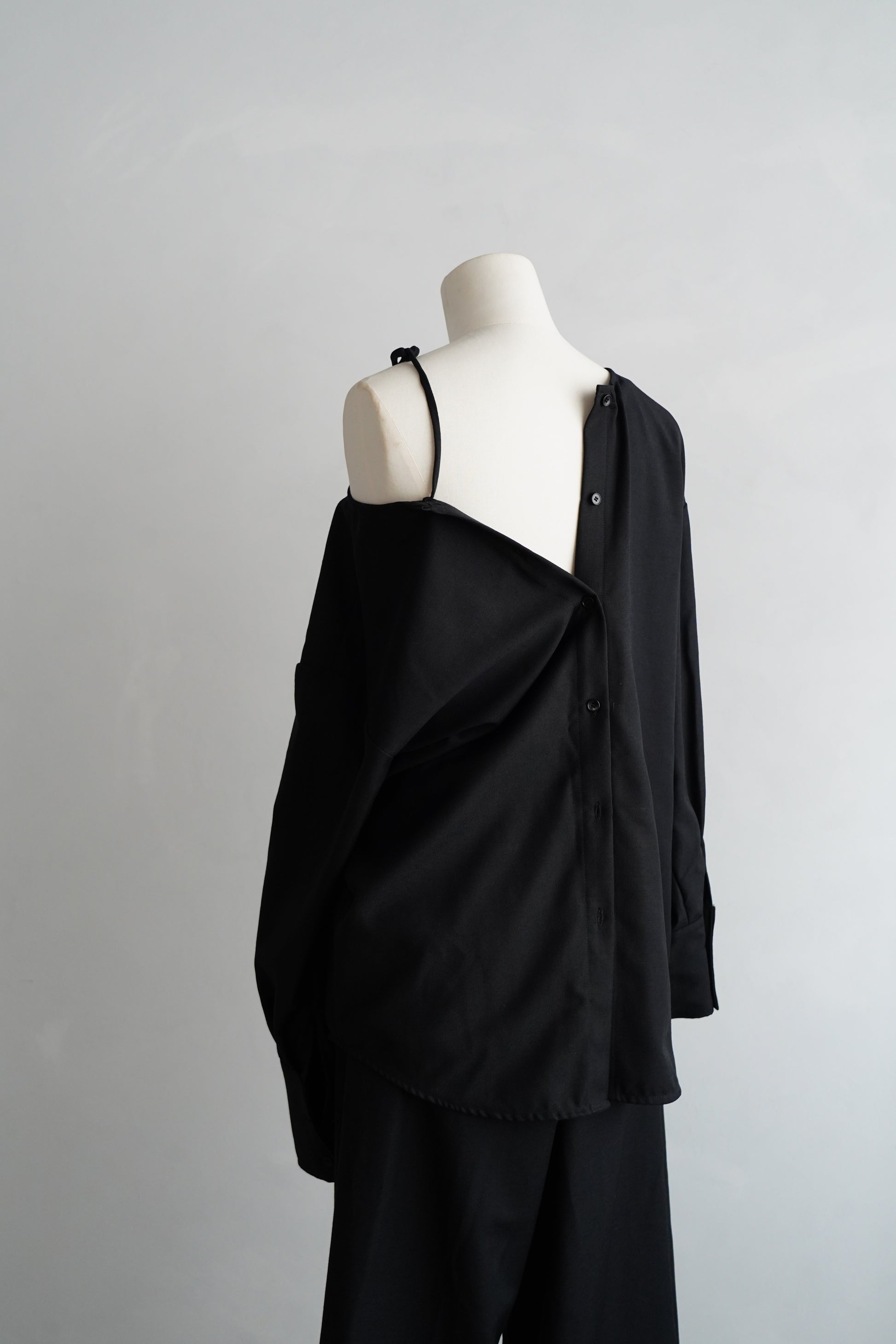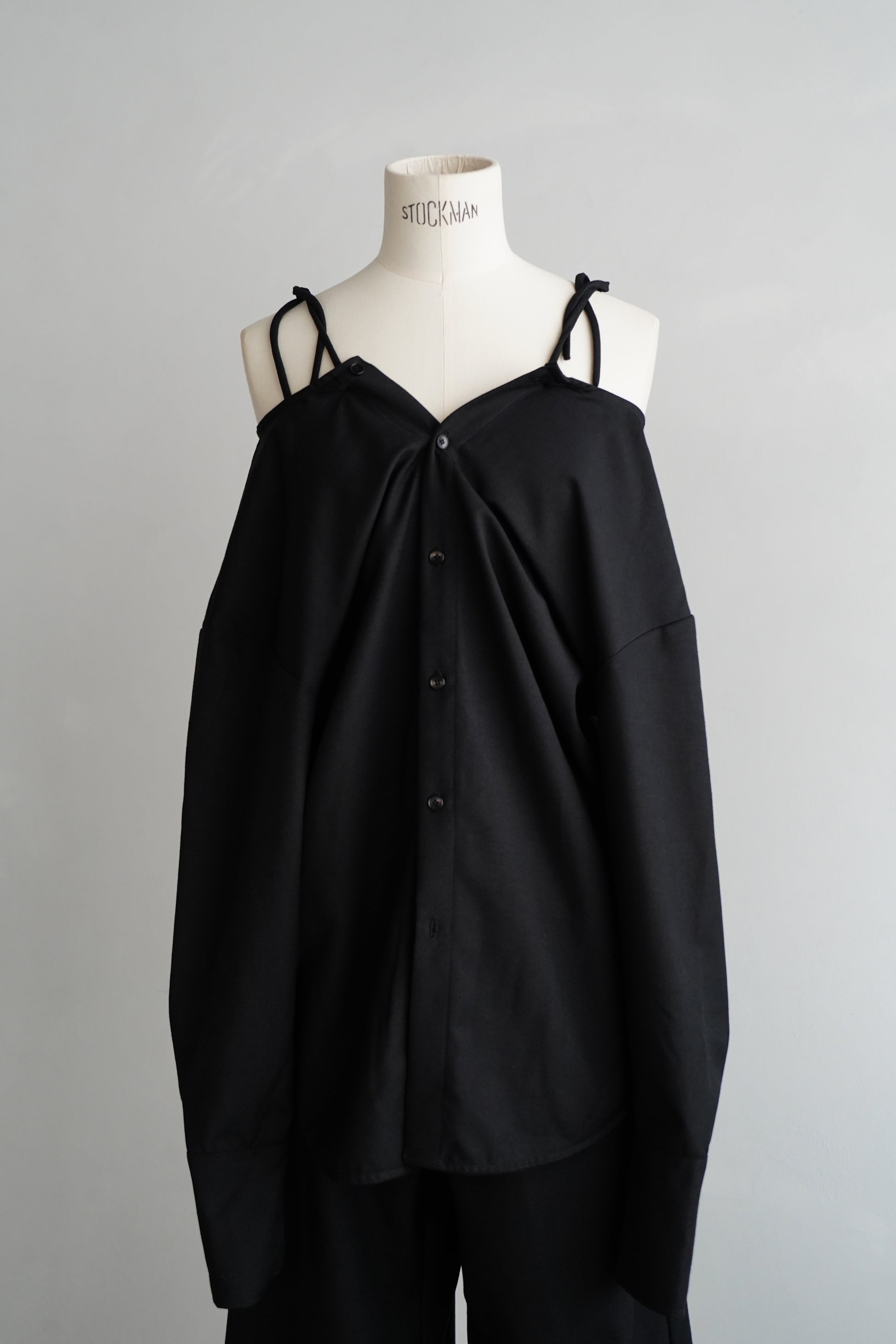 ノーカラーの内側に配されたストラップを結べばキャミソール風に変身。