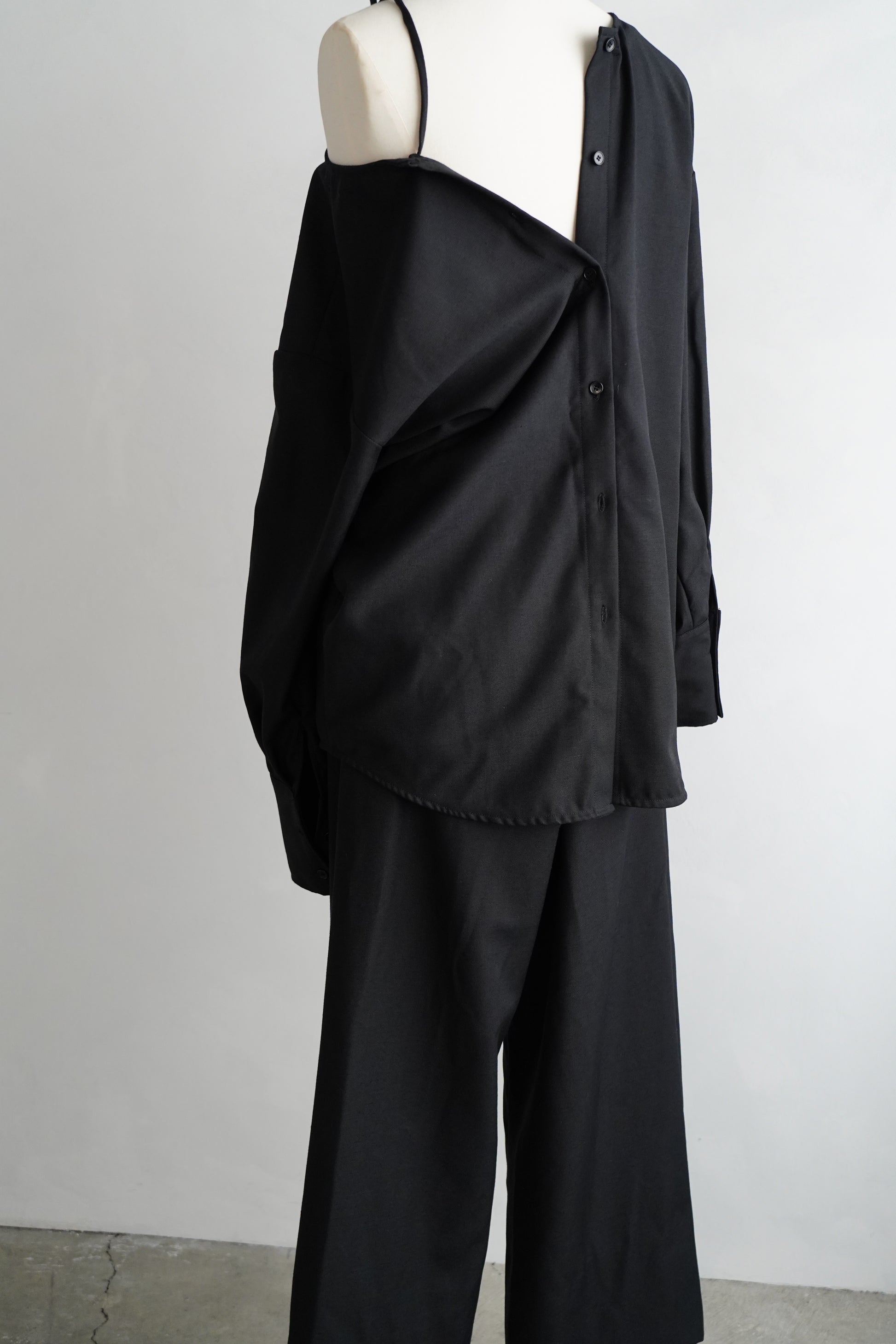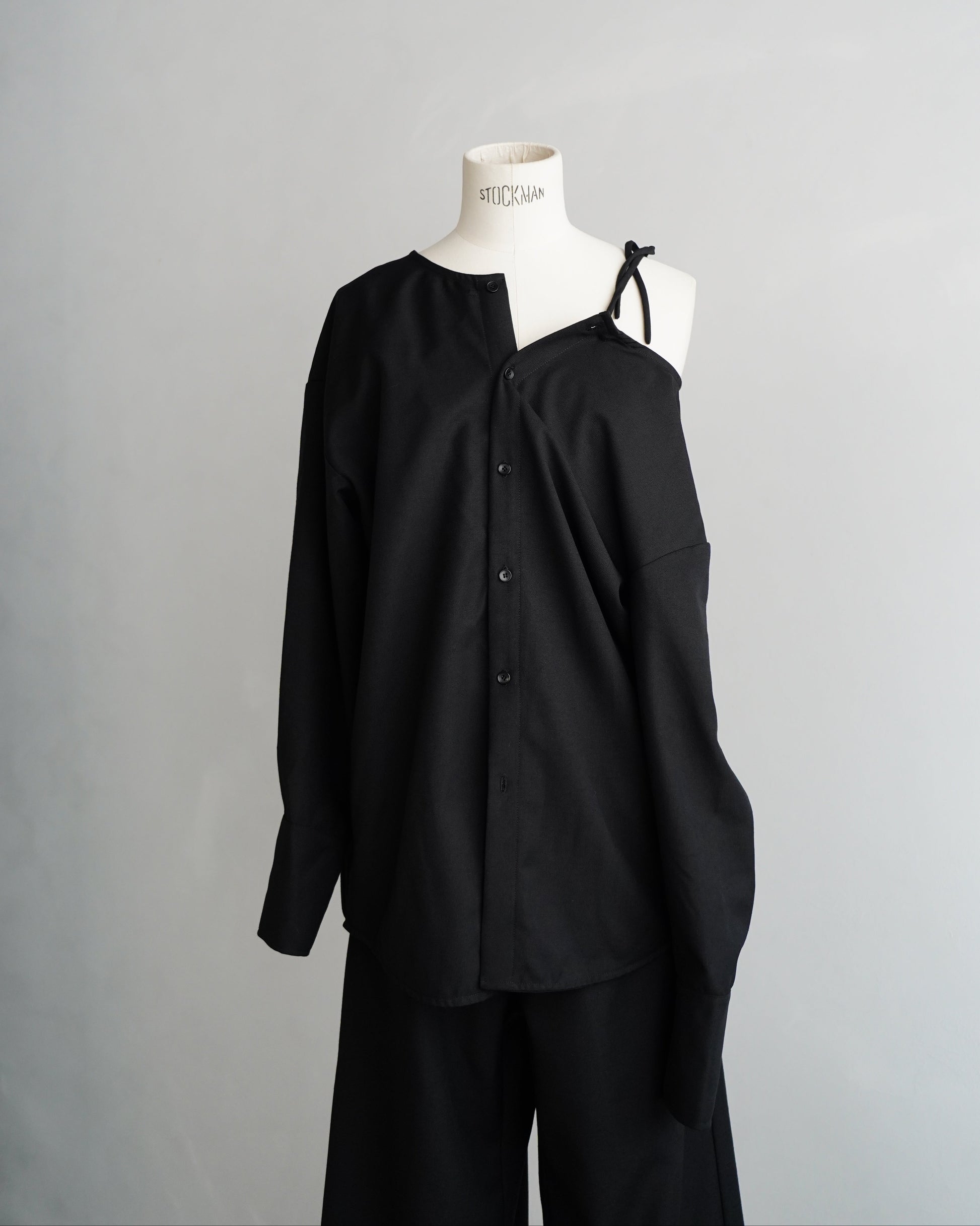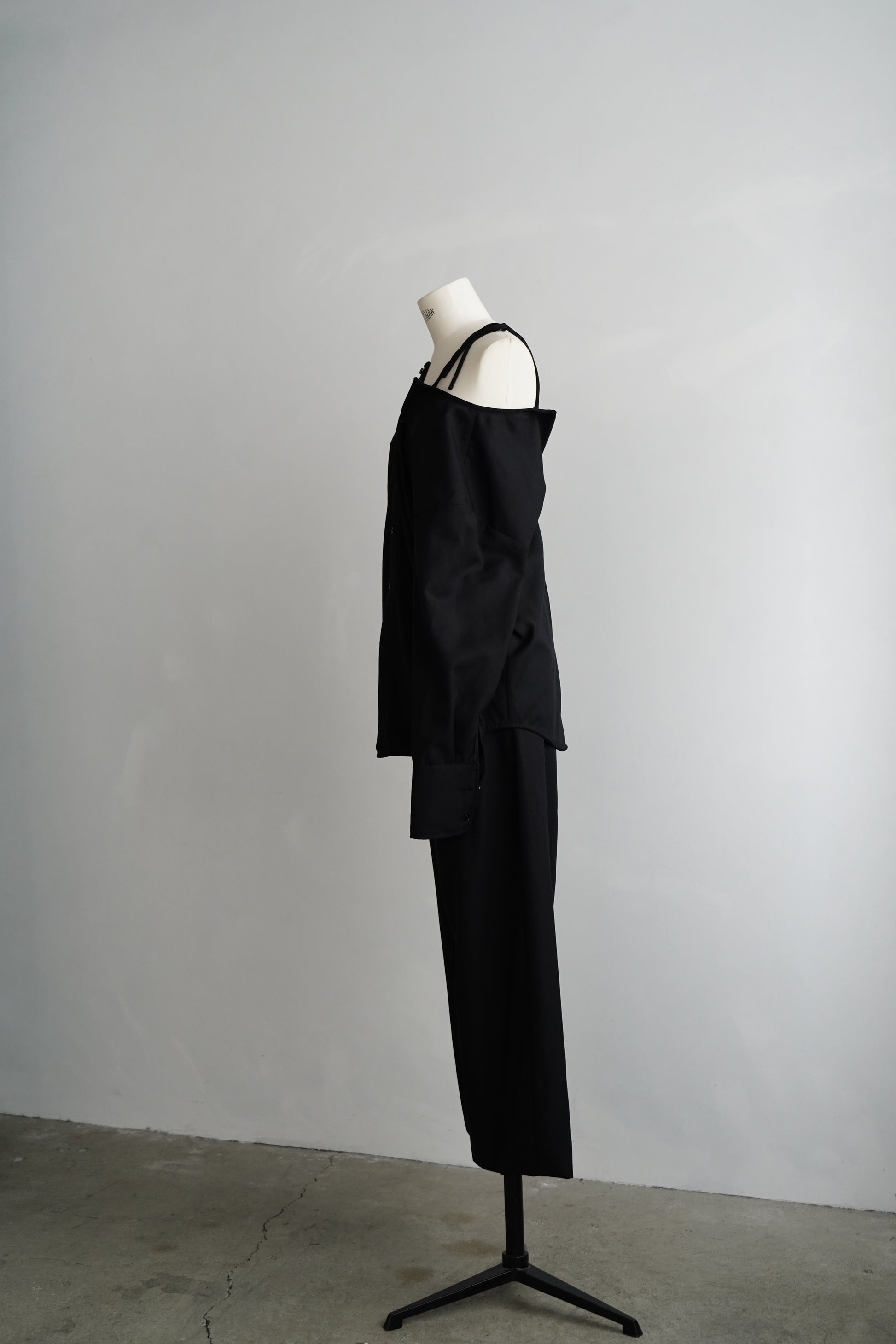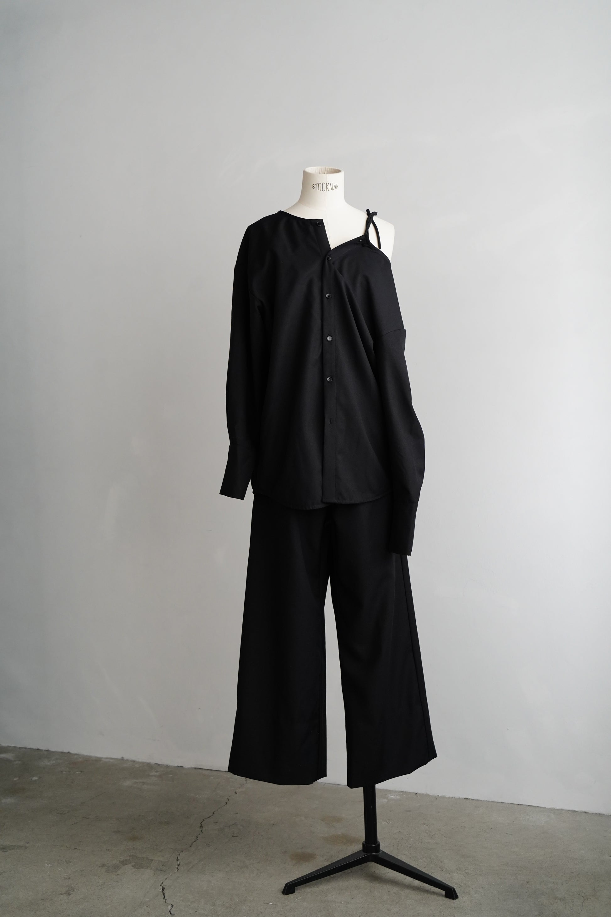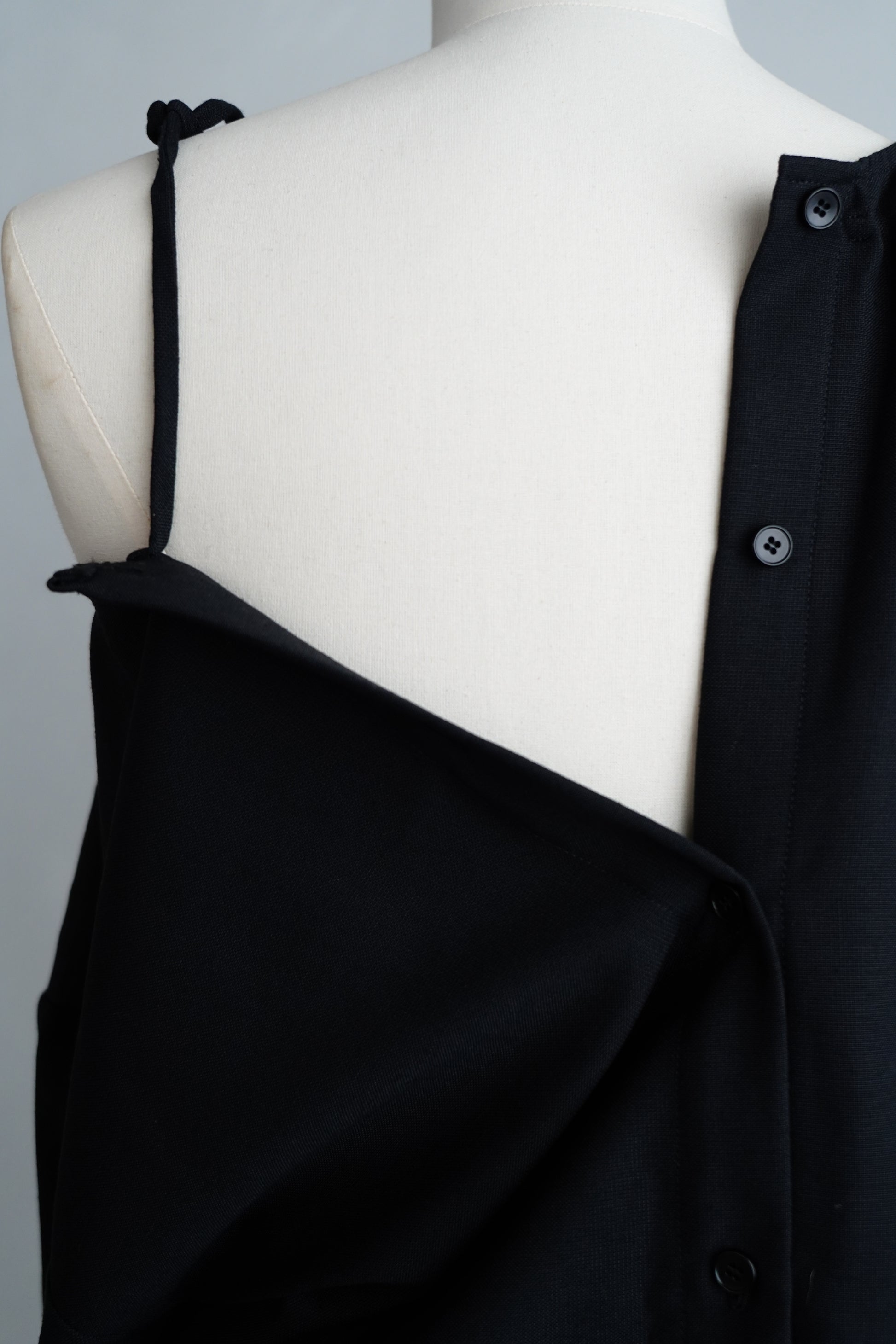 ノーカラーの内側に配されたストラップを結べばキャミソール風に変身。