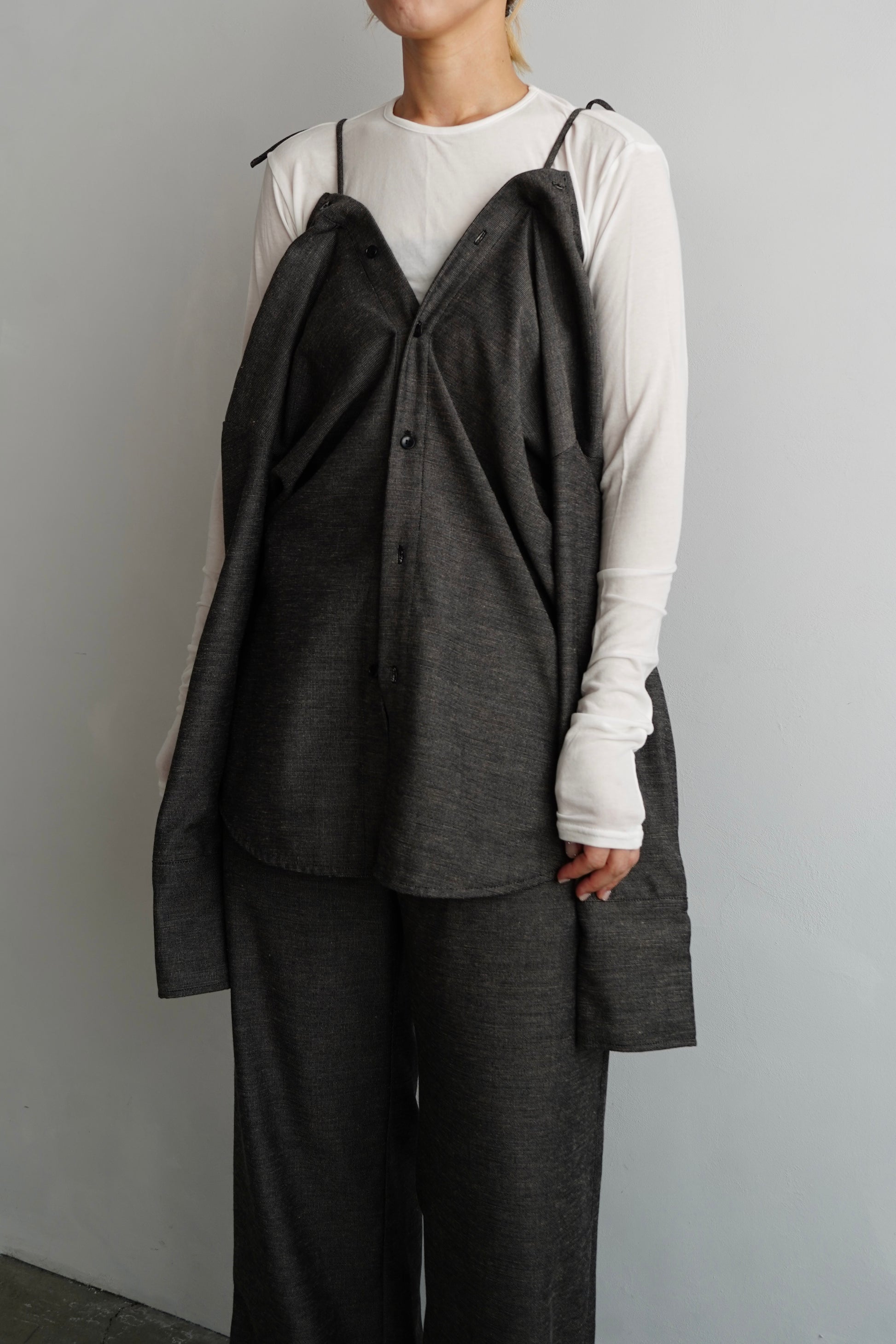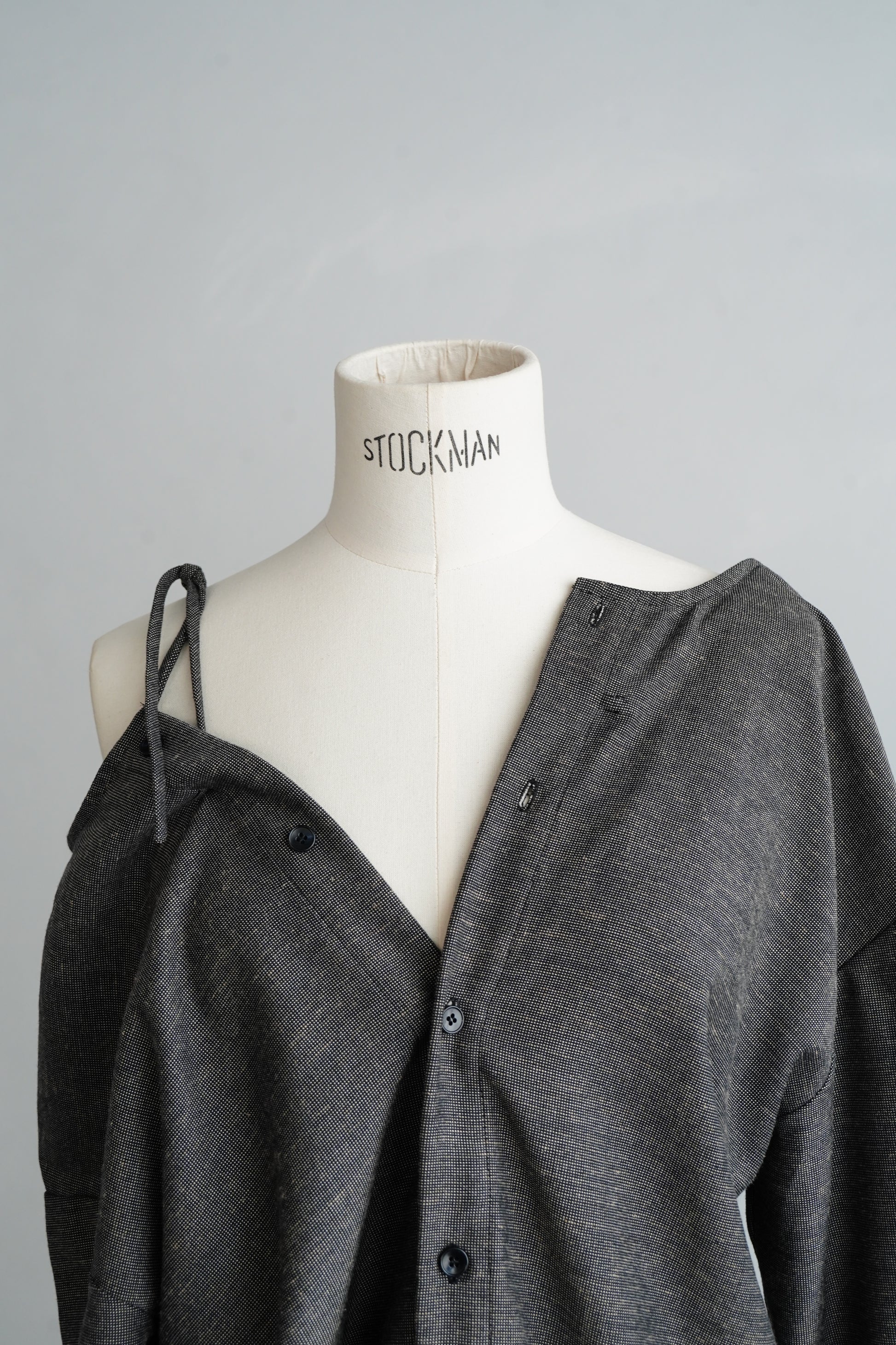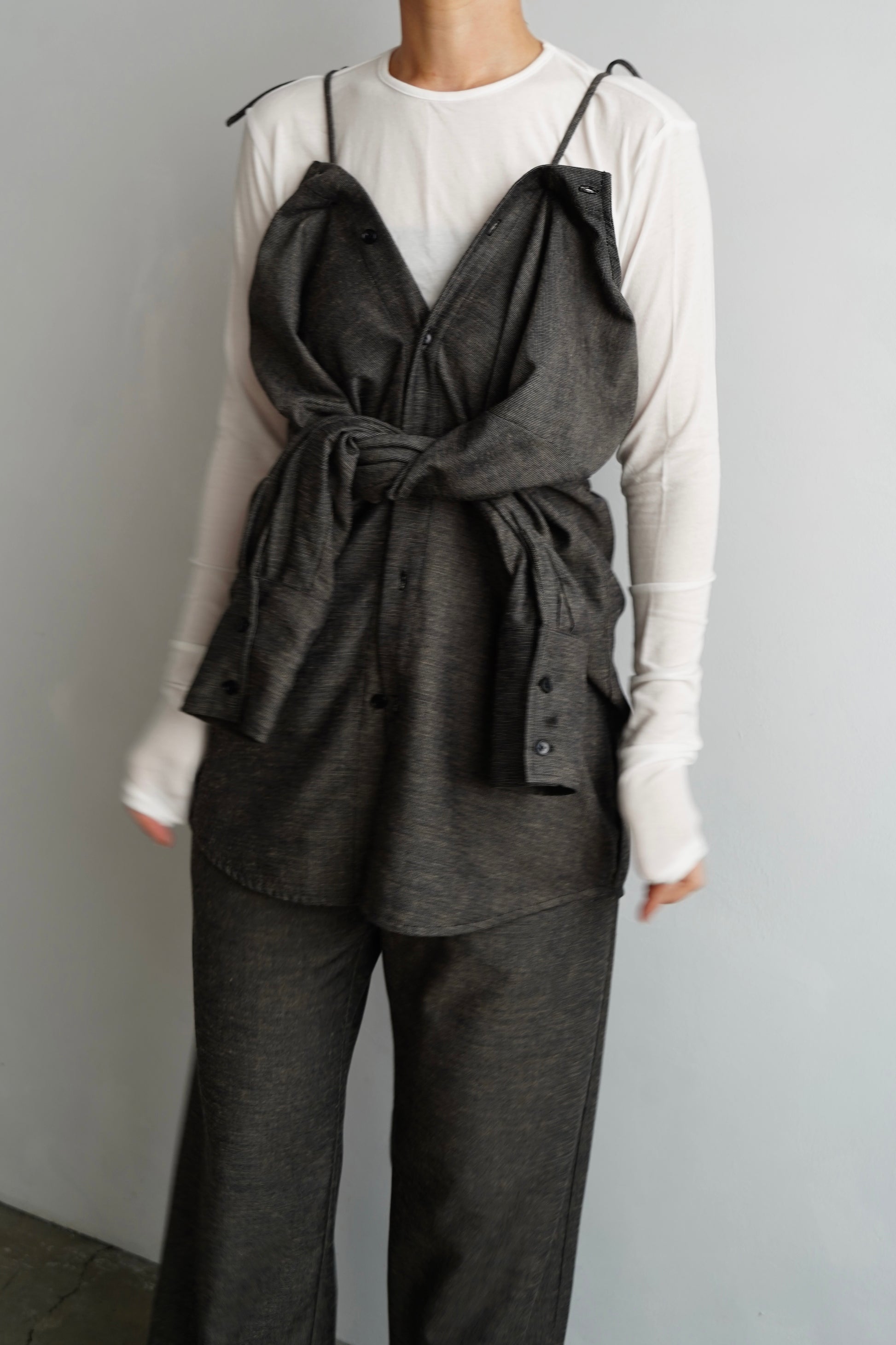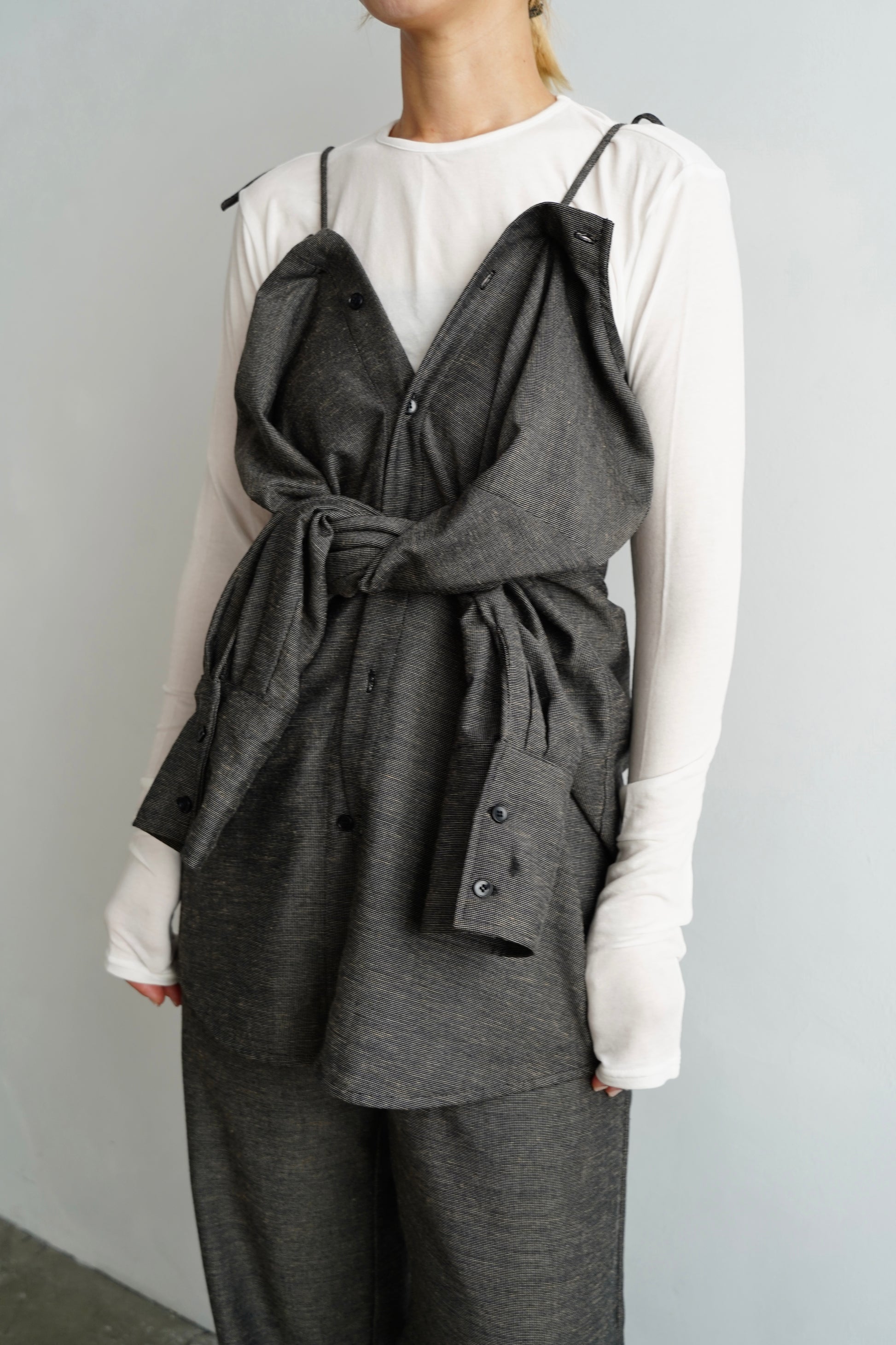 ノーカラーの内側に配されたストラップを結べばキャミソール風に変身。