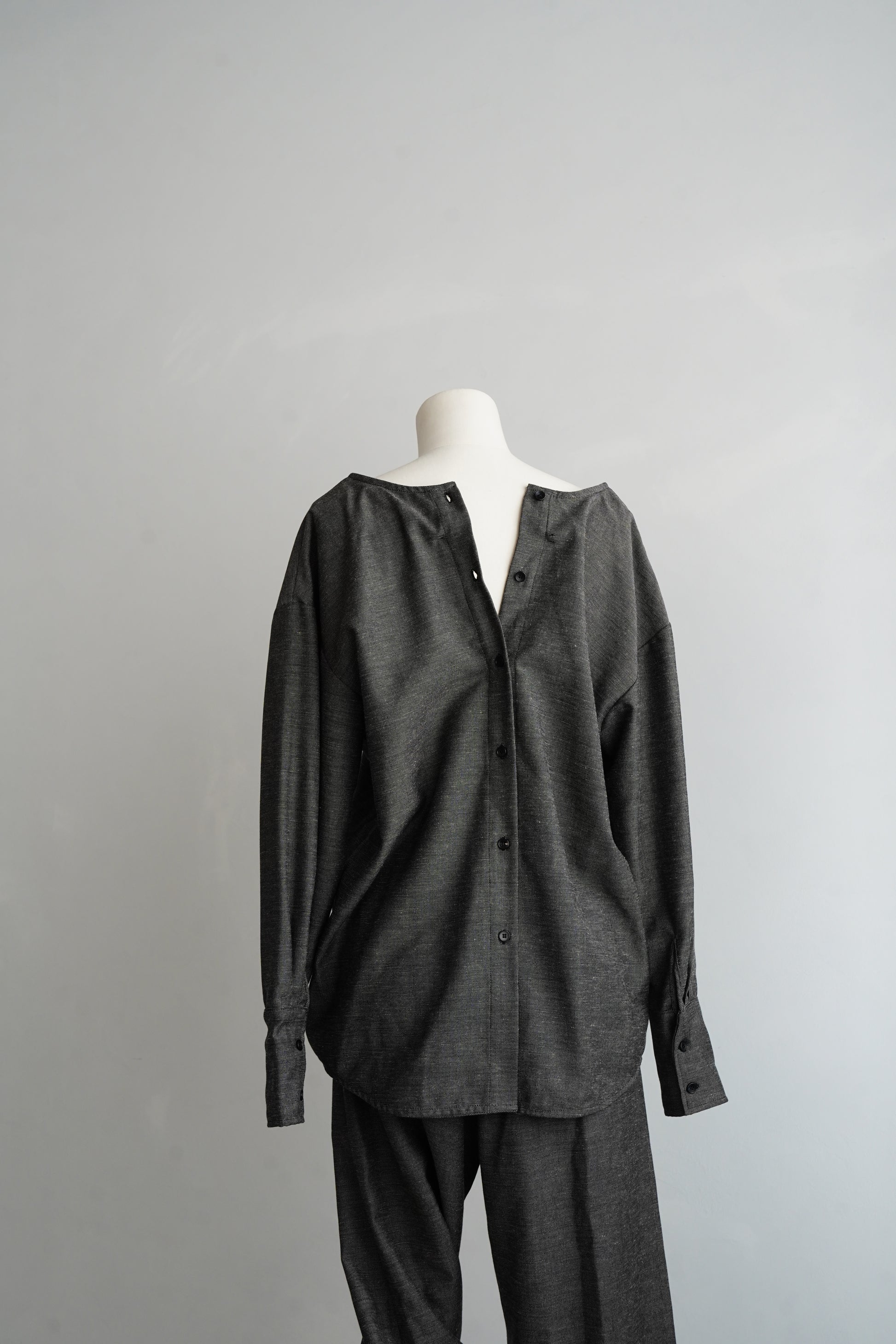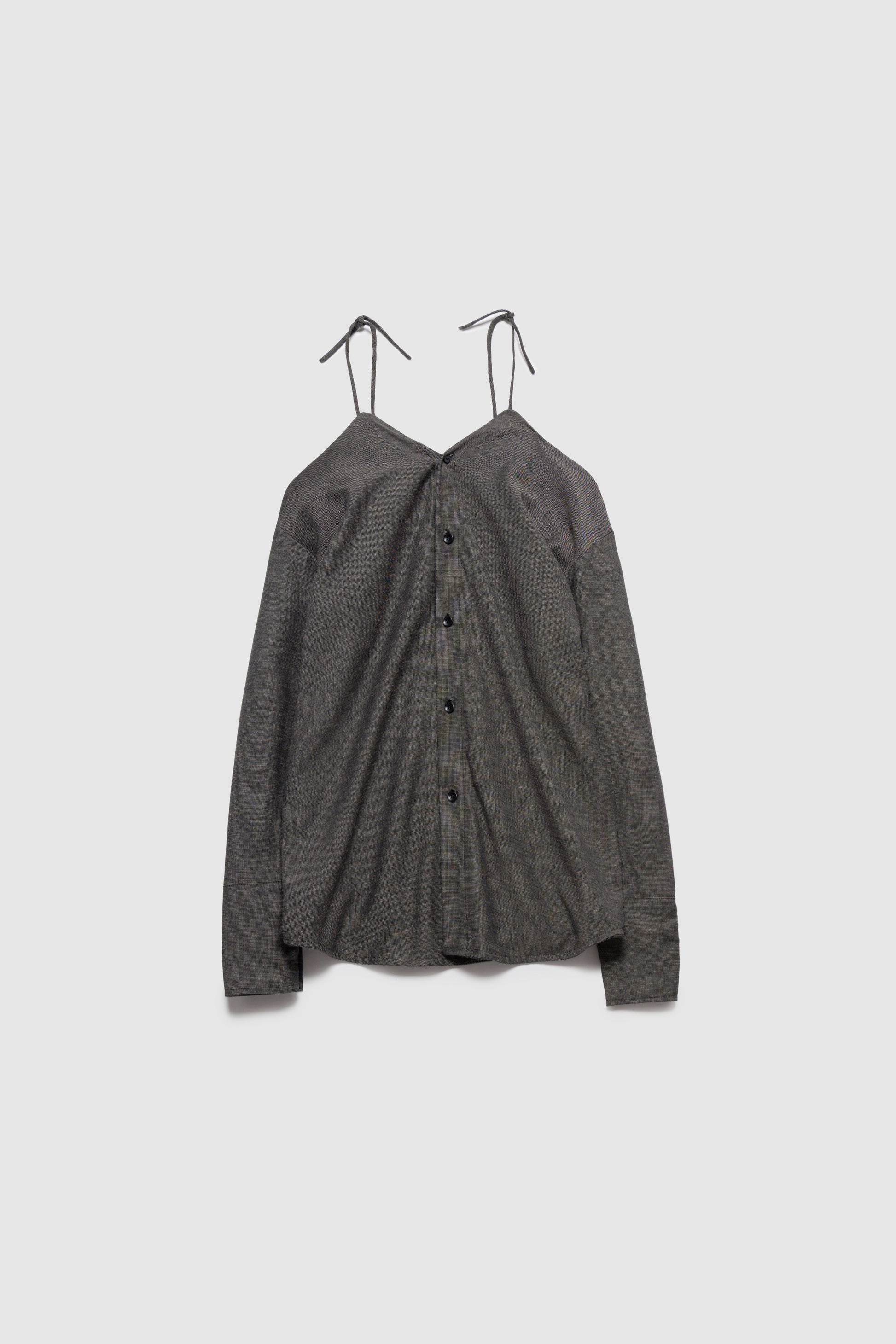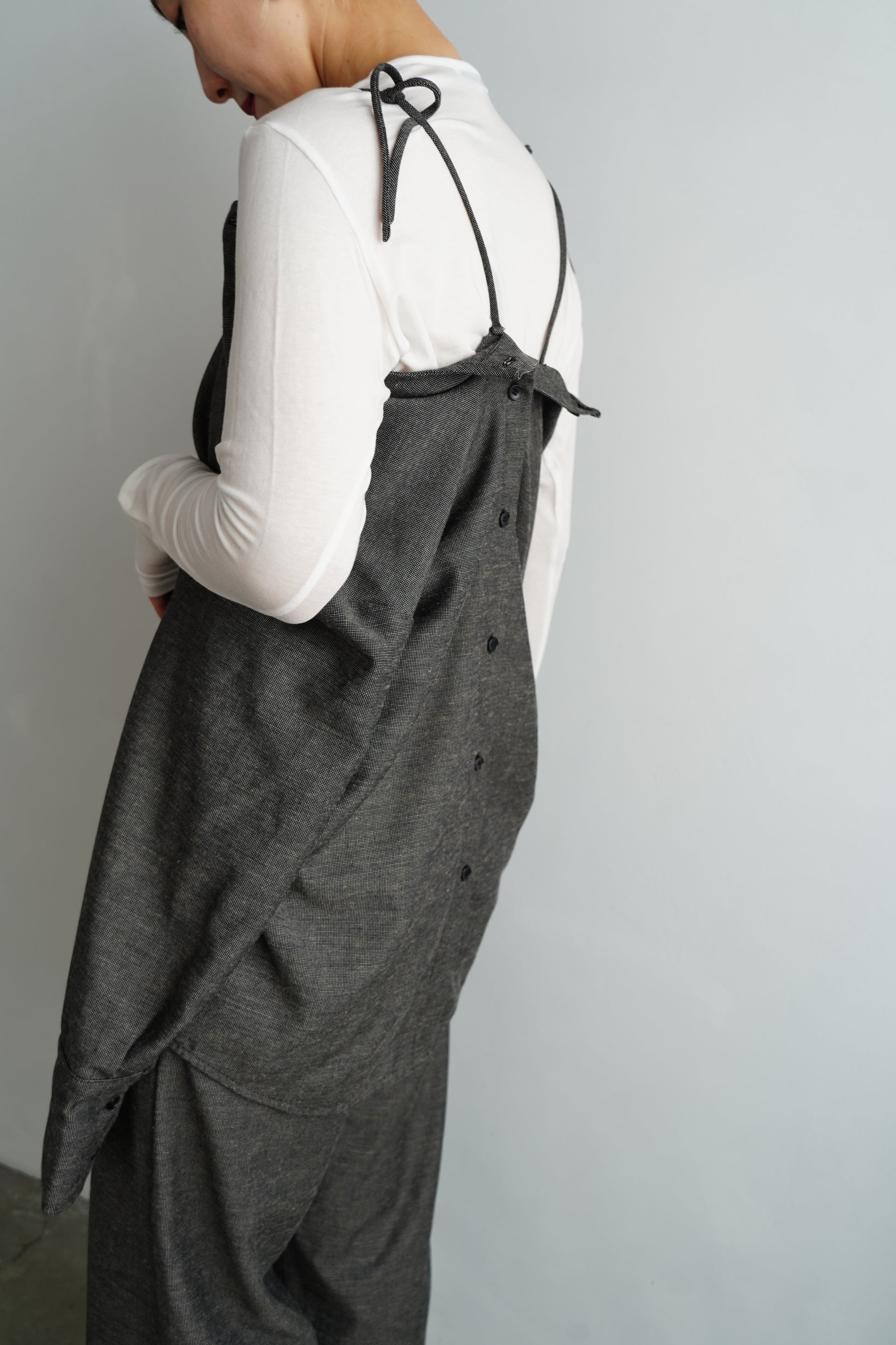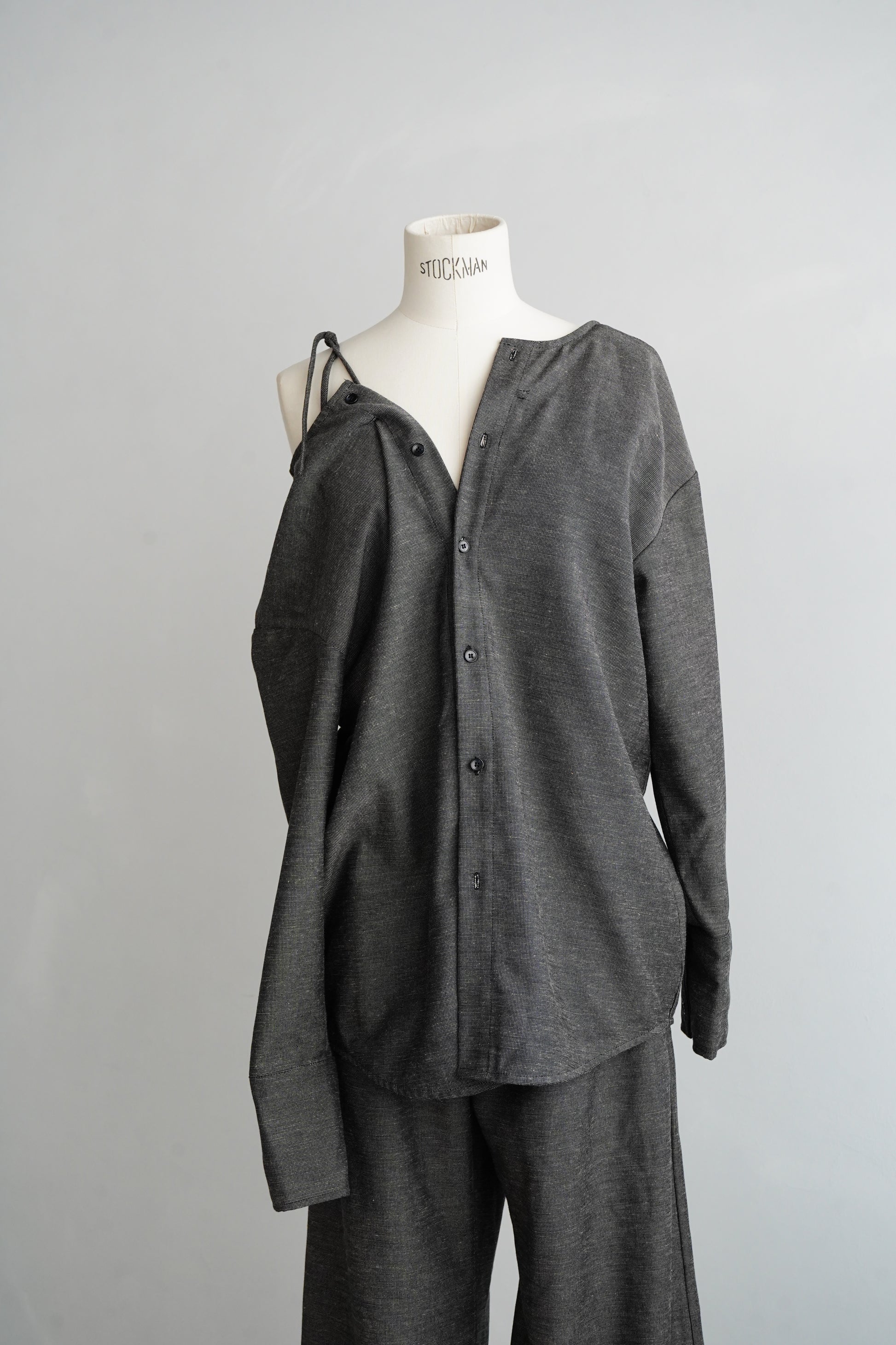 ノーカラーの内側に配されたストラップを結べばキャミソール風に変身。