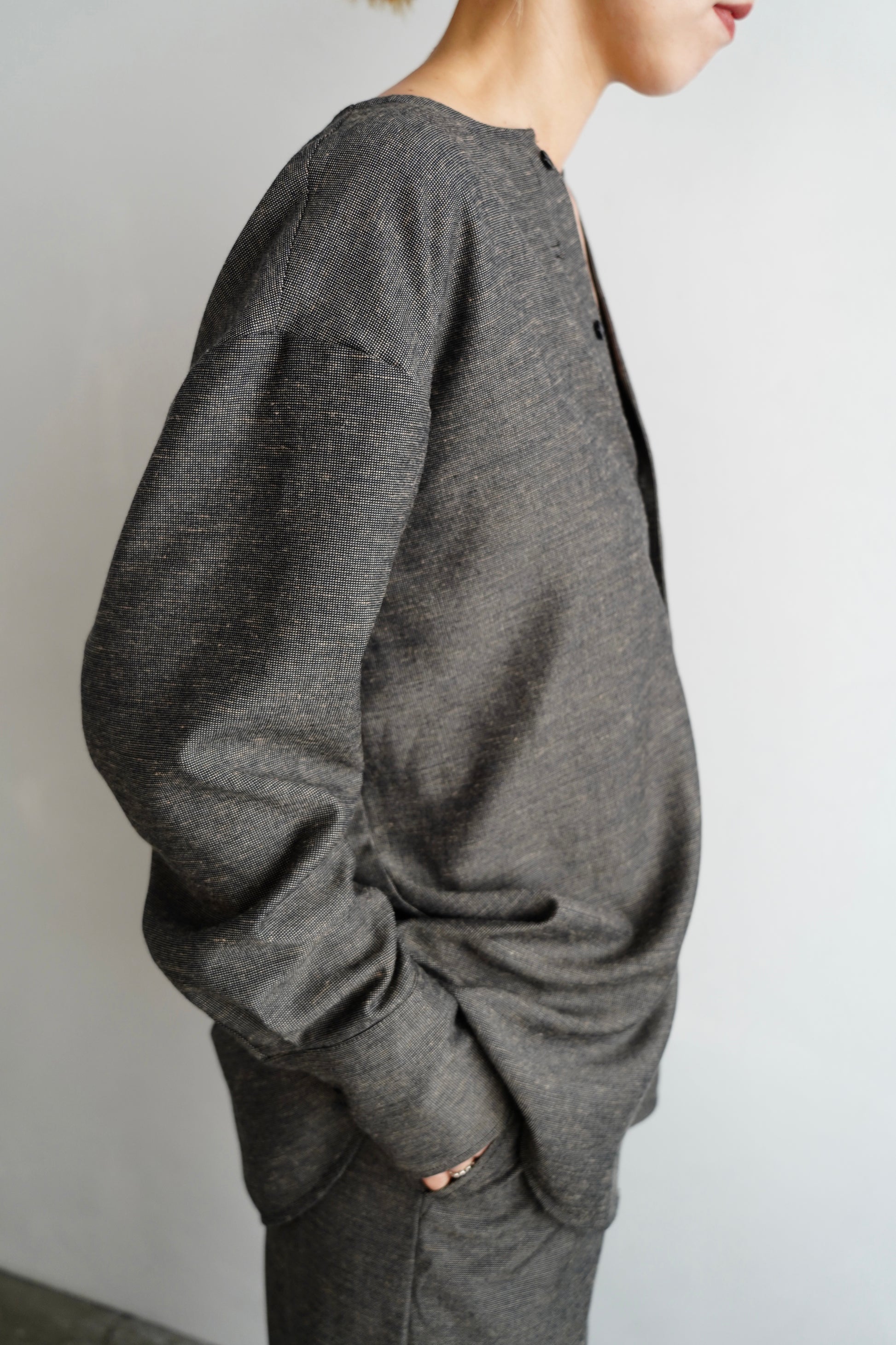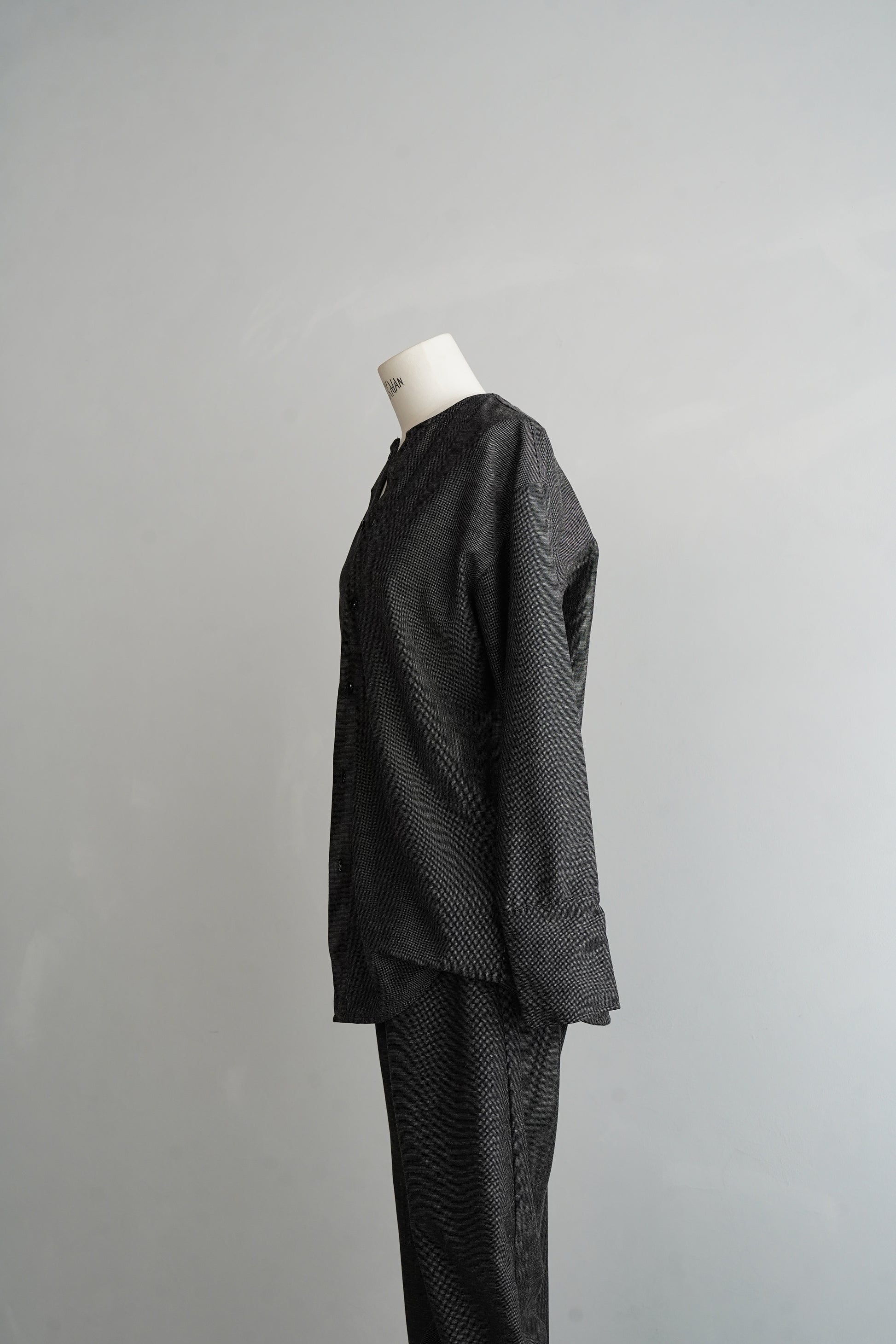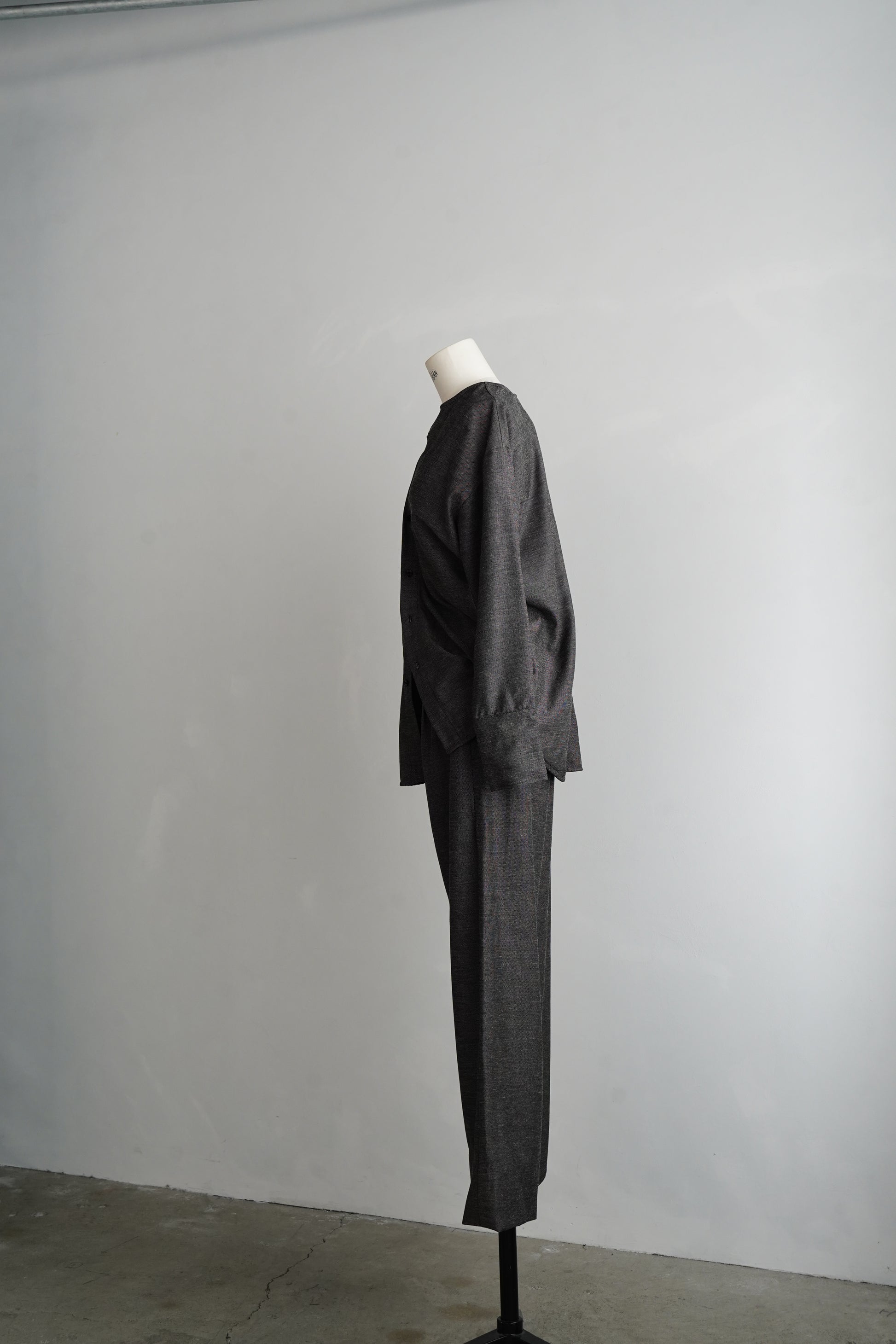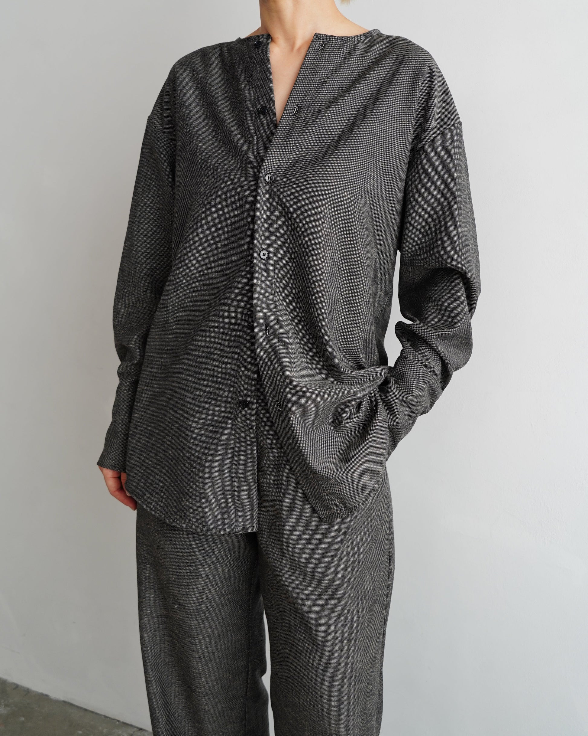 生地のさりげないネップ(糸のかたまり)が表情に奥行きを与え、グレーはネップがより目立ち、ブラックは落ち着いた印象です。
