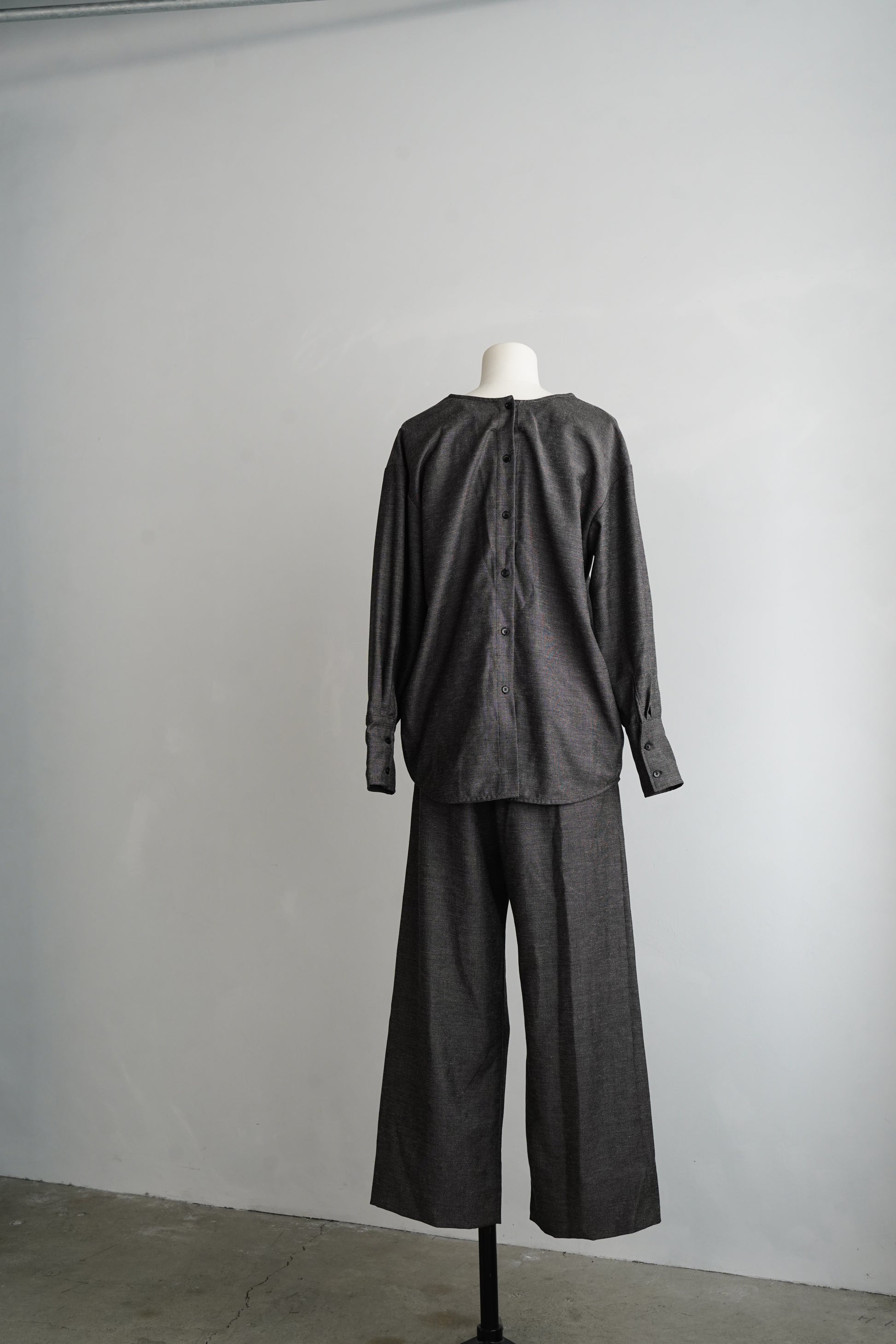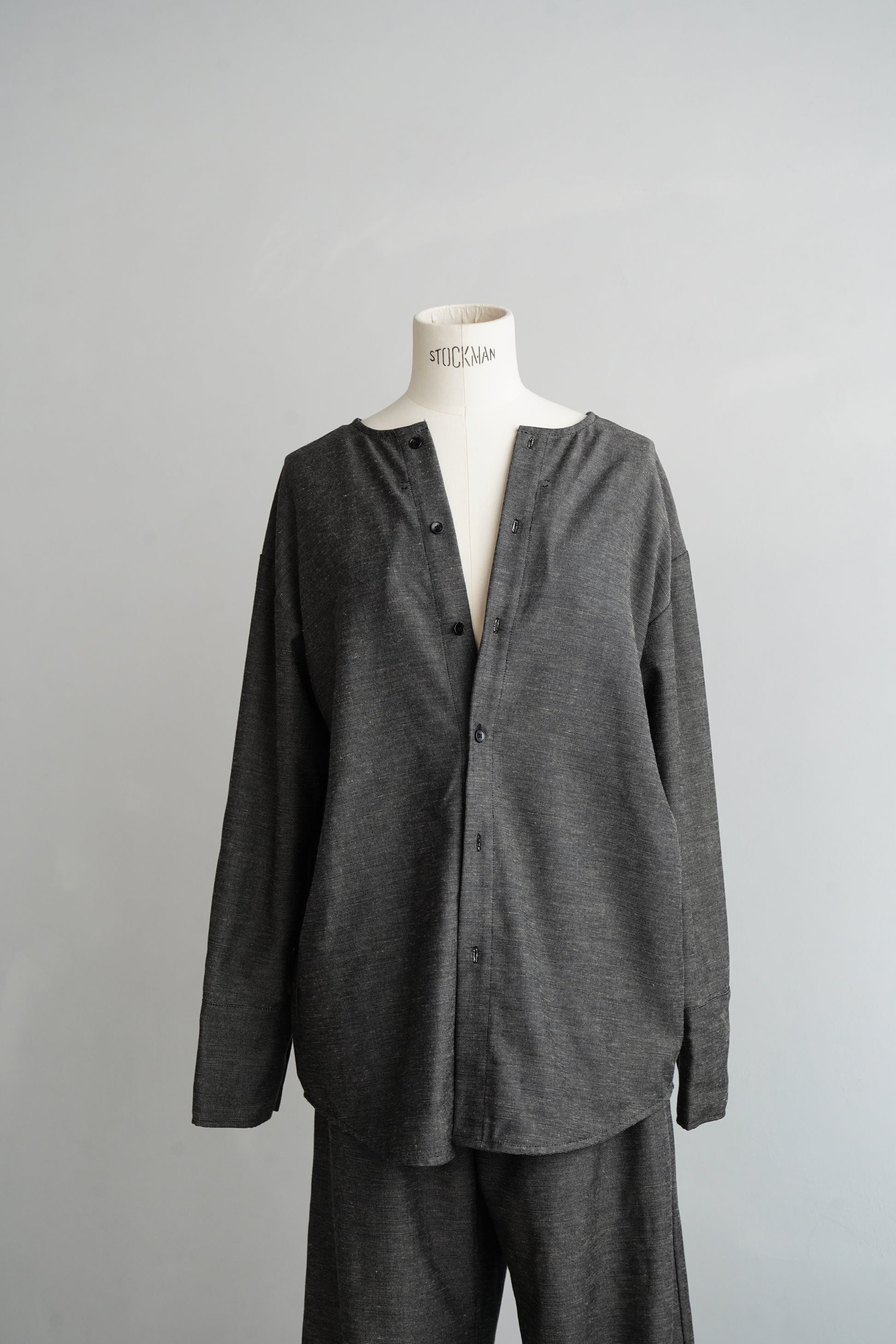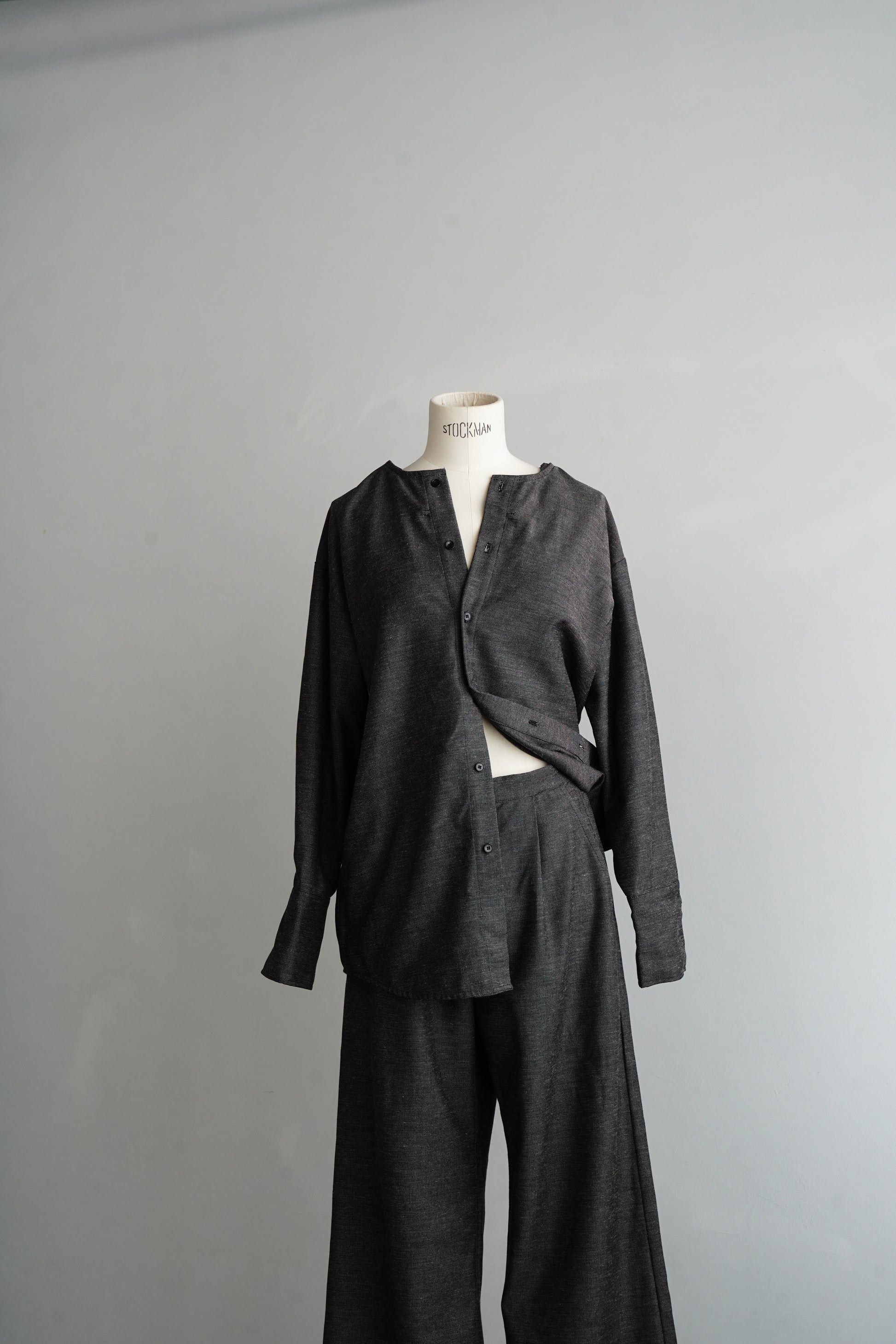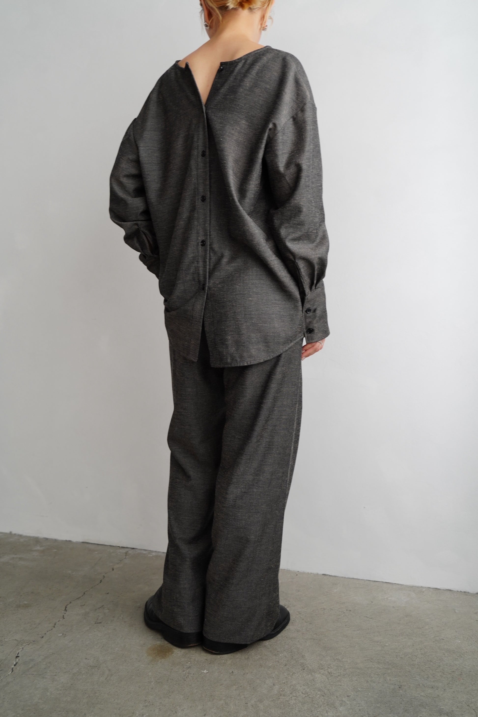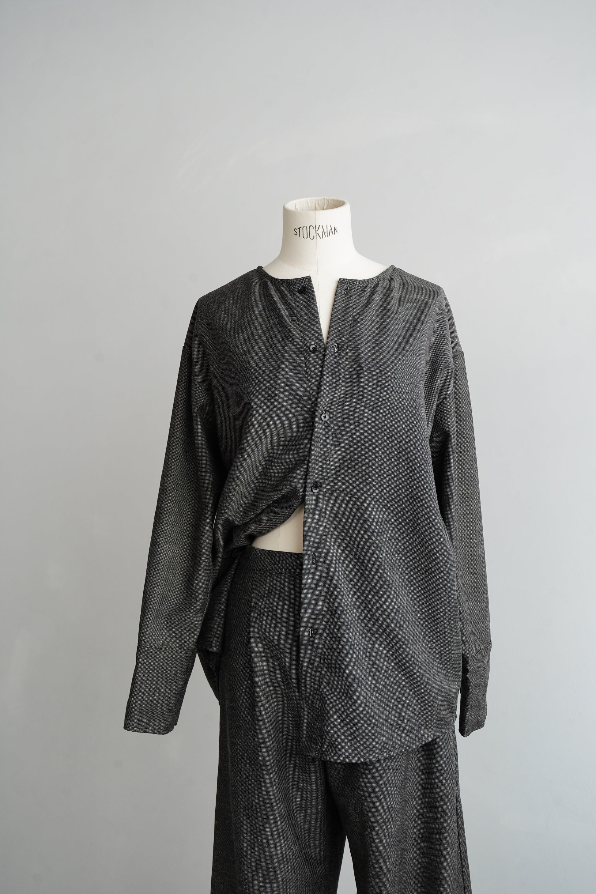 生地のさりげないネップ(糸のかたまり)が表情に奥行きを与え、グレーはネップがより目立ち、ブラックは落ち着いた印象です。