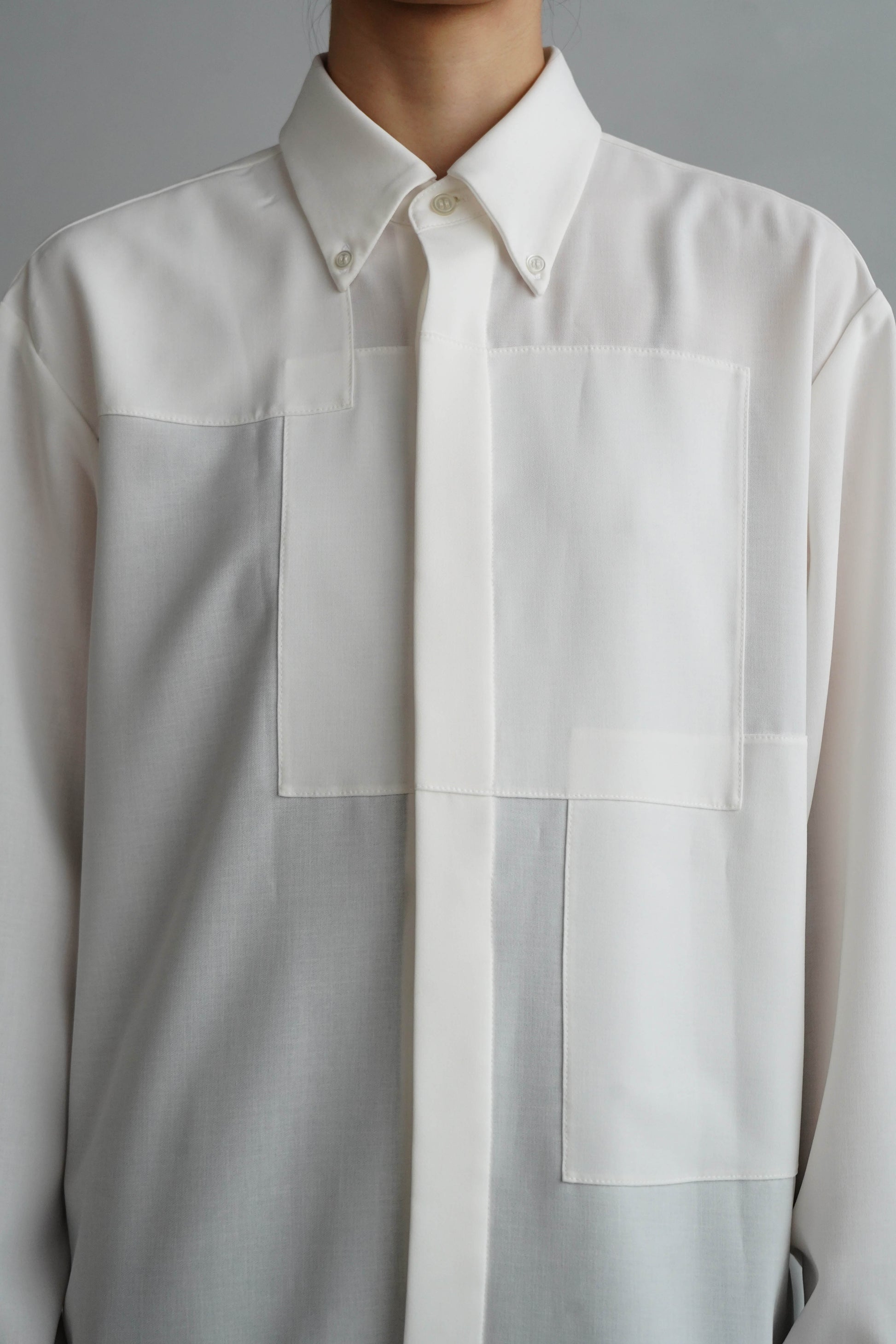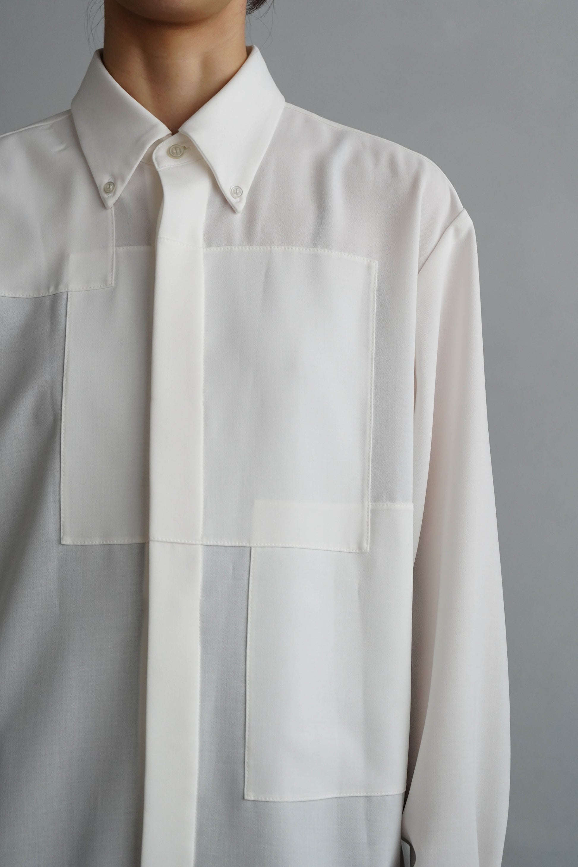 サイジングはオーバーサイズで、ゆるりと着られるリラックス感のあるシルエットに。前身頃にはパネルのように生地をレイヤードし、立体感を持たせることで、一枚でこなれた印象を演出するデザインシャツです。