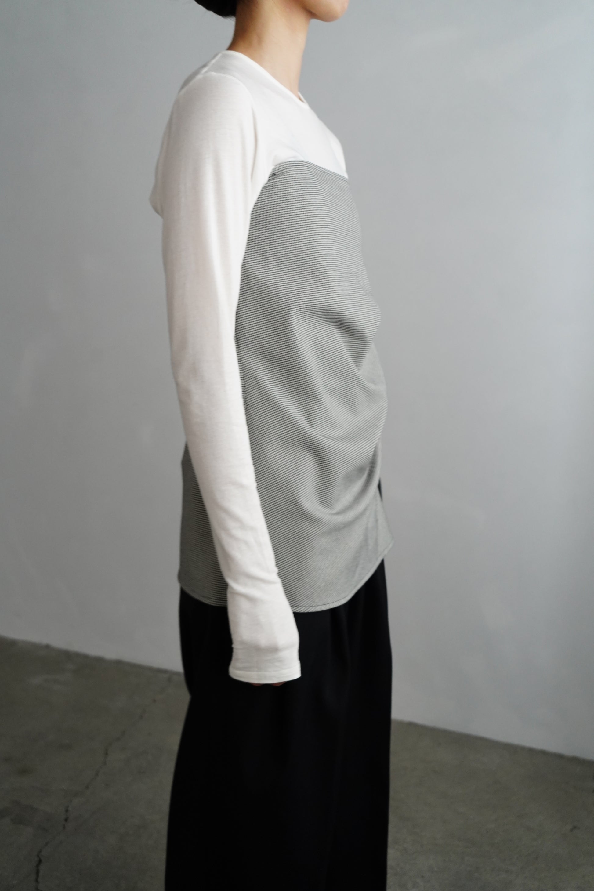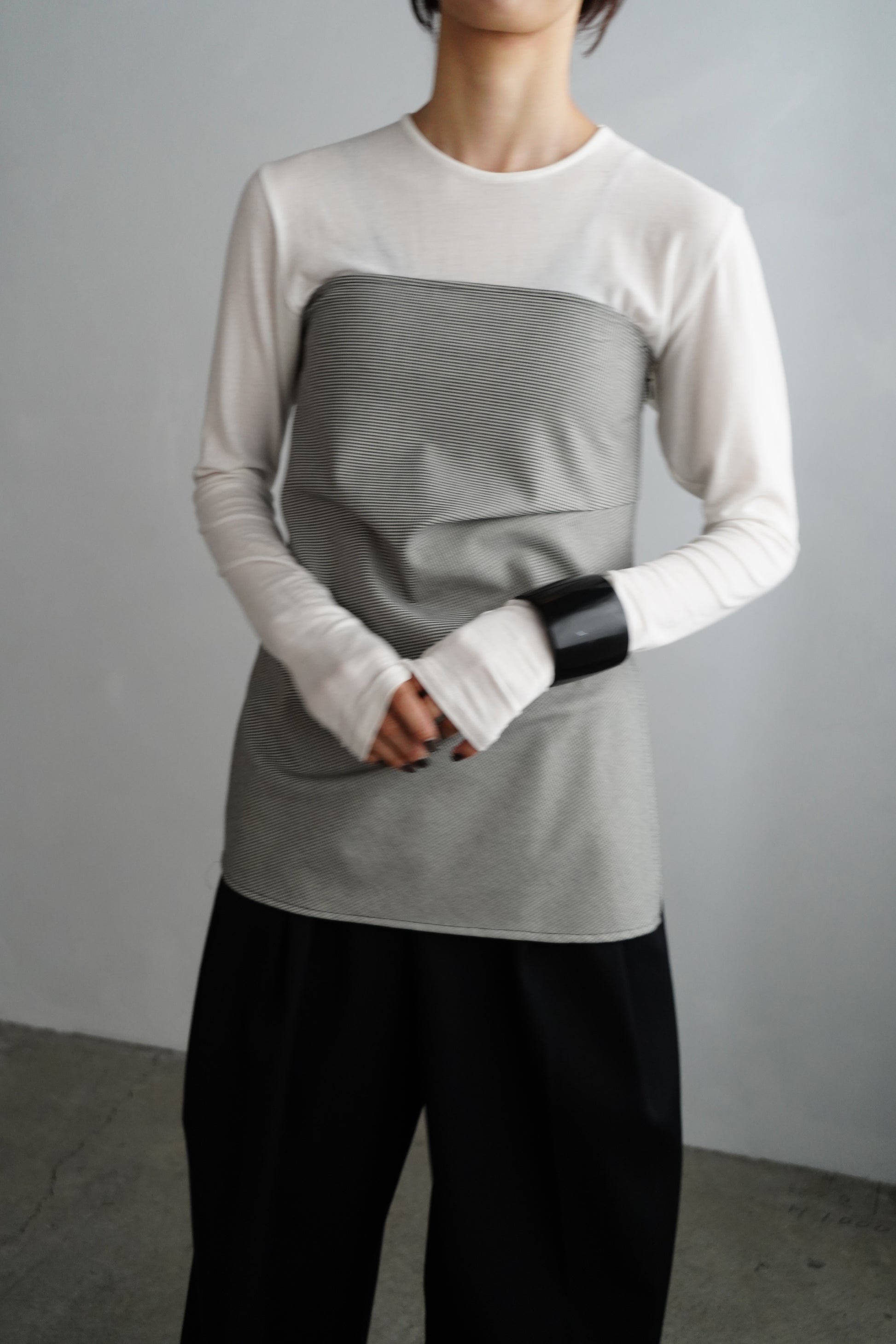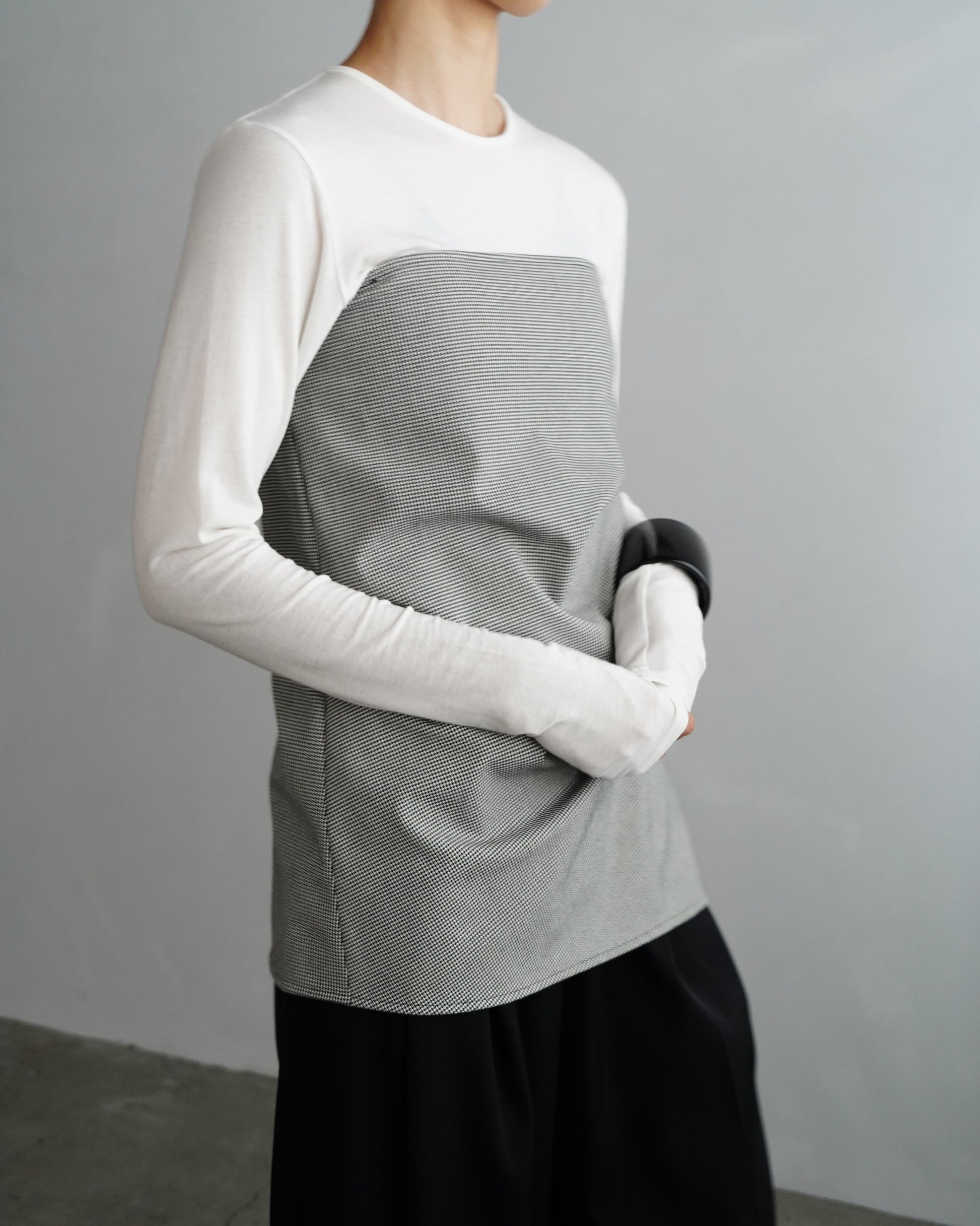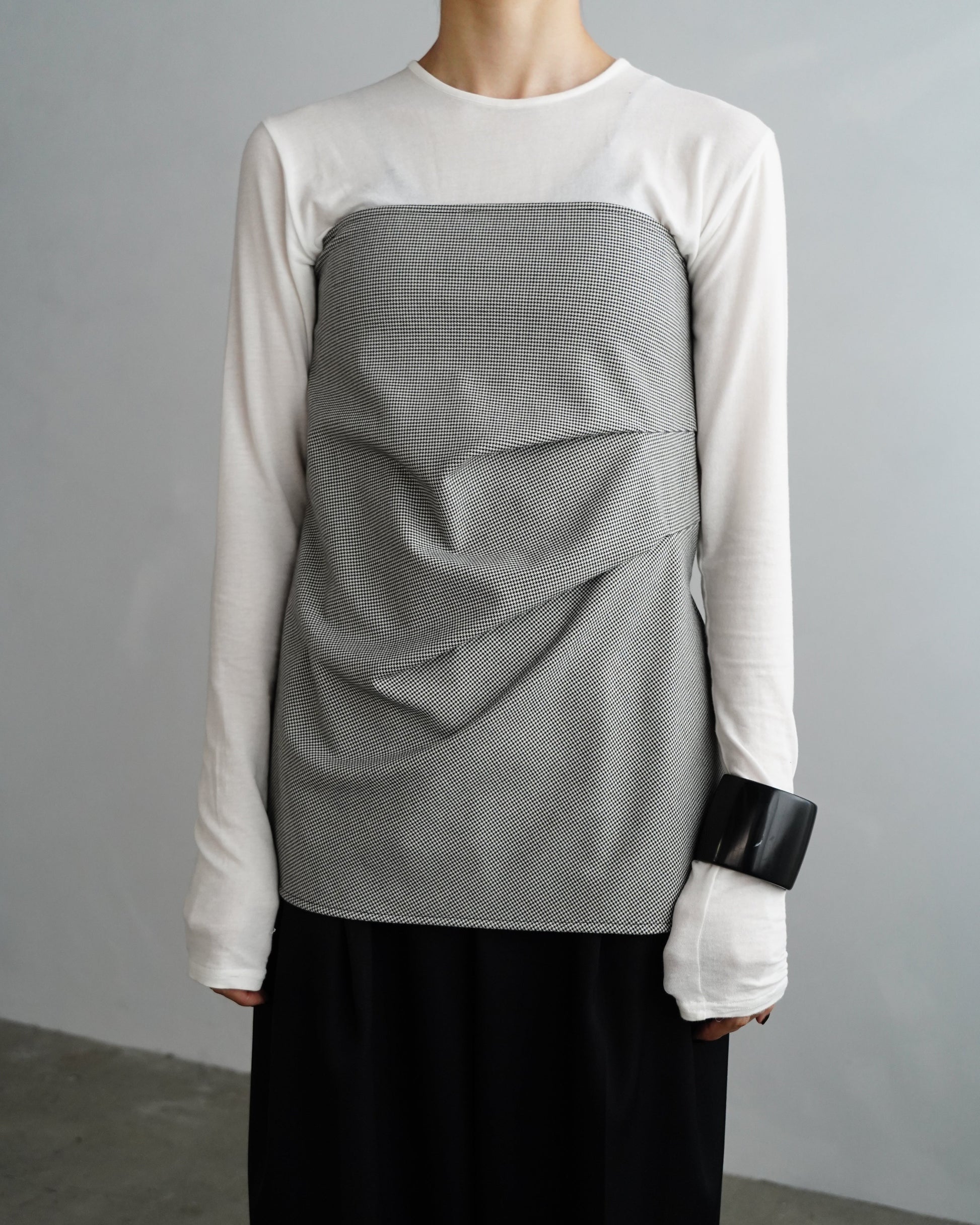 立体感のあるドレープデザインが特徴で、シンプルなカットソーやシャツの上から重ねるだけでモードなレイヤードスタイルができます。