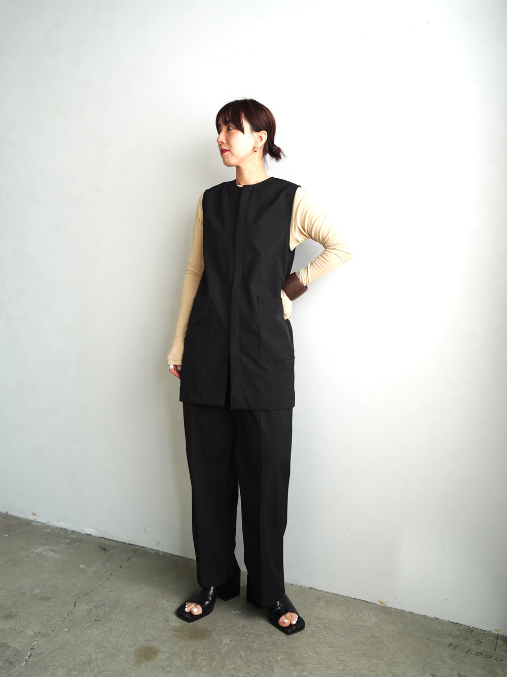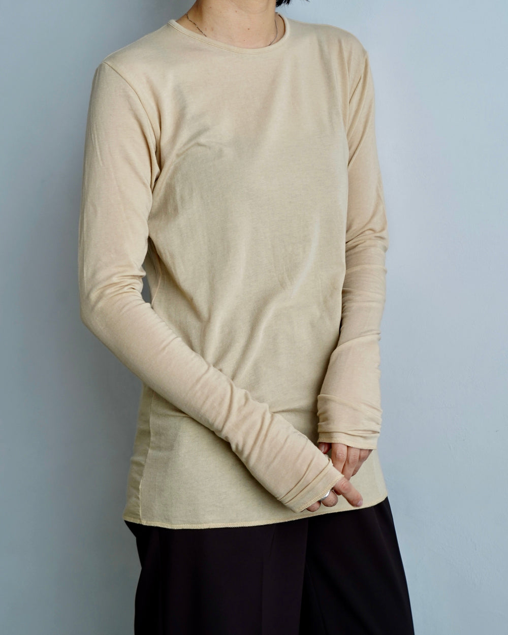 着丈と袖丈は長めに設定。アウトしてパンツと合わせてもバランスが取りやすく、生地は薄手なのでタックインしても綺麗に見えます。