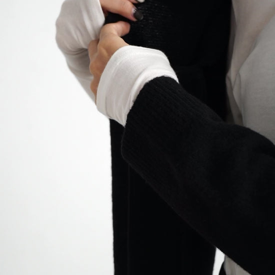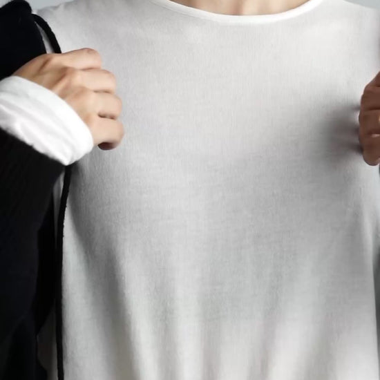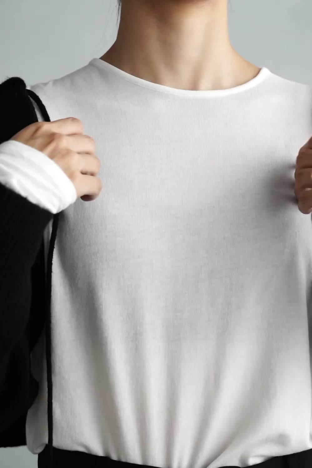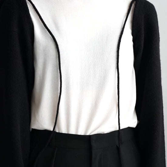 〈Powdery Pullover〉のようなシンプルなトップスの上に重ねることで、保温性が高まるとともに、スタイリングのアクセントになるアイテムです。