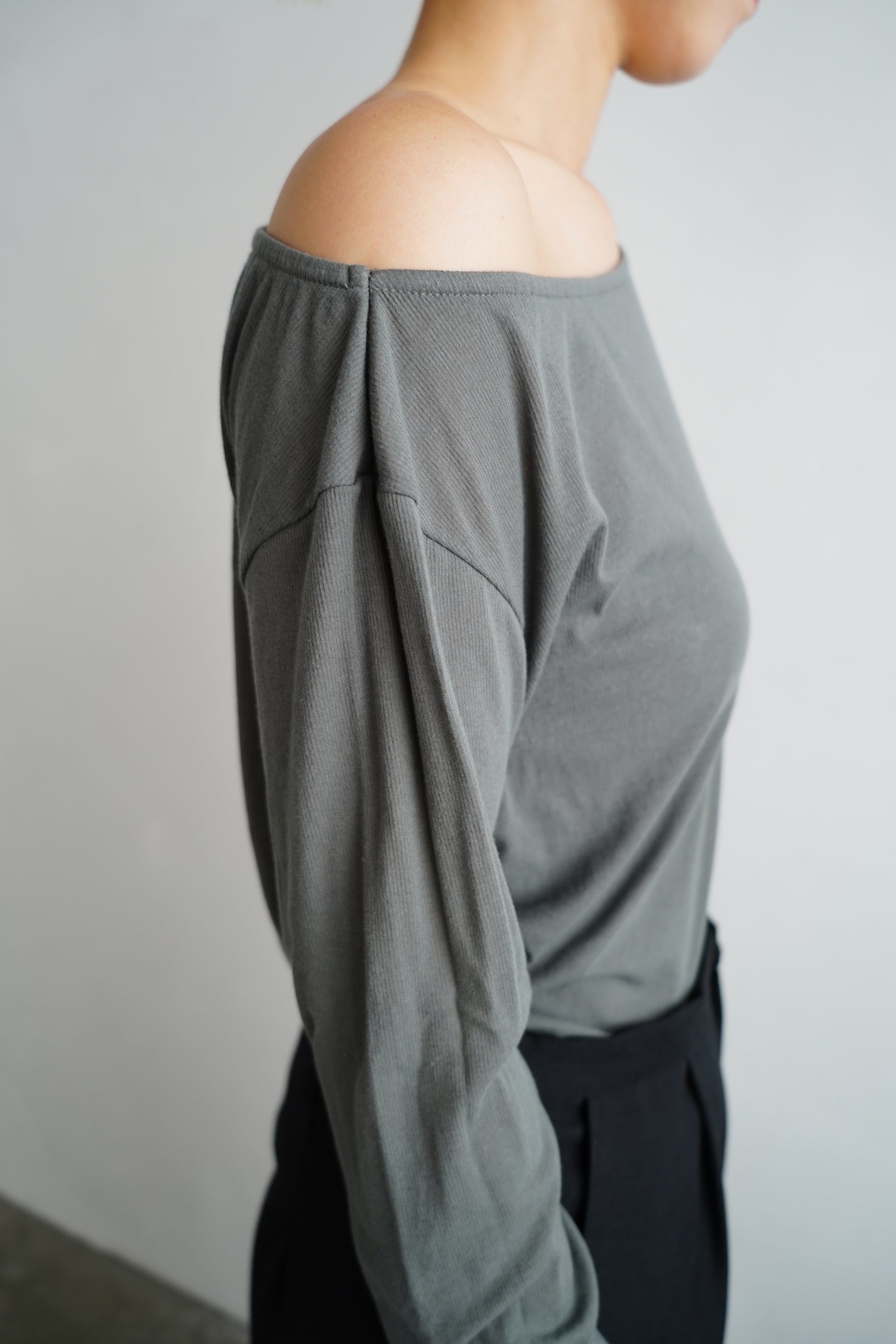 肩を落としてオフショルダーとしても、首元に沿わせてシンプルなボートネック風にも着られる2WAYトップス。