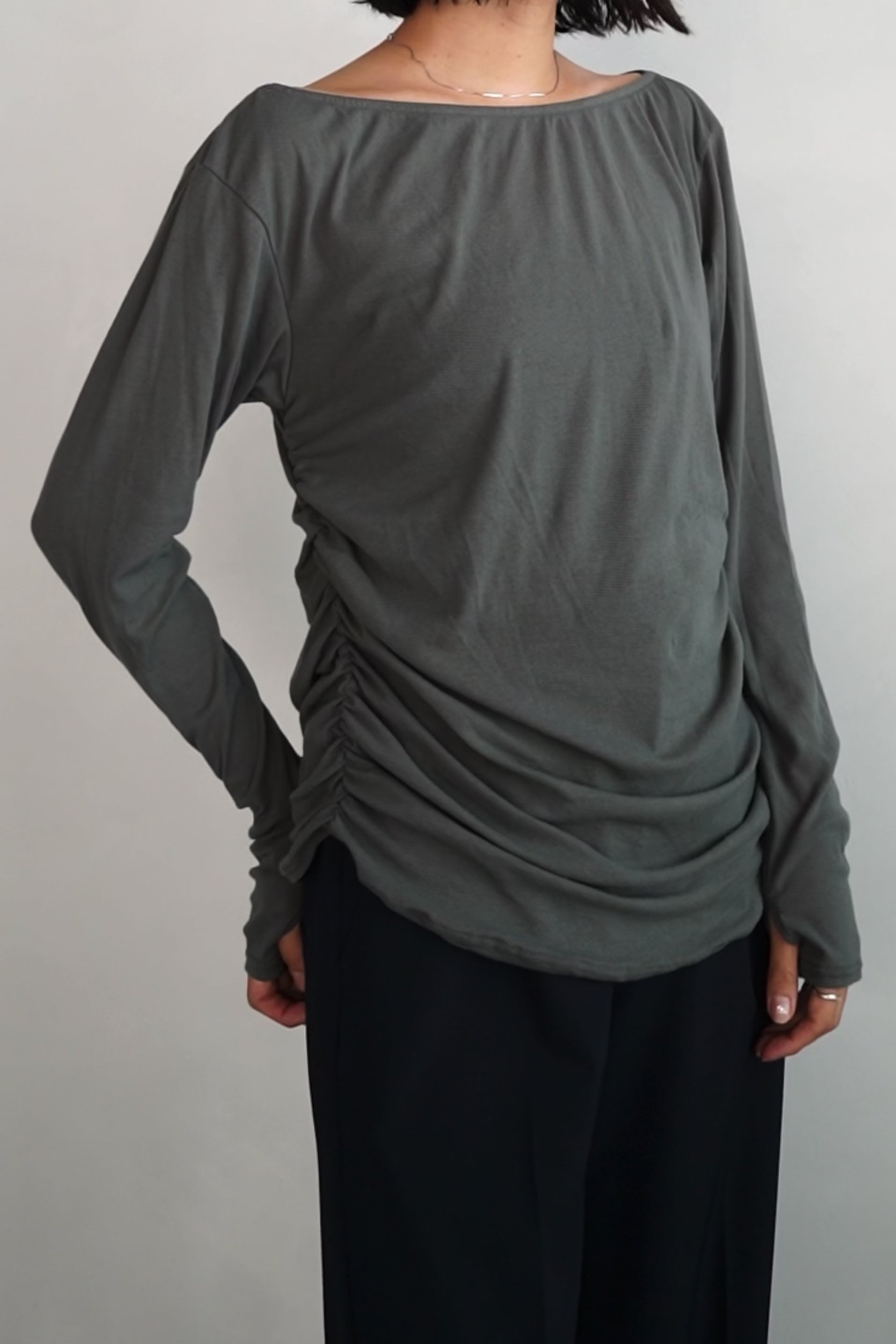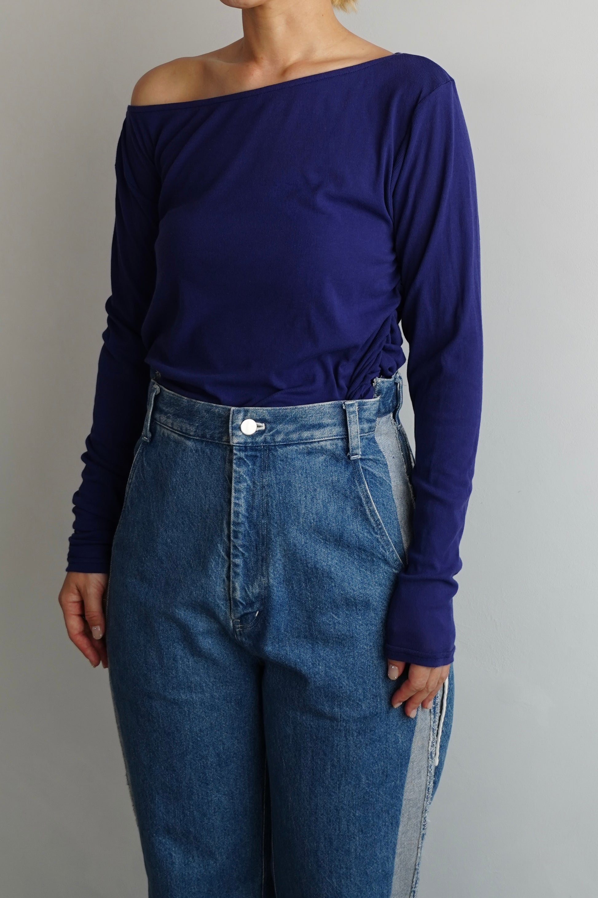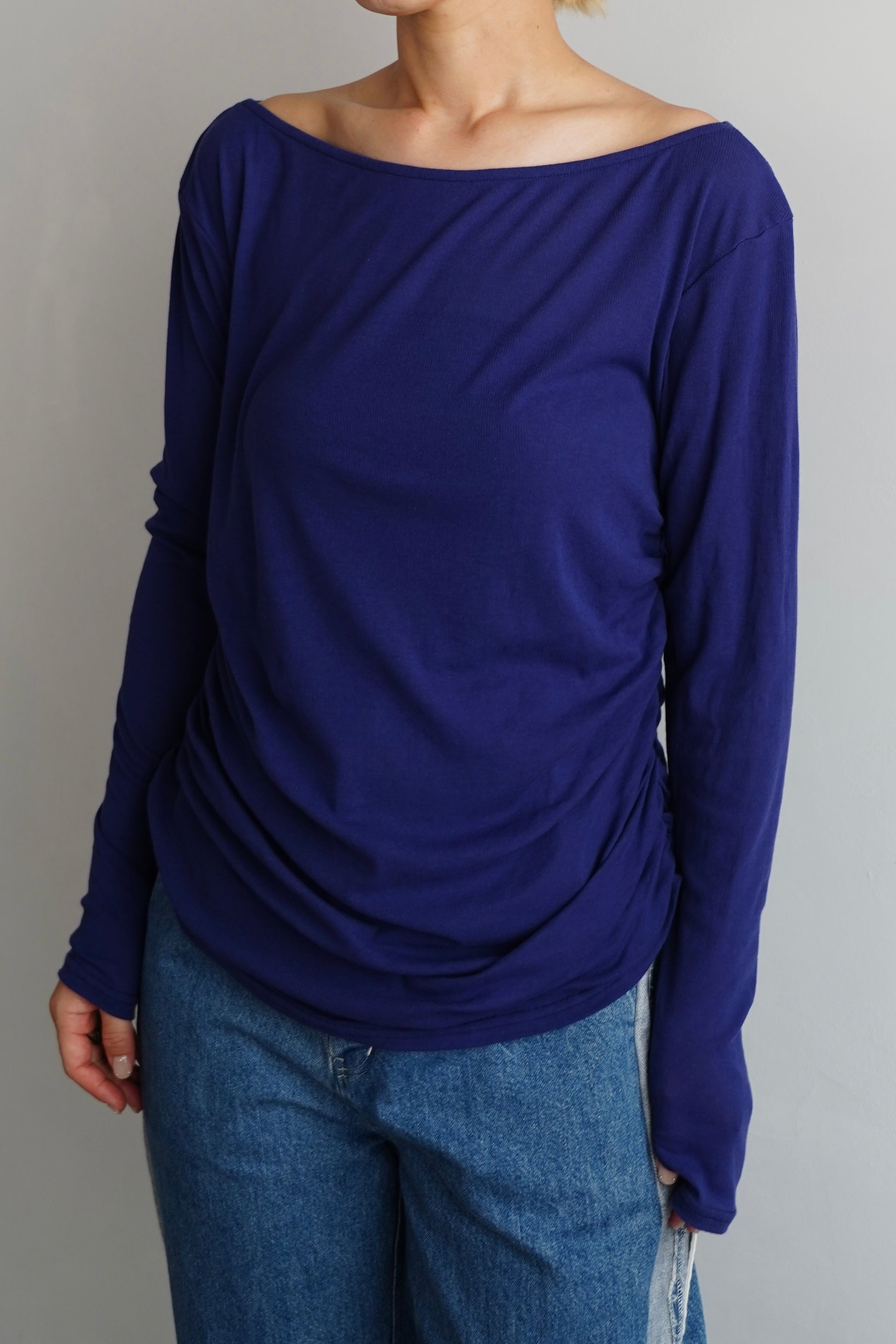肩を落としてオフショルダーとしても、首元に沿わせてシンプルなボートネック風にも着られる2WAYトップス。