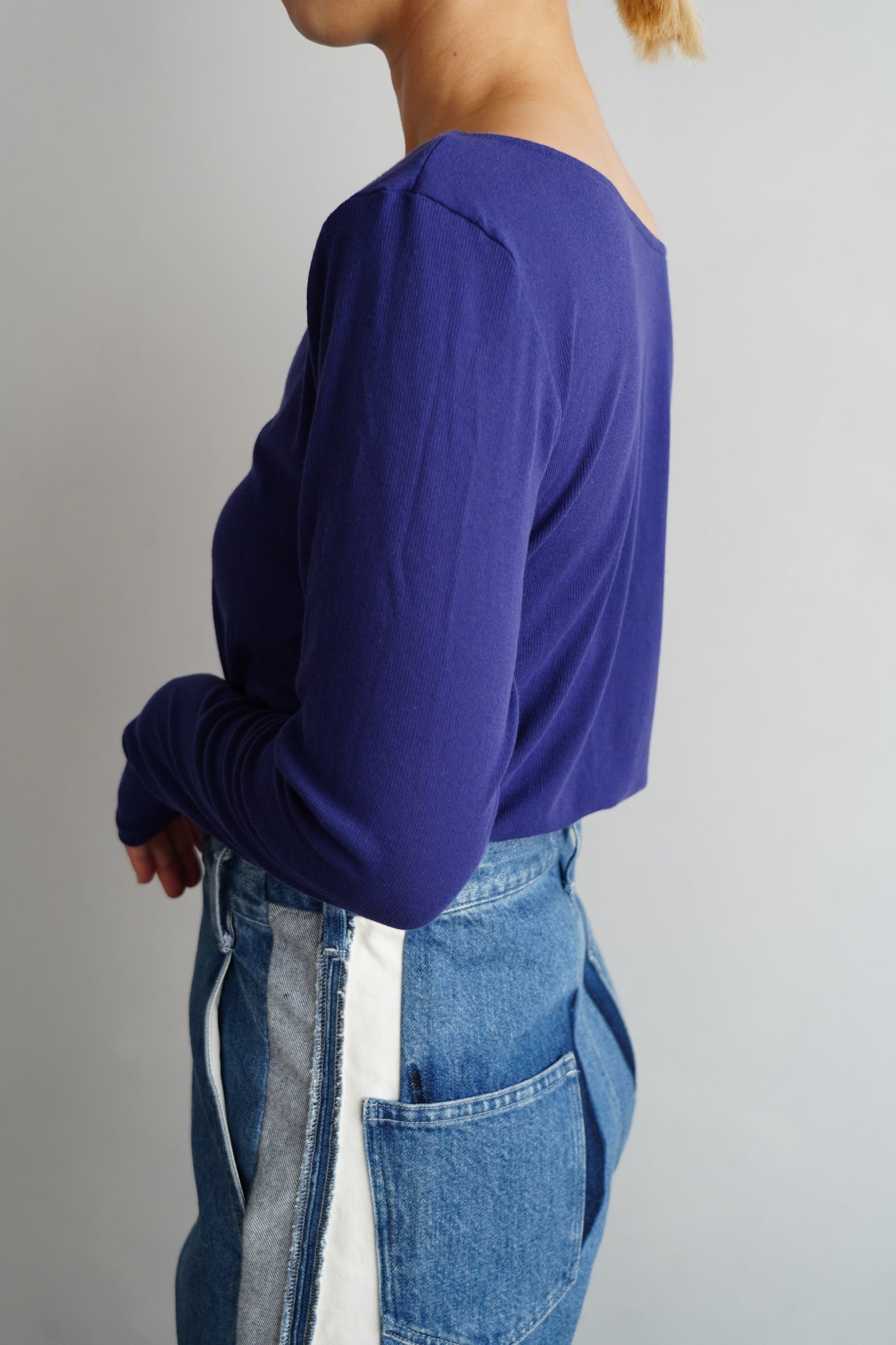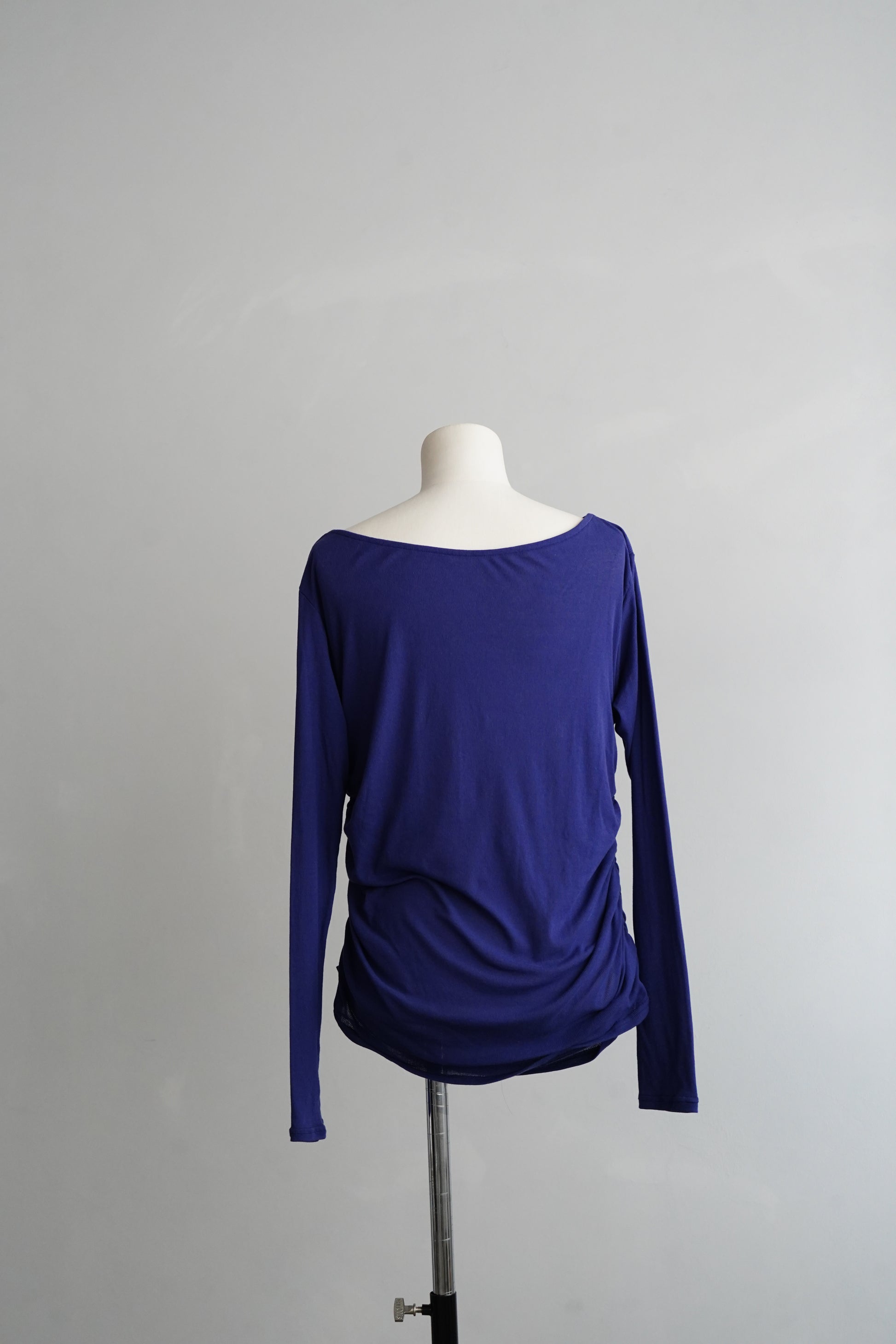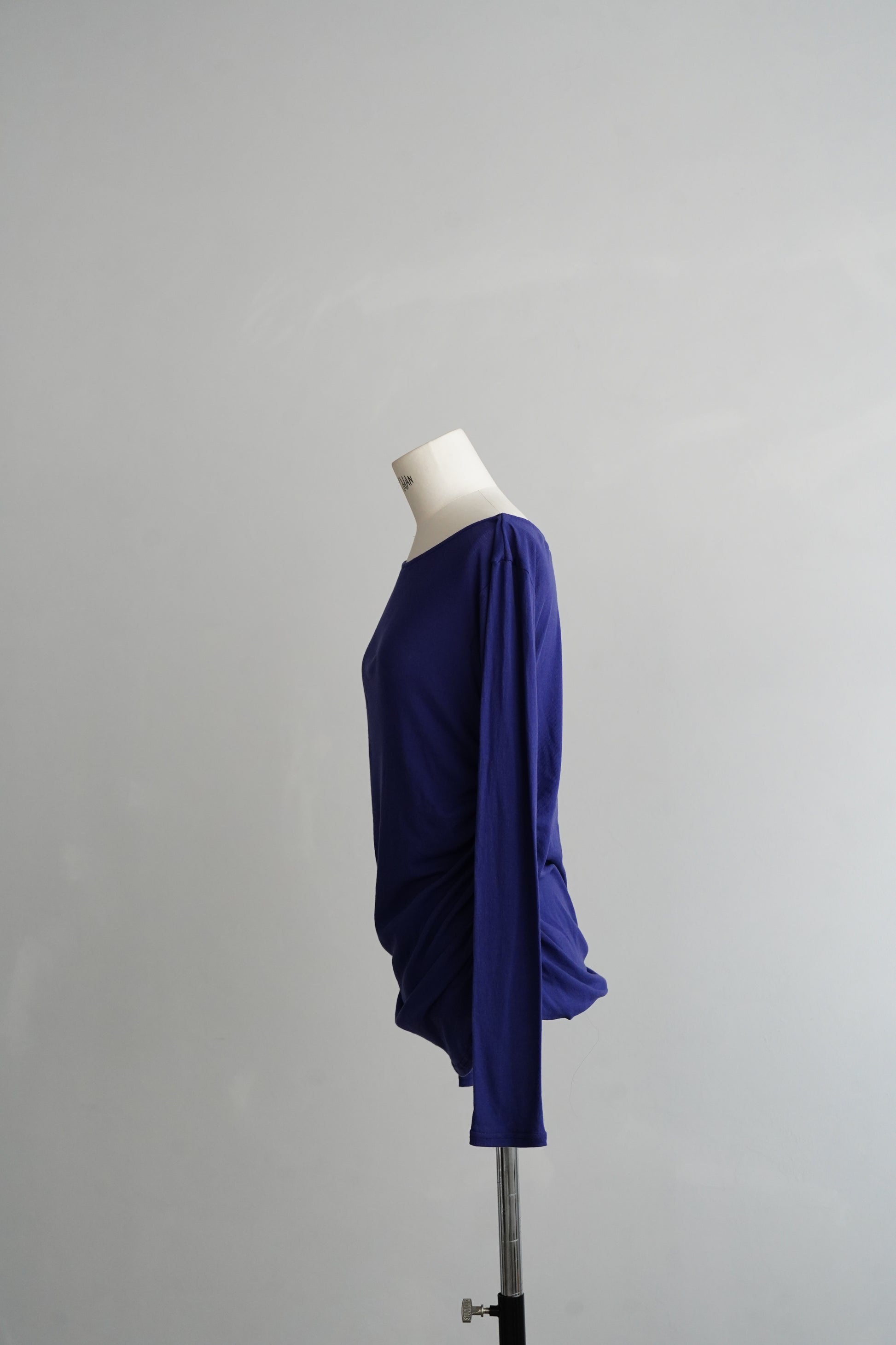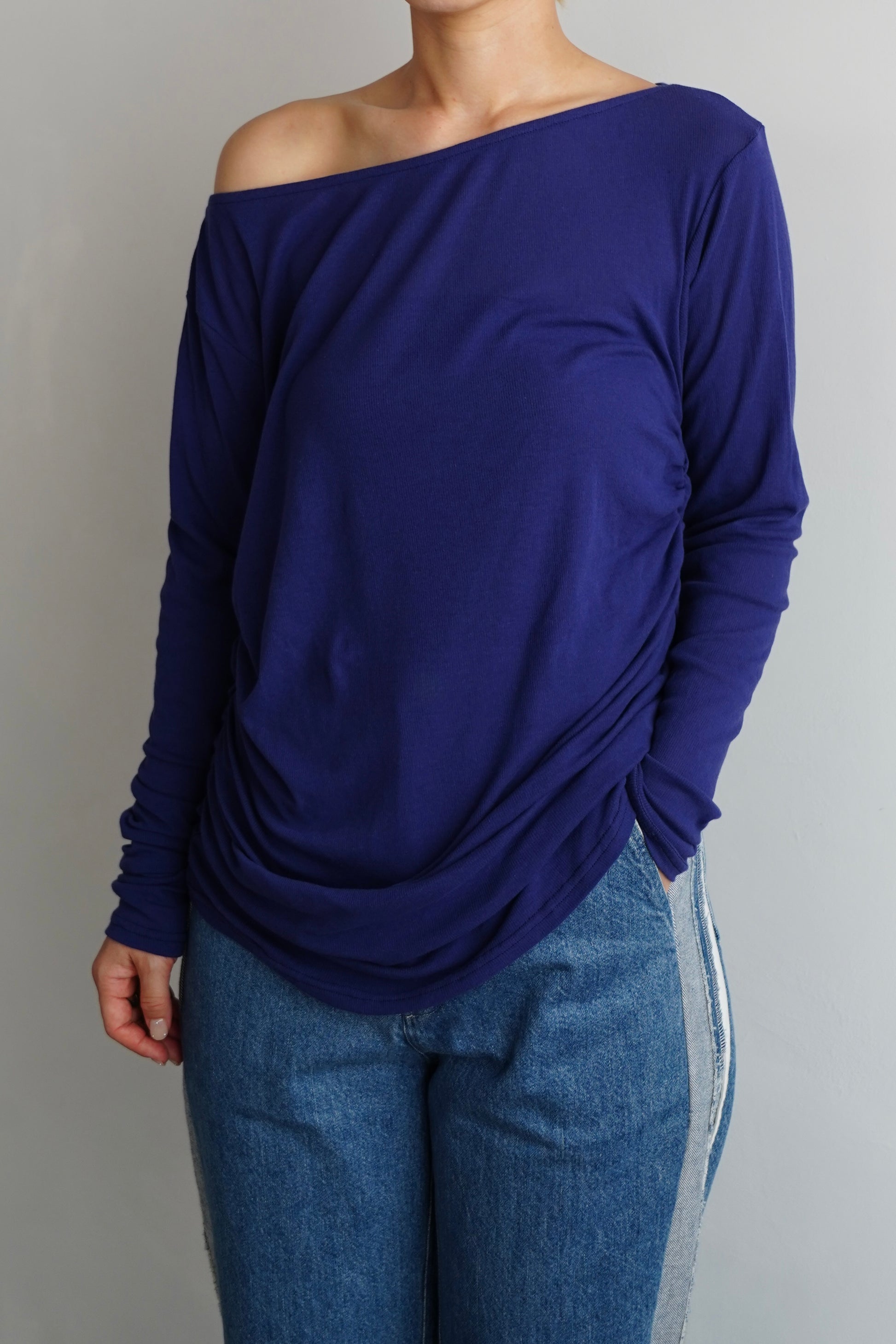 肩を落としてオフショルダーとしても、首元に沿わせてシンプルなボートネック風にも着られる2WAYトップス。