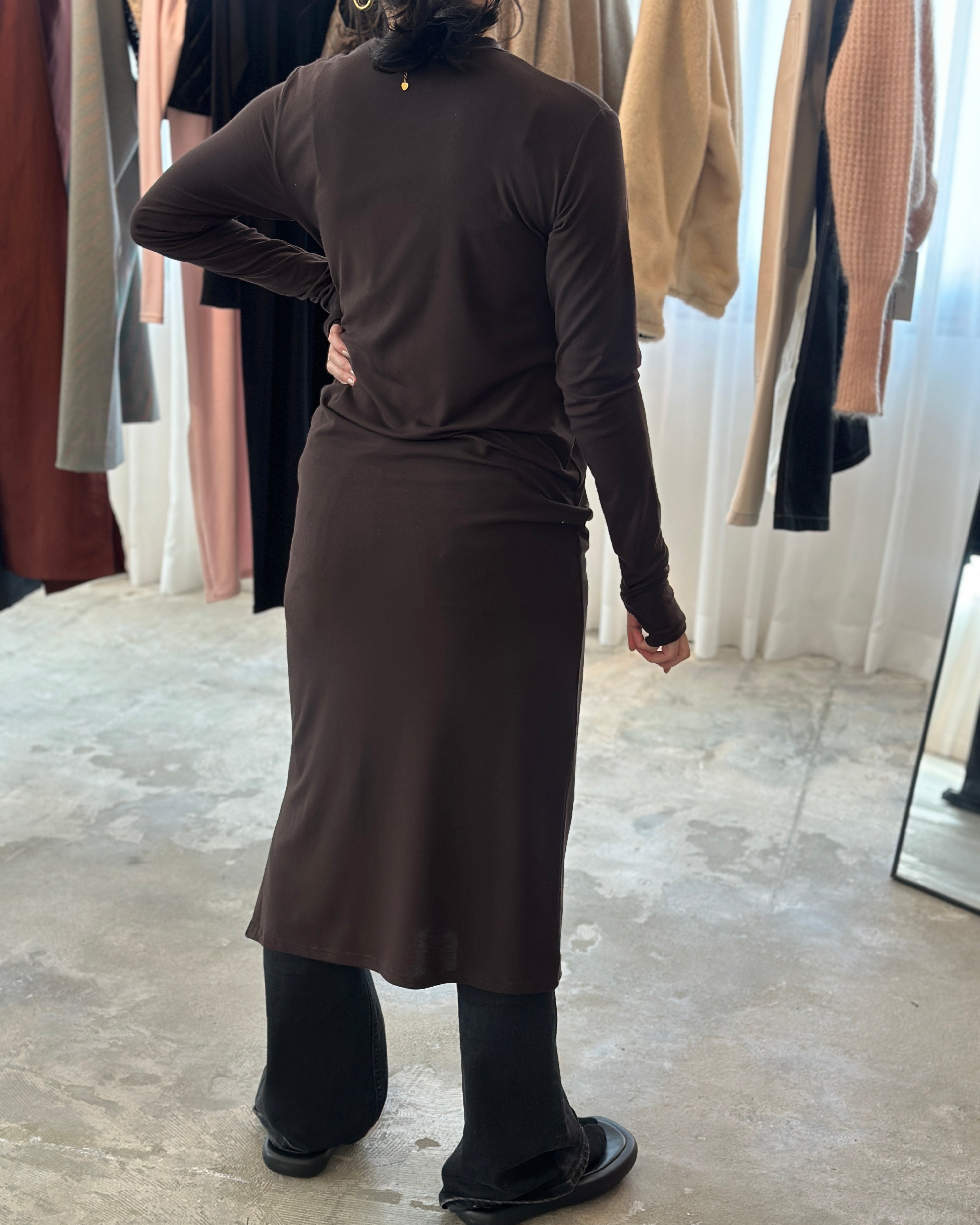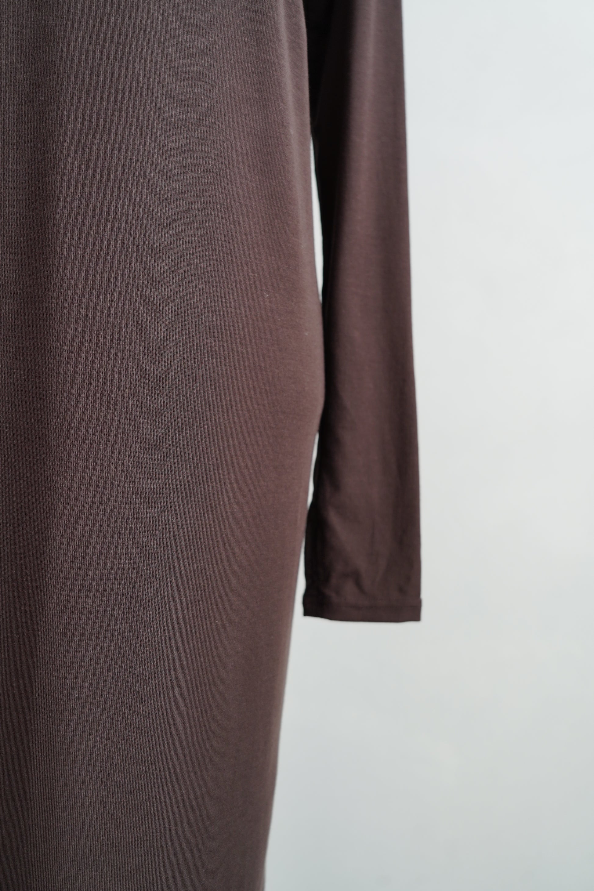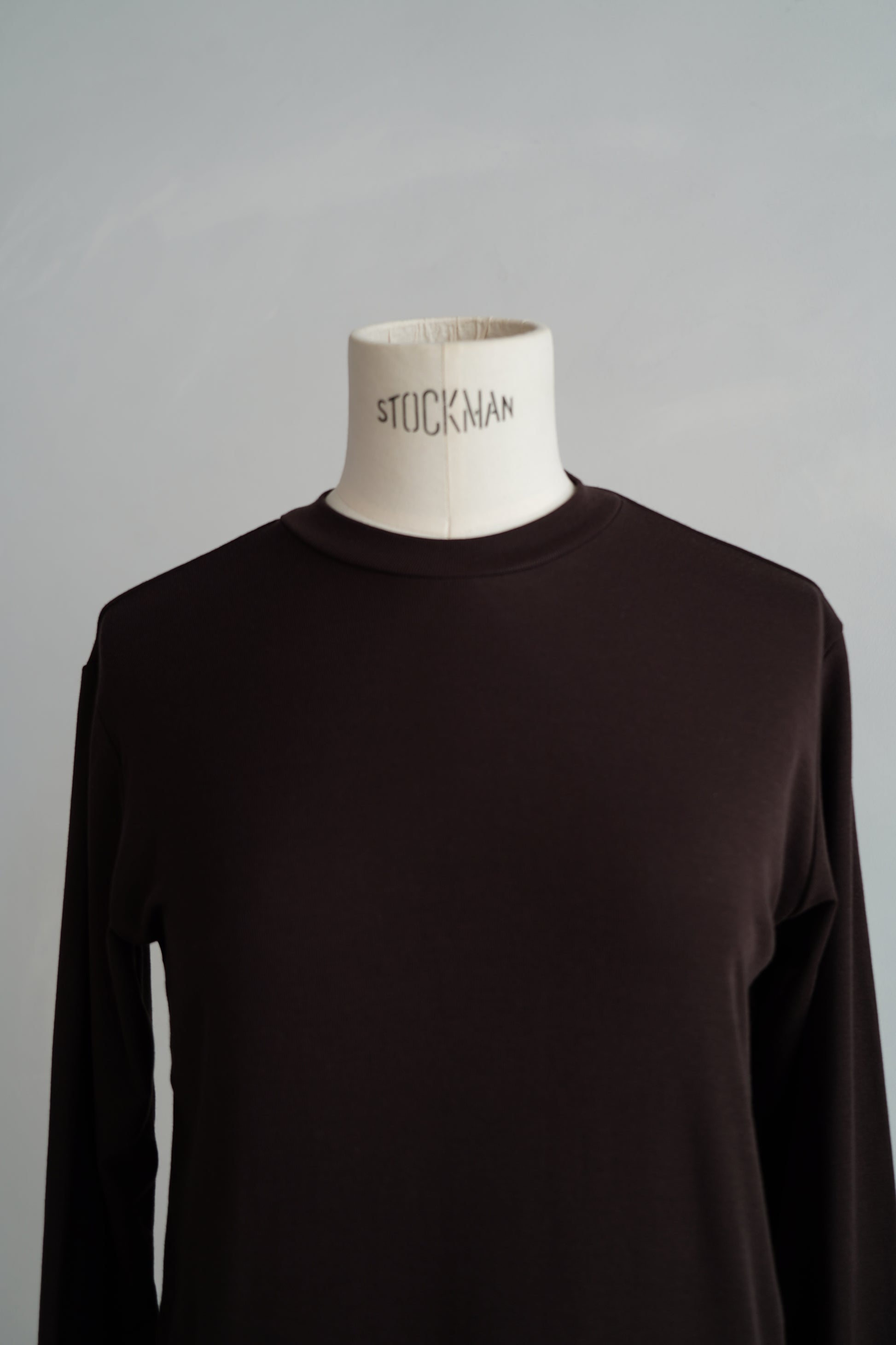 ネックラインはクルーネックとボトルネックの中間のようなデザインで、首元をすっきりと上品な印象です。シンプルながら存在感のあるスタイルを叶えます。