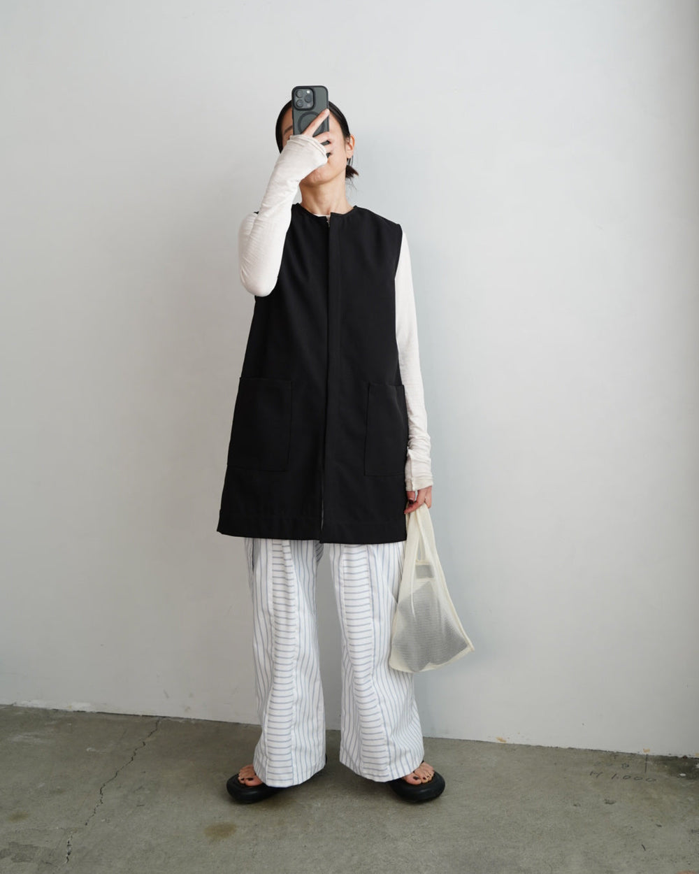 ハリのある布帛を使用し、上品な雰囲気が漂うストライプパンツ。夏にも着やすい涼しさです。