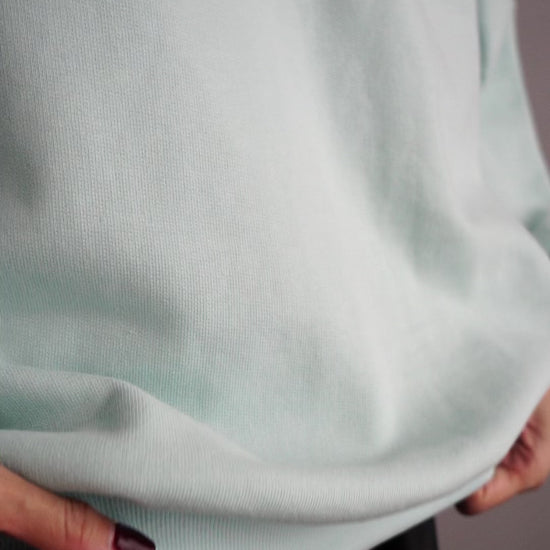 淡いミントカラーは肌のトーンを柔らかく見せるだけでなく、冬の装いに軽やかさを添えてくれる一枚。