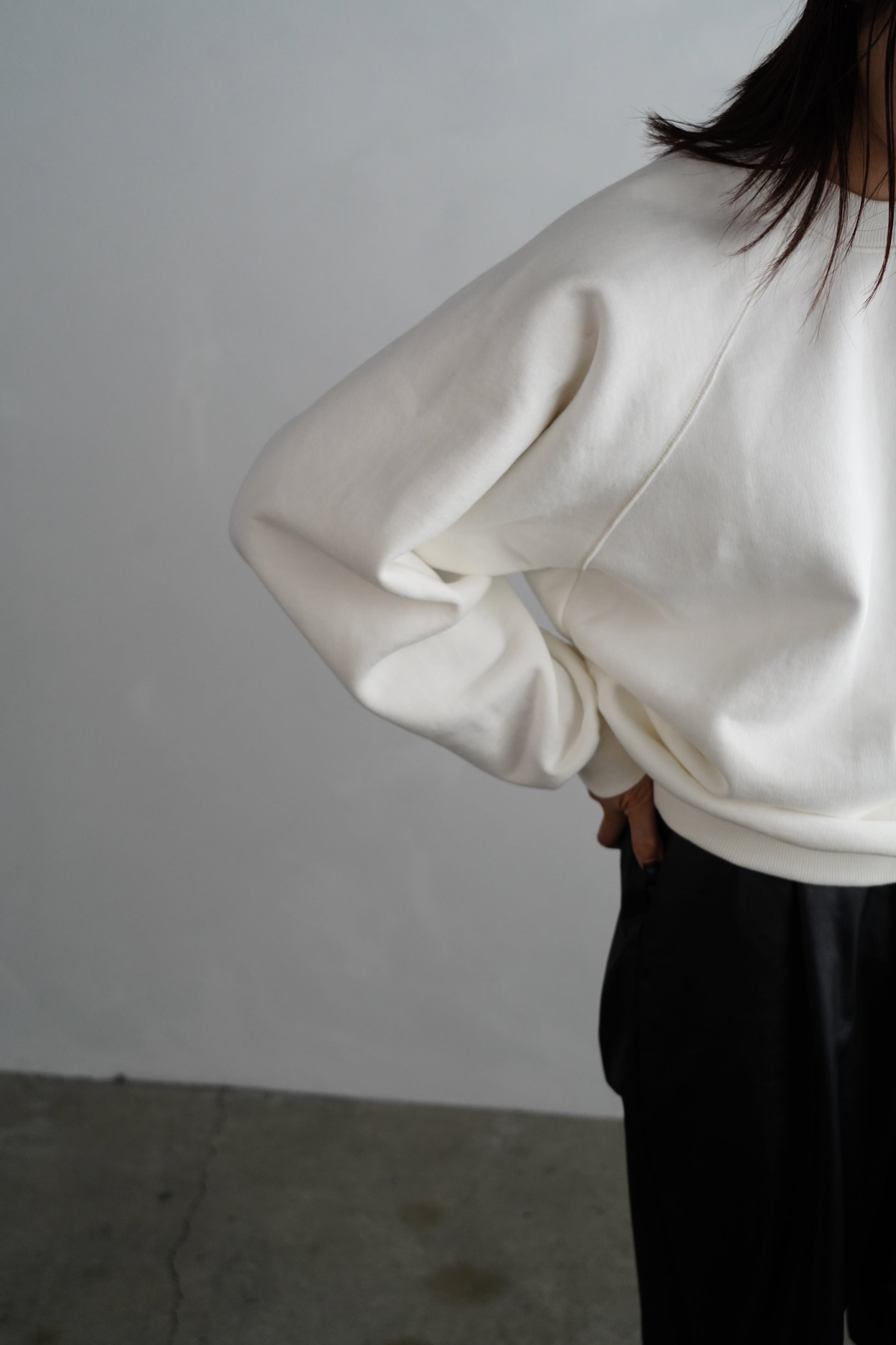 ベーシックなシルエットでありながら、ラグランスリーブ特有のしなやかな肩のラインが、カジュアルになりすぎない上品さをプラス。