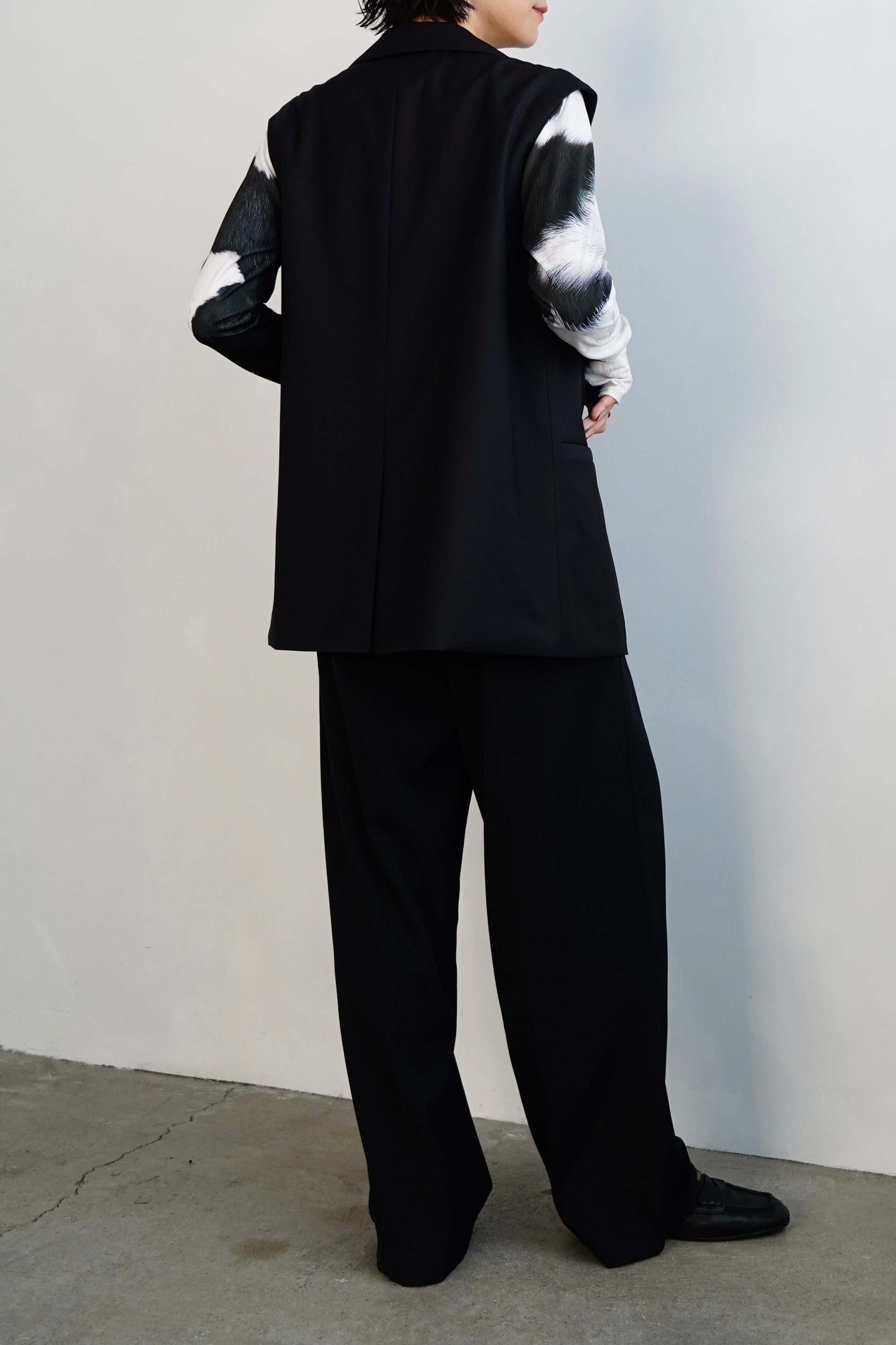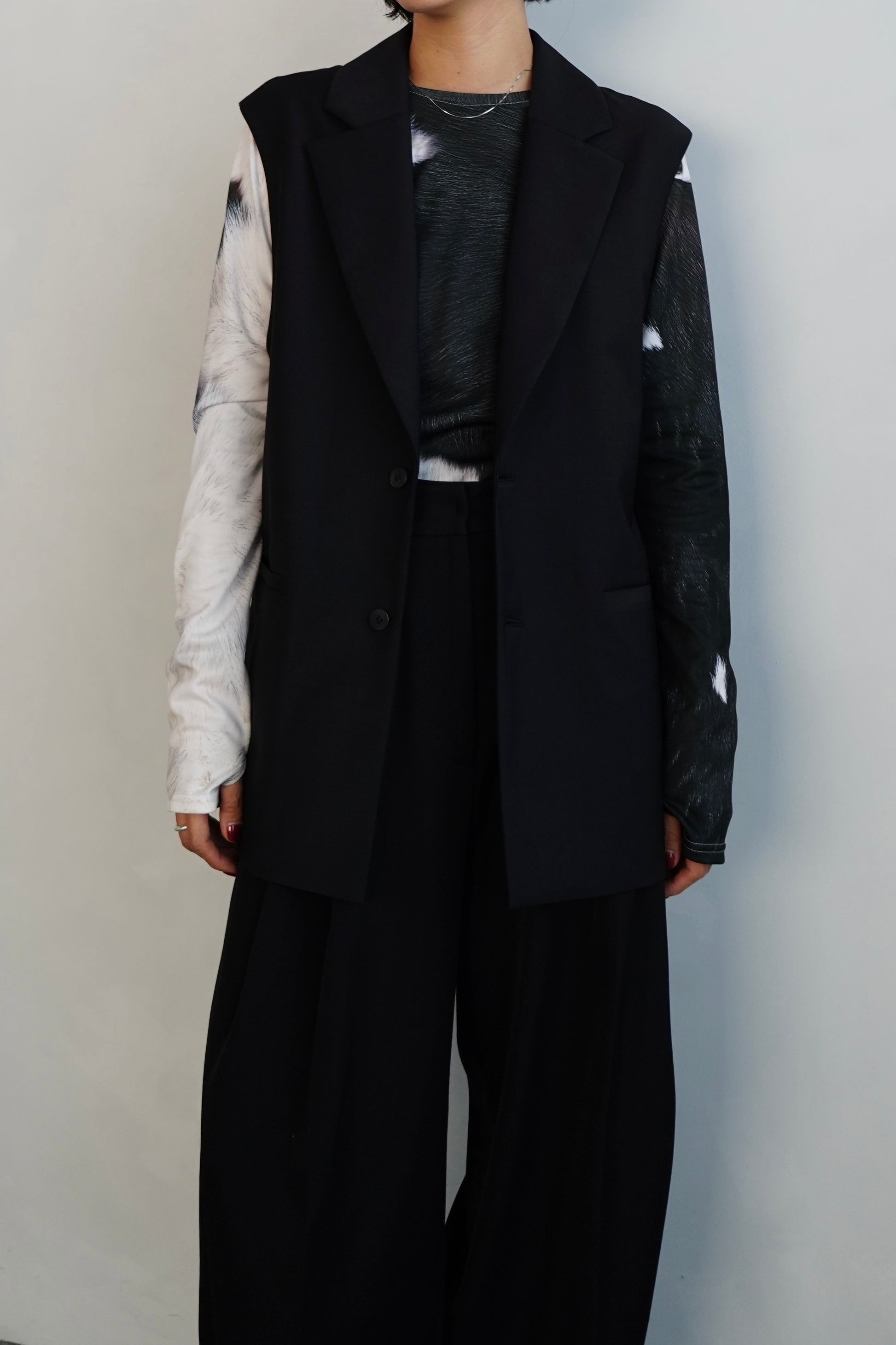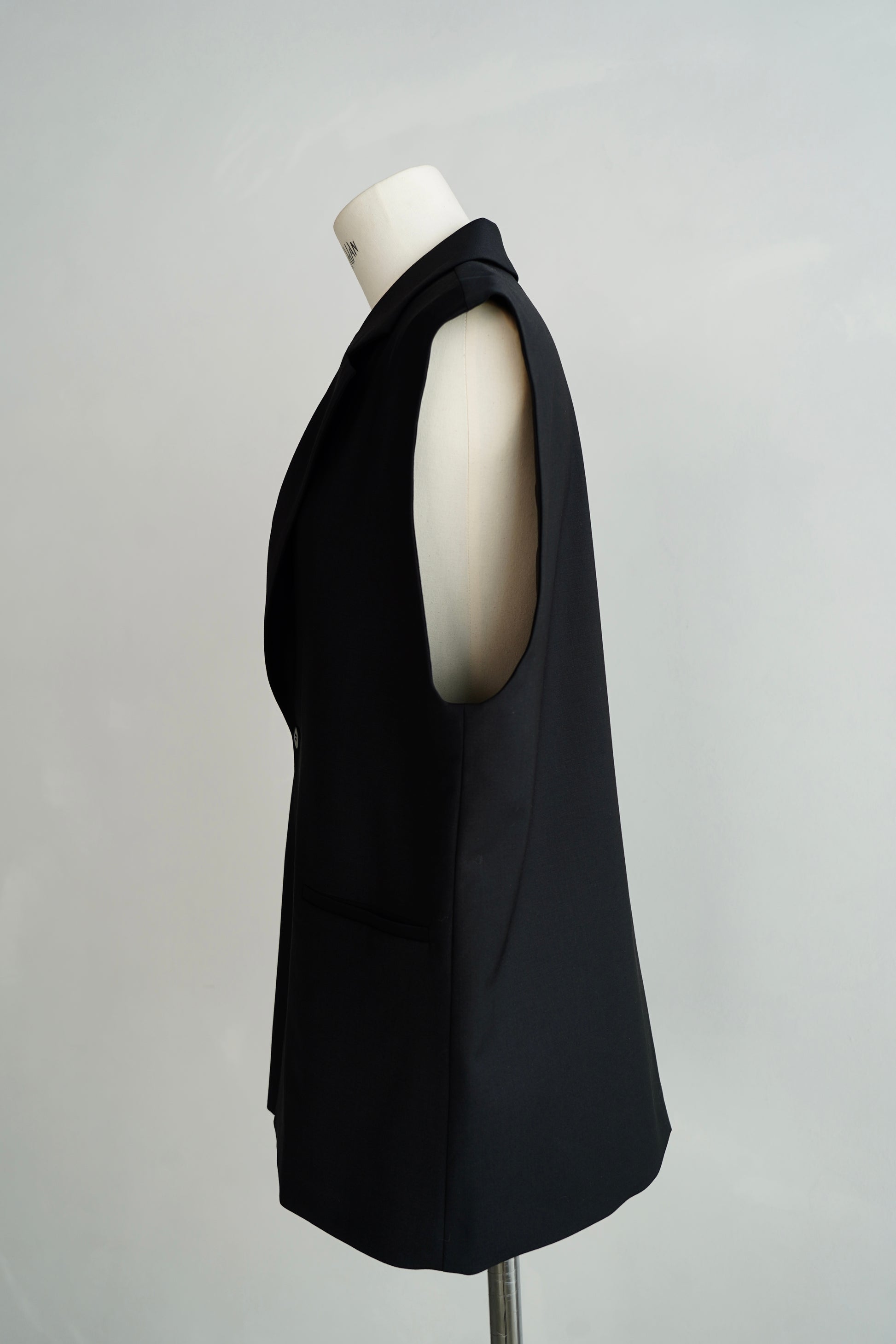 シンプルなスタイルにアクセントを入れたく、テーラードベストをつくりました。ウール混紡素材を使用し、高級感のある佇まいです。