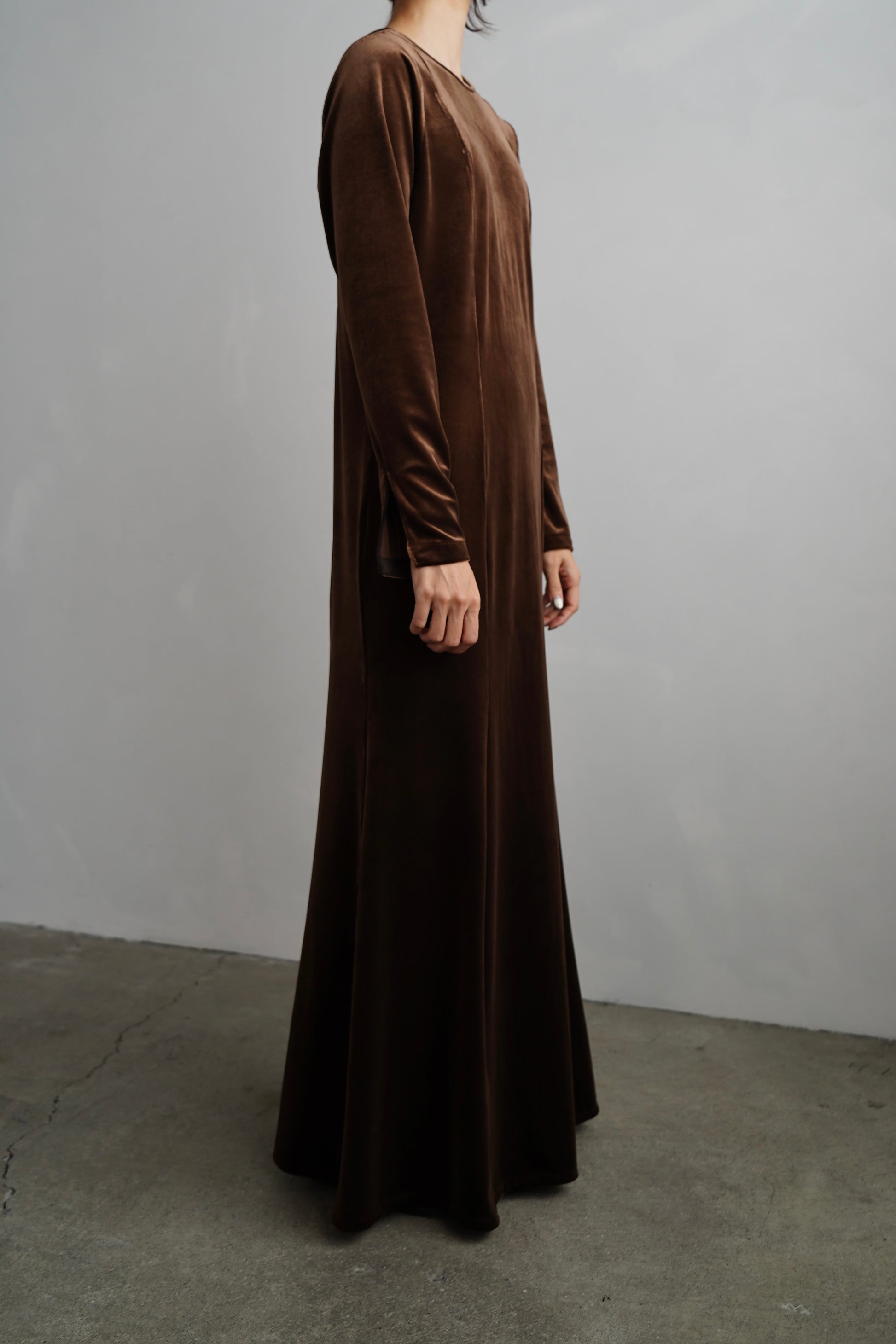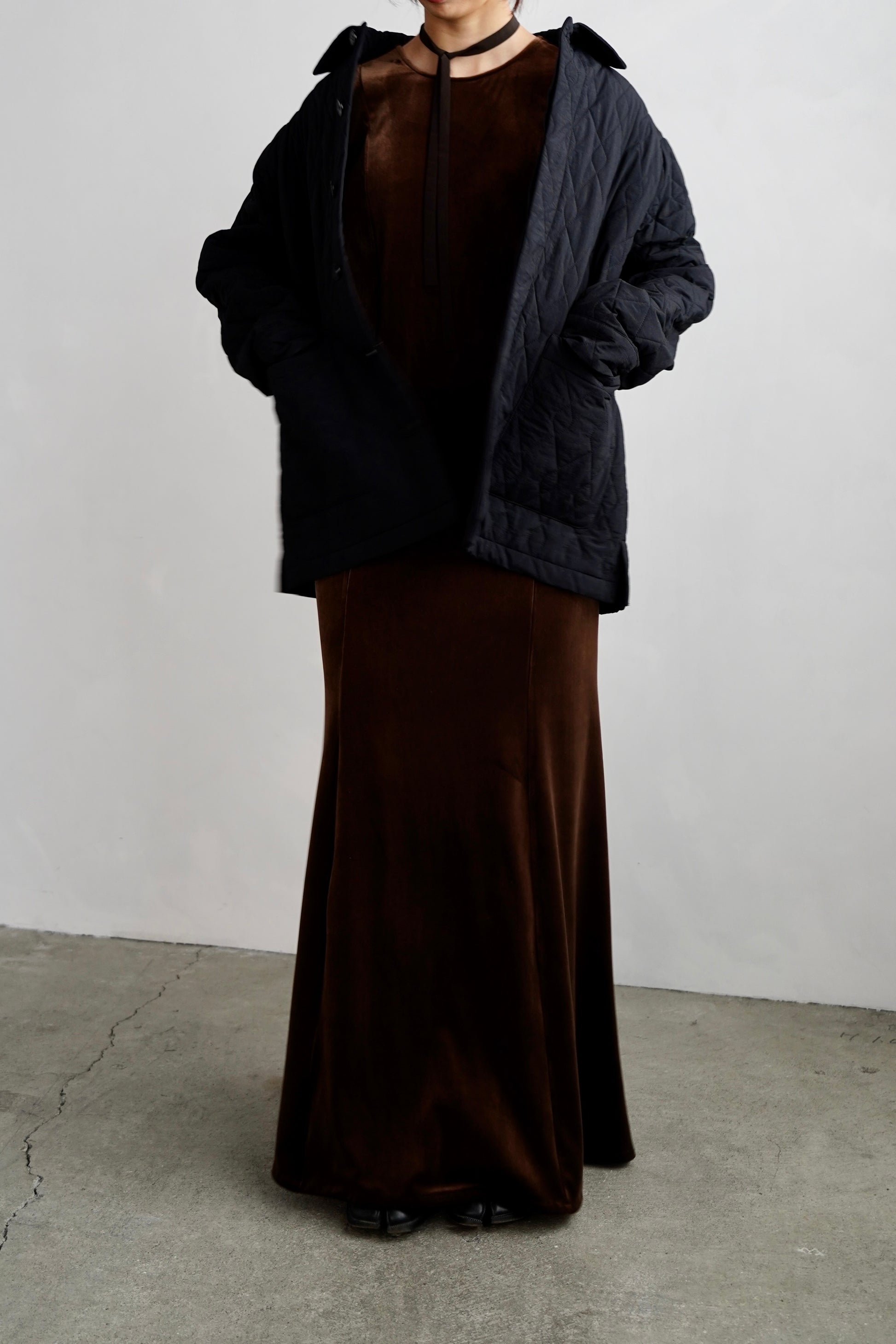 程よく背中に開きを作り、女性らしいシルエットにまとめたベロア素材のドレスを作りました。