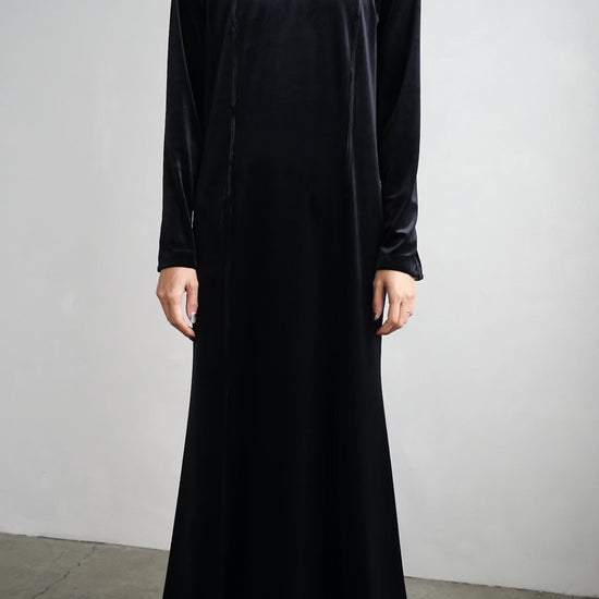 程よく背中に開きを作り、女性らしいシルエットにまとめたベロア素材のドレスを作りました。