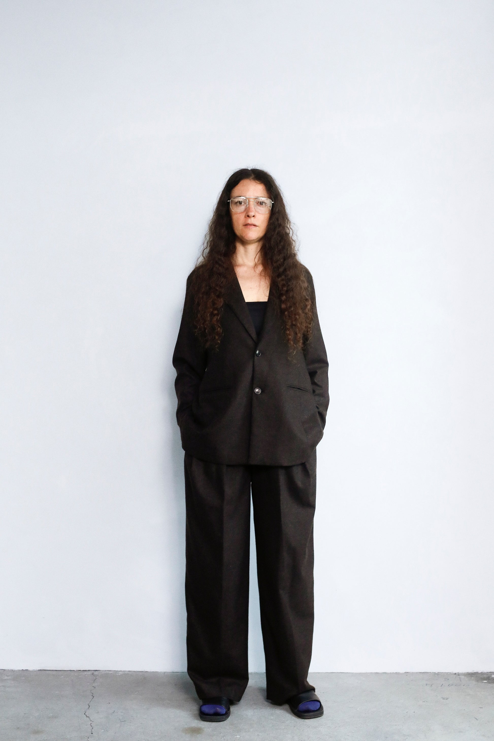 リサイクルウールにカシミヤをブレンドした生地で制作したワイドパンツ。